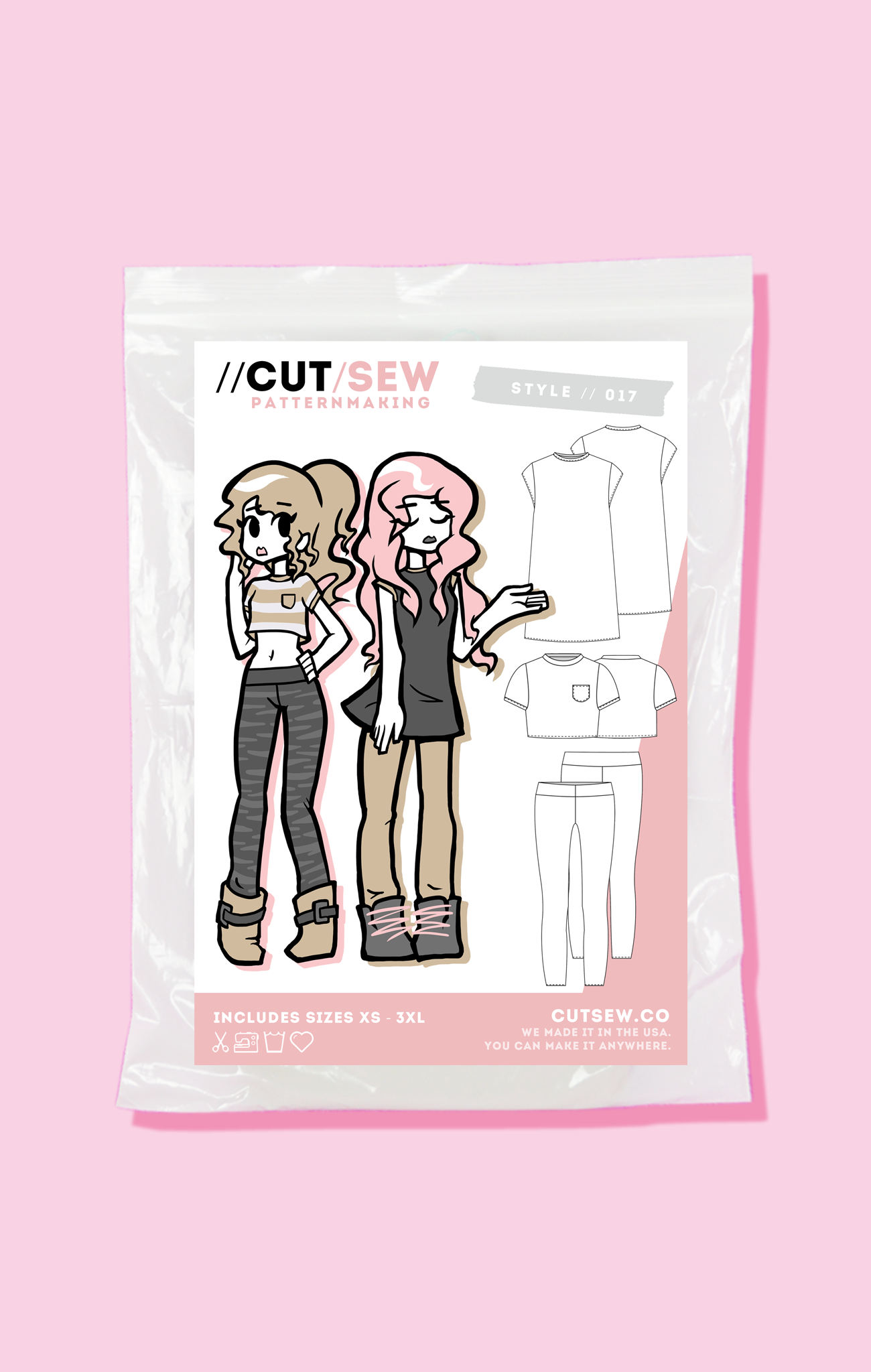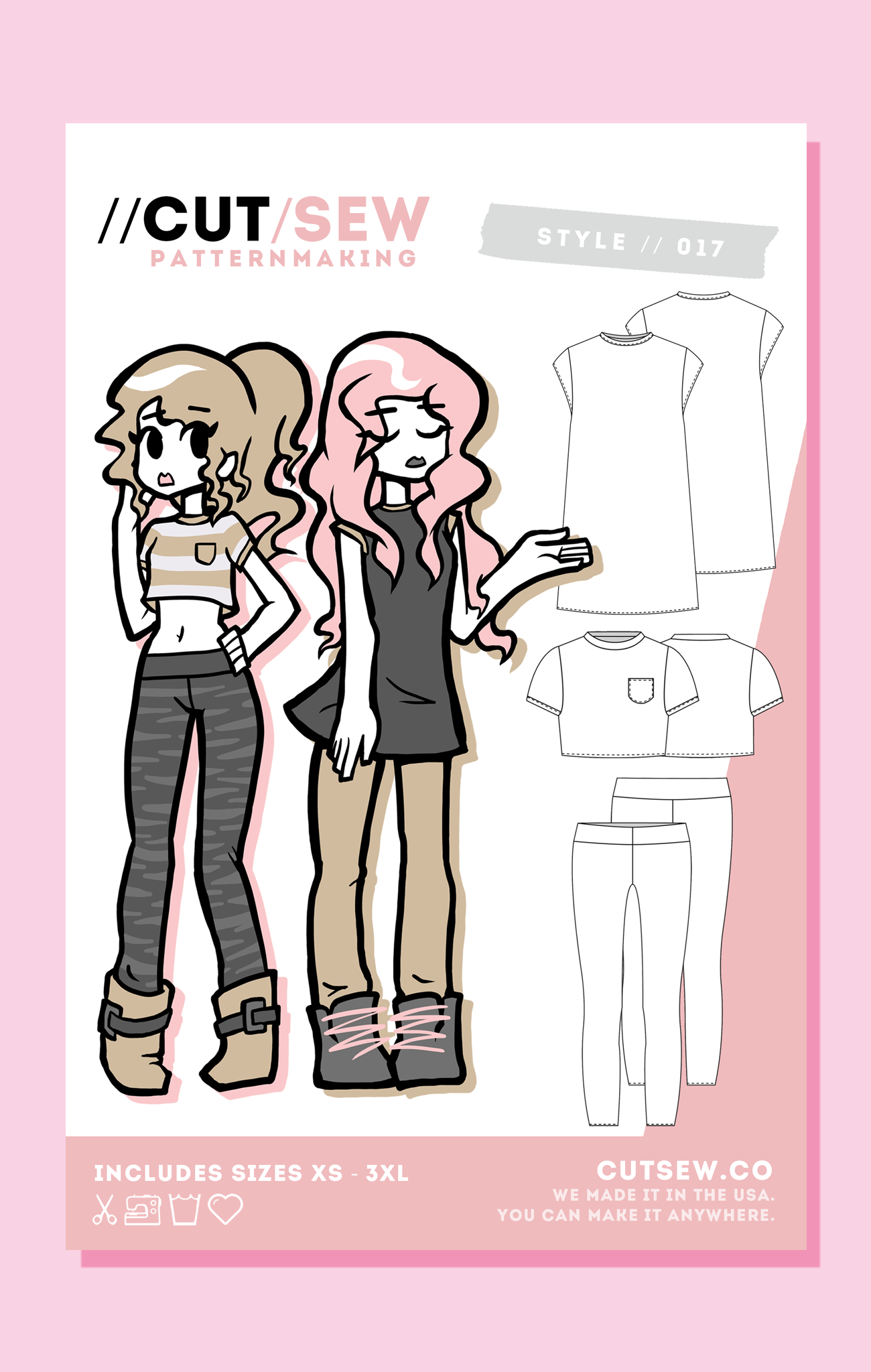 The perfect way to start sewing knits! This extra beginner-friendly pattern features basic leggings with a fold over waistband, a t-shirt style crop top, and an oversized tee for all your lazy day fashion needs. Sew it with an overlock serger or with a regular home sewing machine - instructions are included for both options.