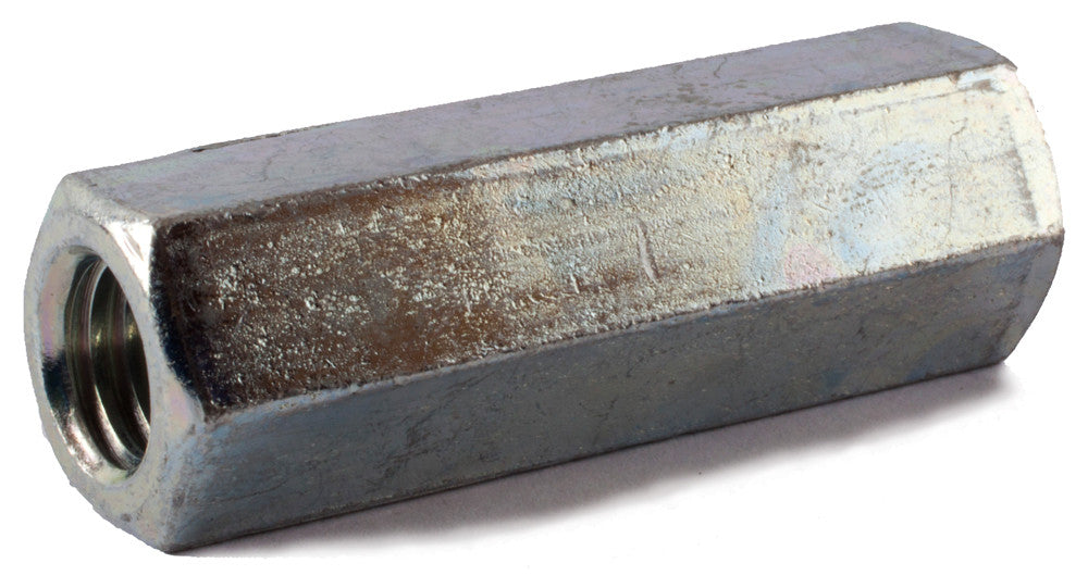 1 1/2-6 x 2 x 4 A563 Grade A Hex Coupling Nut ZInc Plated . A double chamfered hex nut used to join to externally threaded parts of equal diameter and pitch, often two pieces of threaded rod. Manufactured from 1010 - 1018 equivalent steel. Hardness = Rockwell B68 - C32 Tensile strength = 60,000 psi. minimum. Note - there is no single standard for coupling nut dimensions. These values are offered as a guide; deviations from these specifications may occur.