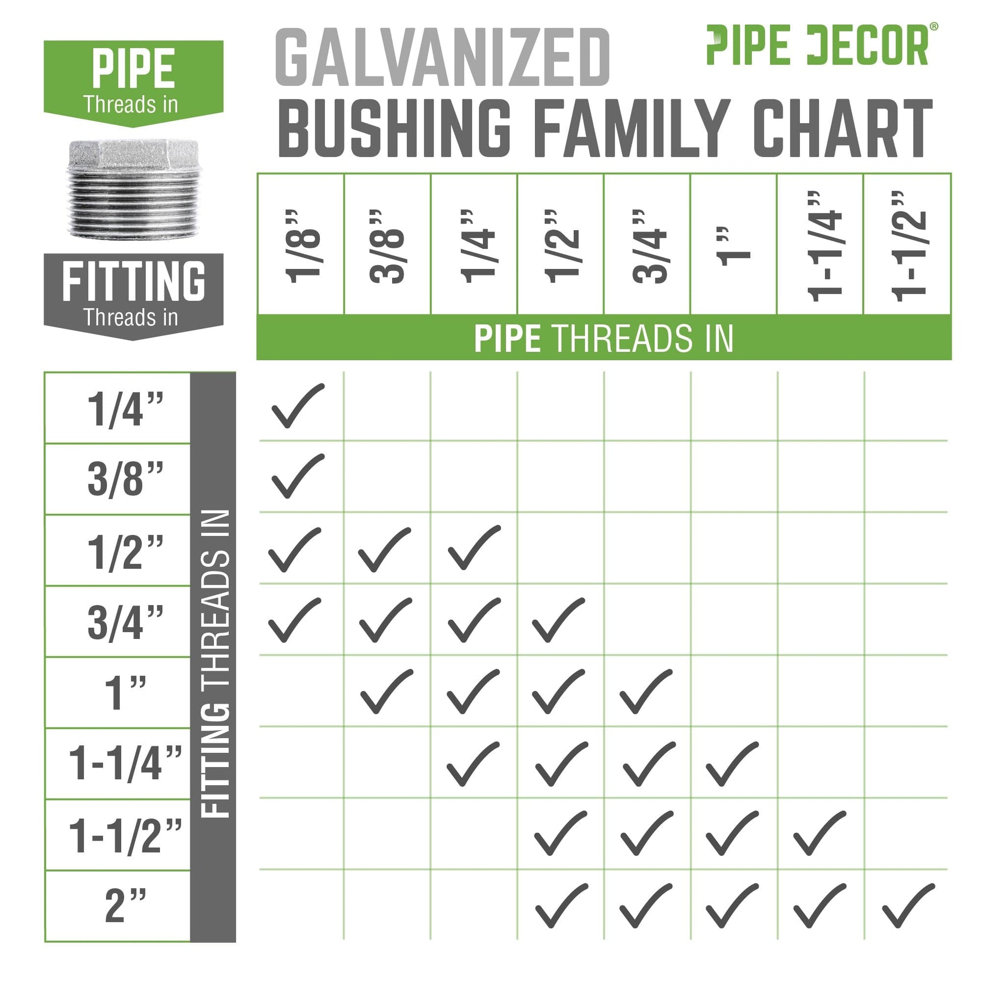 Make your standard fittings more versatile with our galvanized bushings. A bushing can be used in any project that involves connecting a larger fitting with a smaller pipe. Make the most of your DIY creations. Galvanized fittings are silver in color with a shiny finish that brings a clean, polished look to your pipe furniture. Our fittings are made with durable, industrial-grade malleable iron. Fittings are 100% authentic and are made to stand the test of time. You will know PIPE DECOR parts and accessories when you hold them. Beauty and beast. Strength and style. These are real industrial fittings for your decorations and designs. Accept no substitutes. Extra pieces and accessories are available for your custom projects and expansions. Plug and play as desired.