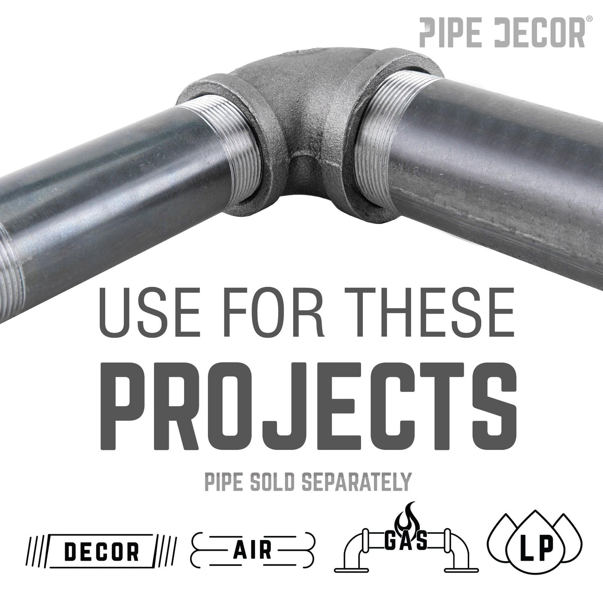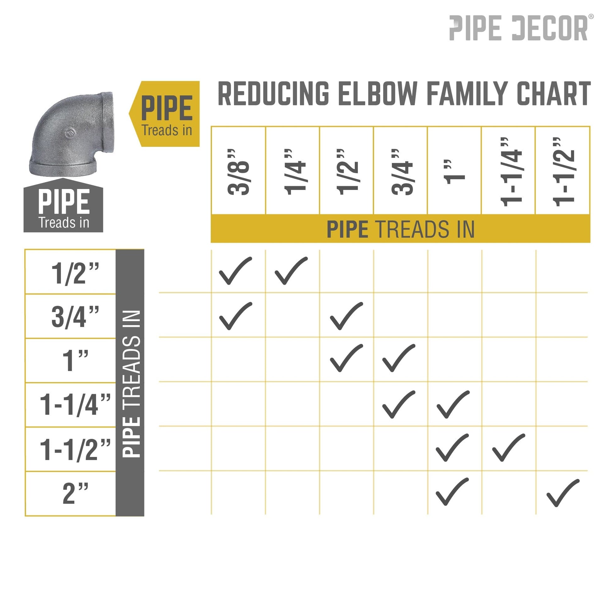 Having trouble connecting two pipes of different diameters? You need a reducing elbow. Fit that bigger or smaller pipe into your next pipe project. Create a unique visual effect by using two different pipe sizes in you DIY projects. Our fittings are made with durable, industrial-grade malleable iron. Fittings are 100% authentic and are made to stand the test of time. You will know PIPE DECOR parts and accessories when you hold them. Beauty and beast. Strength and style. These are real industrial fittings for your decorations and designs. Accept no substitutes. Extra pieces and accessories are available for your custom projects and expansions. Plug and play as desired.