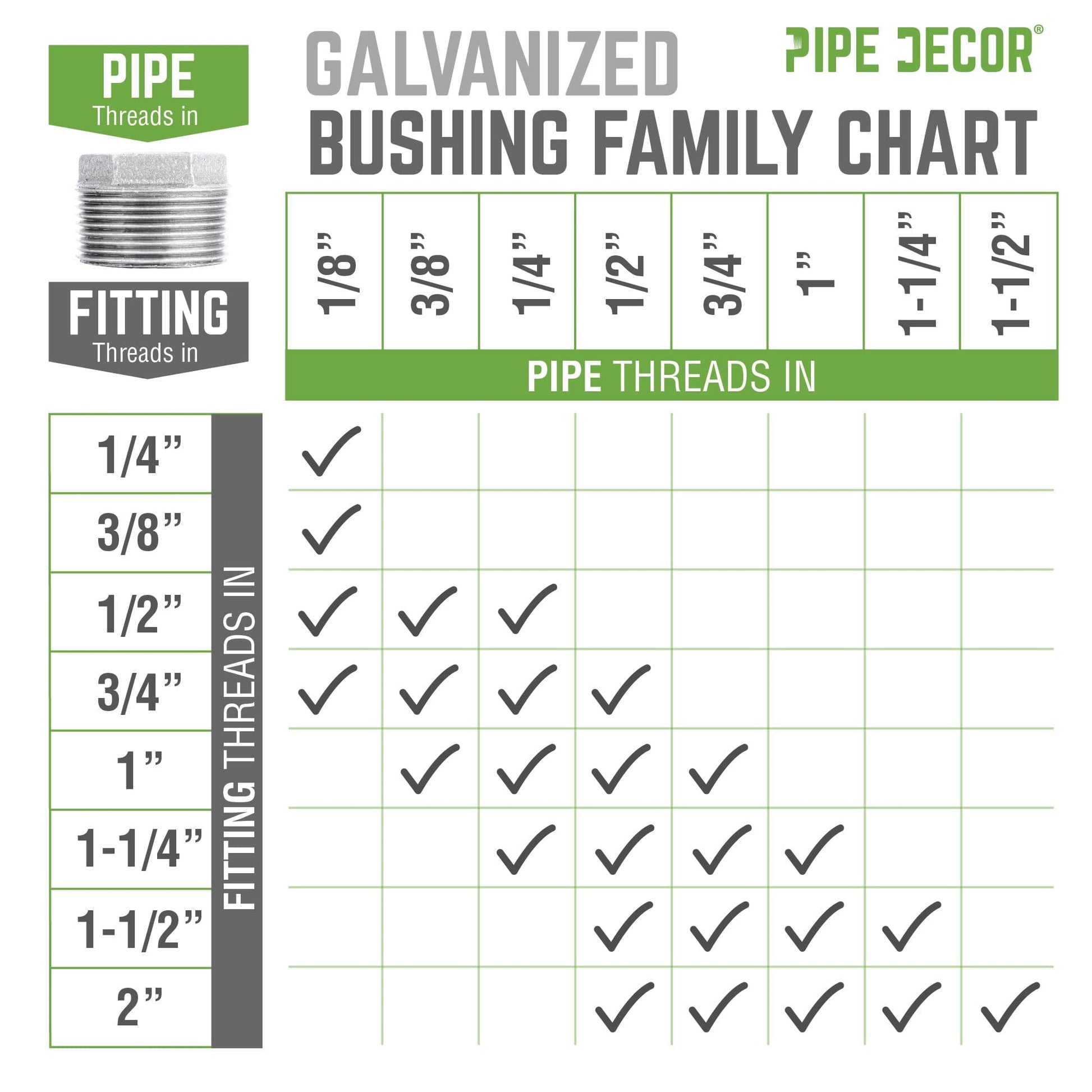 Make your standard fittings more versatile with our galvanized bushings. A bushing can be used in any project that involves connecting a larger fitting with a smaller pipe. Make the most of your DIY creations. Galvanized fittings are silver in color with a shiny finish that brings a clean, polished look to your pipe furniture. Our fittings are made with durable, industrial-grade malleable iron. Fittings are 100% authentic and are made to stand the test of time. You will know PIPE DECOR parts and accessories when you hold them. Beauty and beast. Strength and style. These are real industrial fittings for your decorations and designs. Accept no substitutes. Extra pieces and accessories are available for your custom projects and expansions. Plug and play as desired.