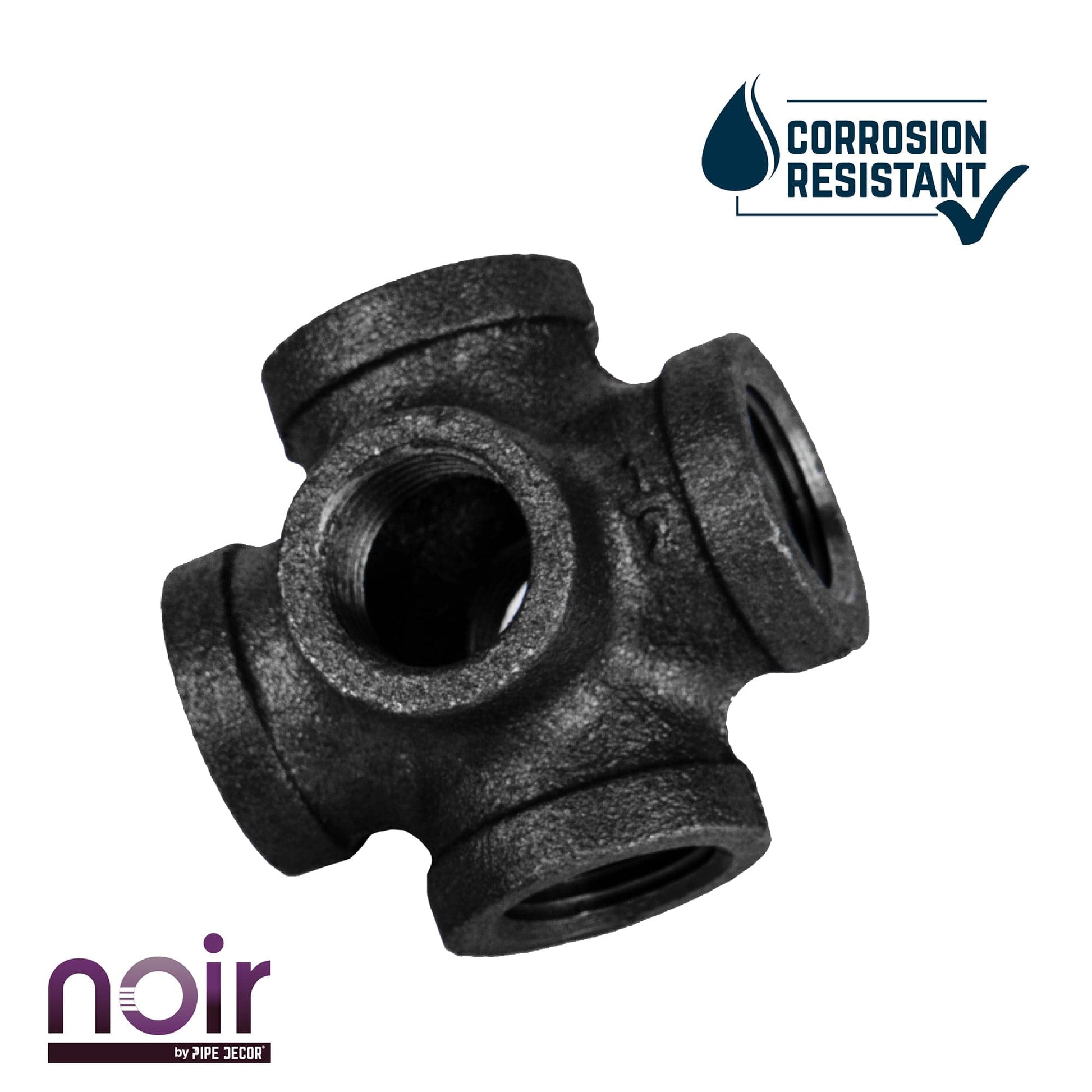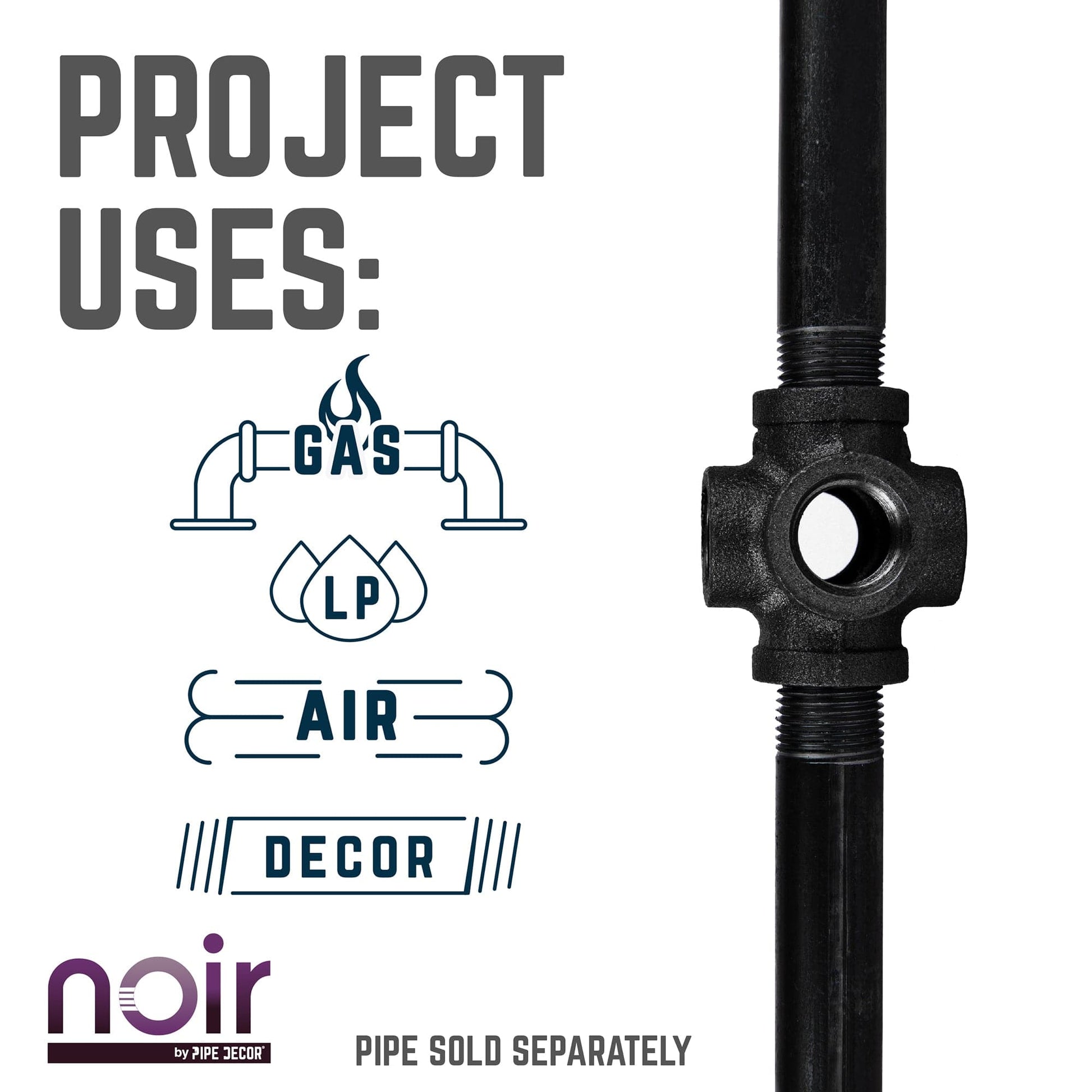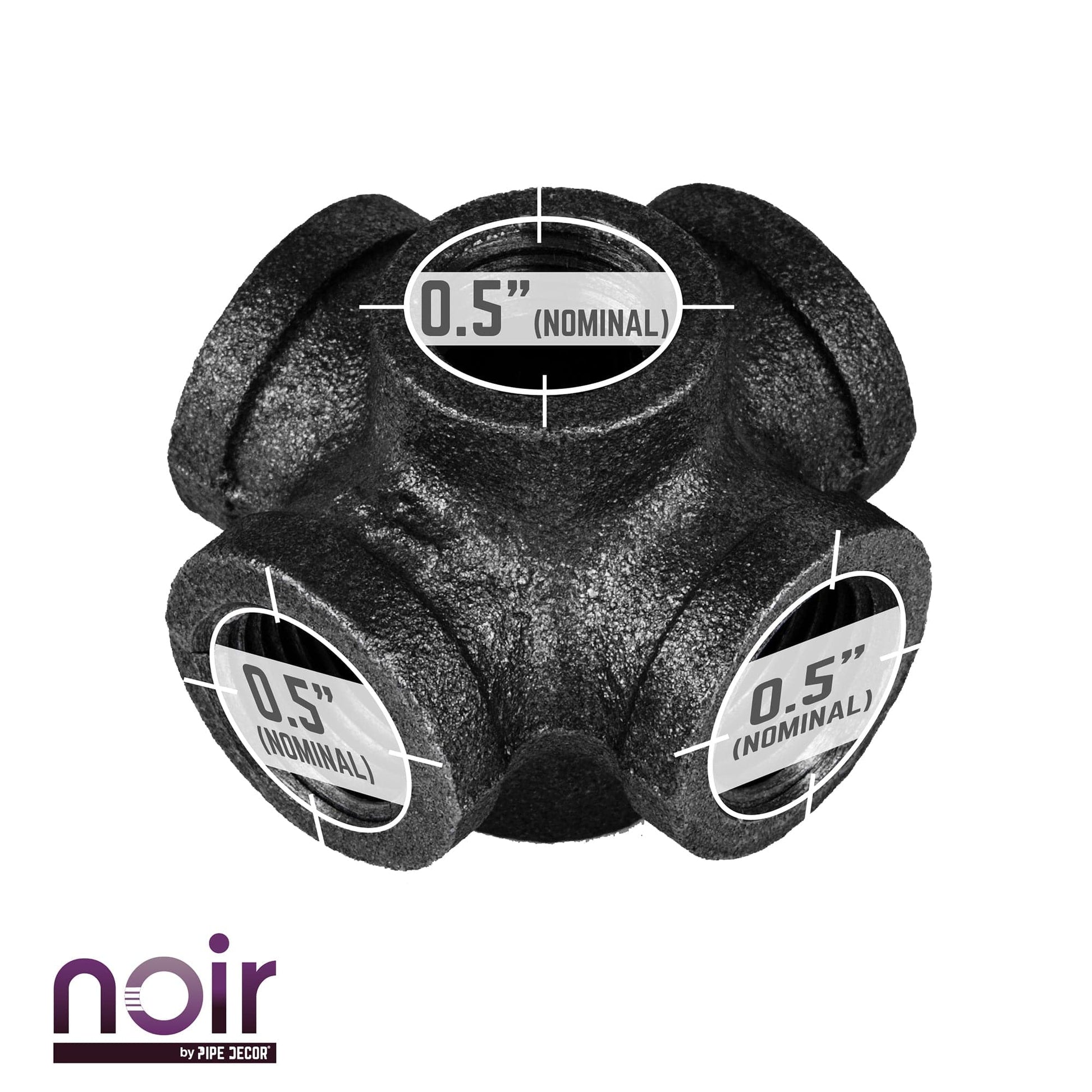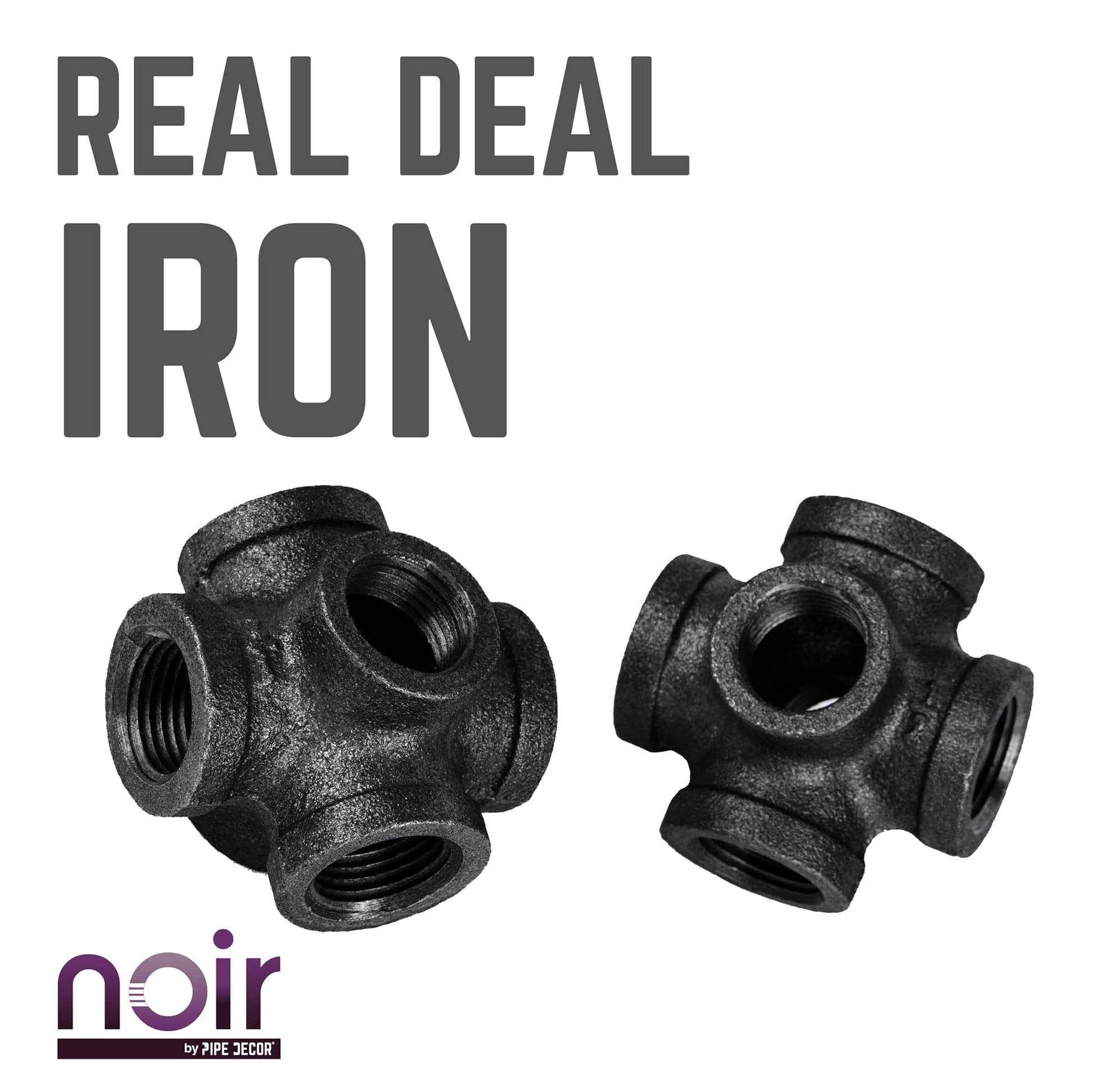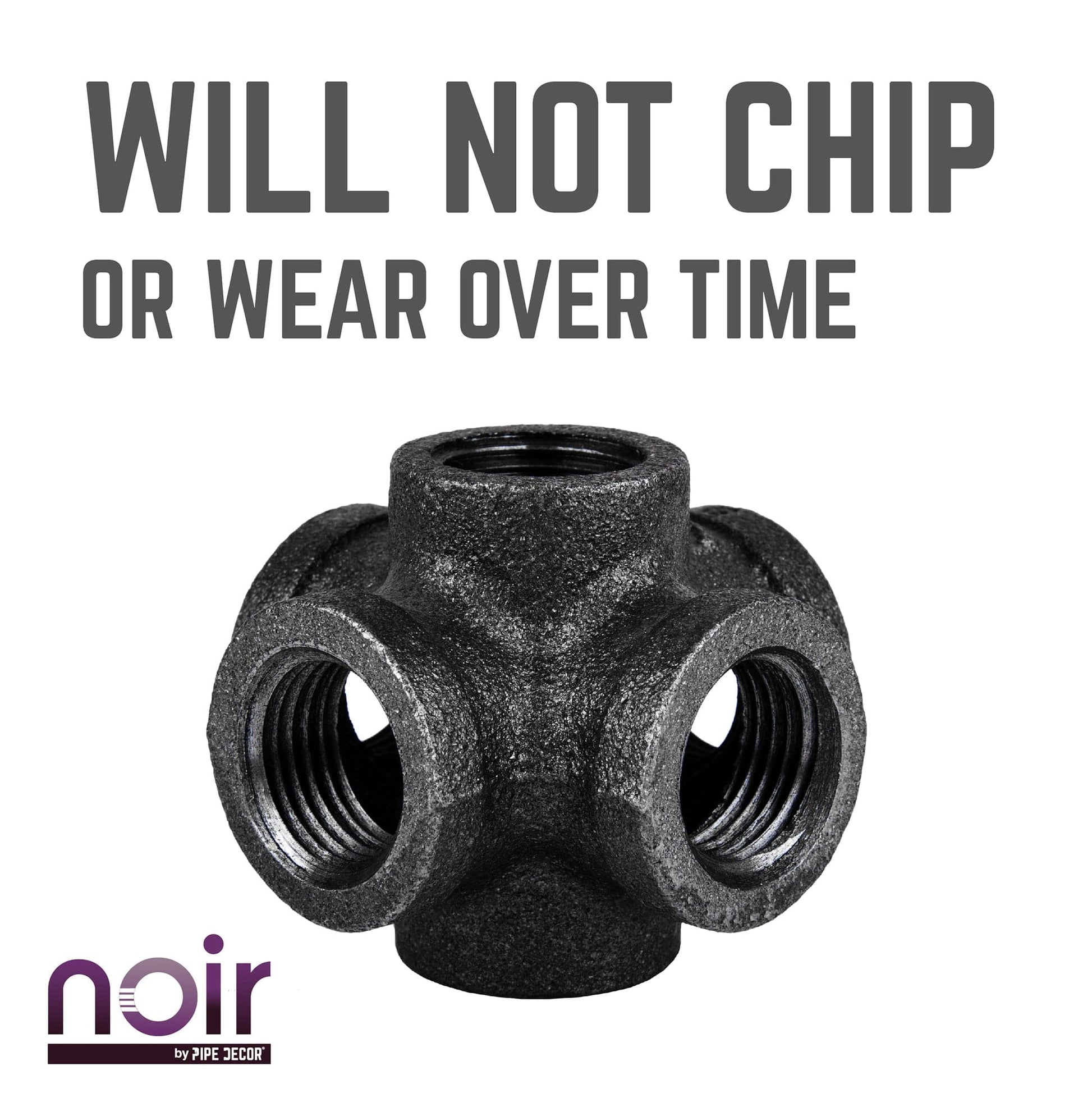 Take your industrial style to the next level with Noir by PIPE DECOR. These prefinished matte black iron fittings truly stand out from the crowd. Noir lends a sophisticated vibe to any PIPE DECOR piece. A PIPE DECOR exclusive, this patented design allows you to connect up to 6 pipes to a single fitting. Use a 6-way fitting as the center of a pipe light fixture or for other creative projects. The sky’s the limit! Combine any of our fitting finishes for a one-of-a-kind project that’s unique to you. The beauty of Noir goes below the surface. Unlike electroplated or painted items, our finishing process causes the matte black color to permeate each fitting for a deep tone that will last a lifetime. That means you never have to worry about chips or scratches. While our standard black pipes and fittings are coated in a protective oil during transit, our Noir line comes completely ready to use—no need to clean and seal. It’s laid-back and low maintenance for the DIYer on the go.Take your industrial style to the next level with Noir by PIPE DECOR. These prefinished matte black iron fittings truly stand out from the crowd. Noir lends a sophisticated vibe to any PIPE DECOR piece. A PIPE DECOR exclusive, this patented design allows you to connect up to 6 pipes to a single fitting. Use a 6-way fitting as the center of a pipe light fixture or for other creative projects. The sky’s the limit! Combine any of our fitting finishes for a one-of-a-kind project that’s unique to you. The beauty of Noir goes below the surface. Unlike electroplated or painted items, our finishing process causes the matte black color to permeate each fitting for a deep tone that will last a lifetime. That means you never have to worry about chips or scratches. While our standard black pipes and fittings are coated in a protective oil during transit, our Noir line comes completely ready to use—no need to clean and seal. It’s laid-back and low maintenance for the DIYer on the go.