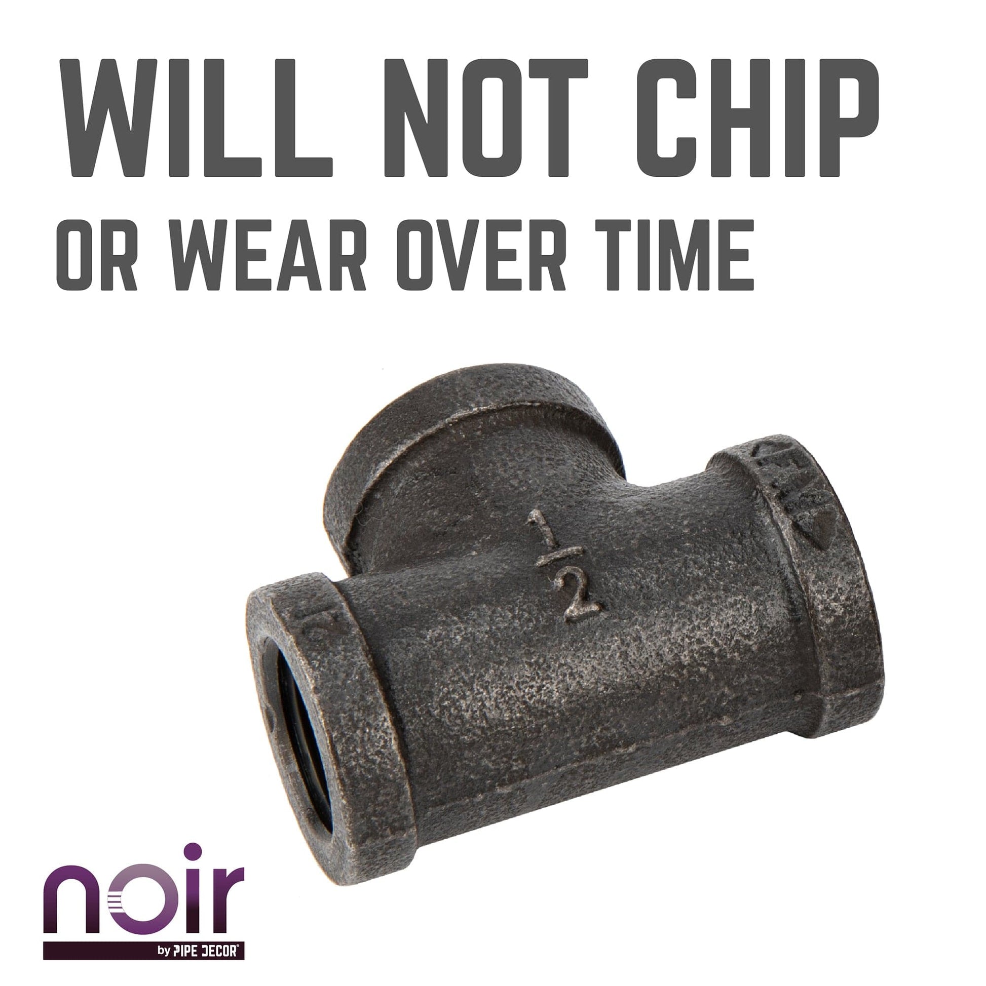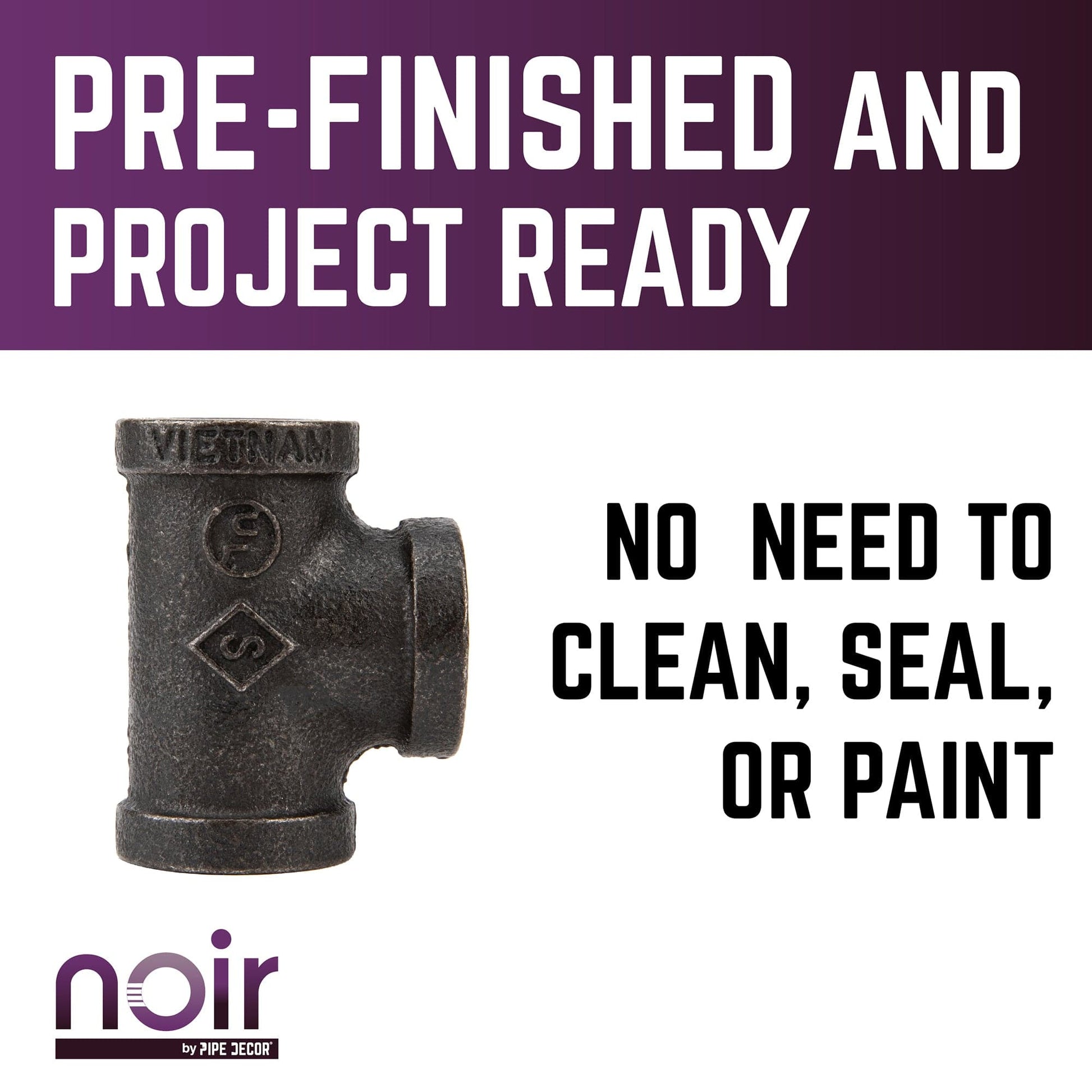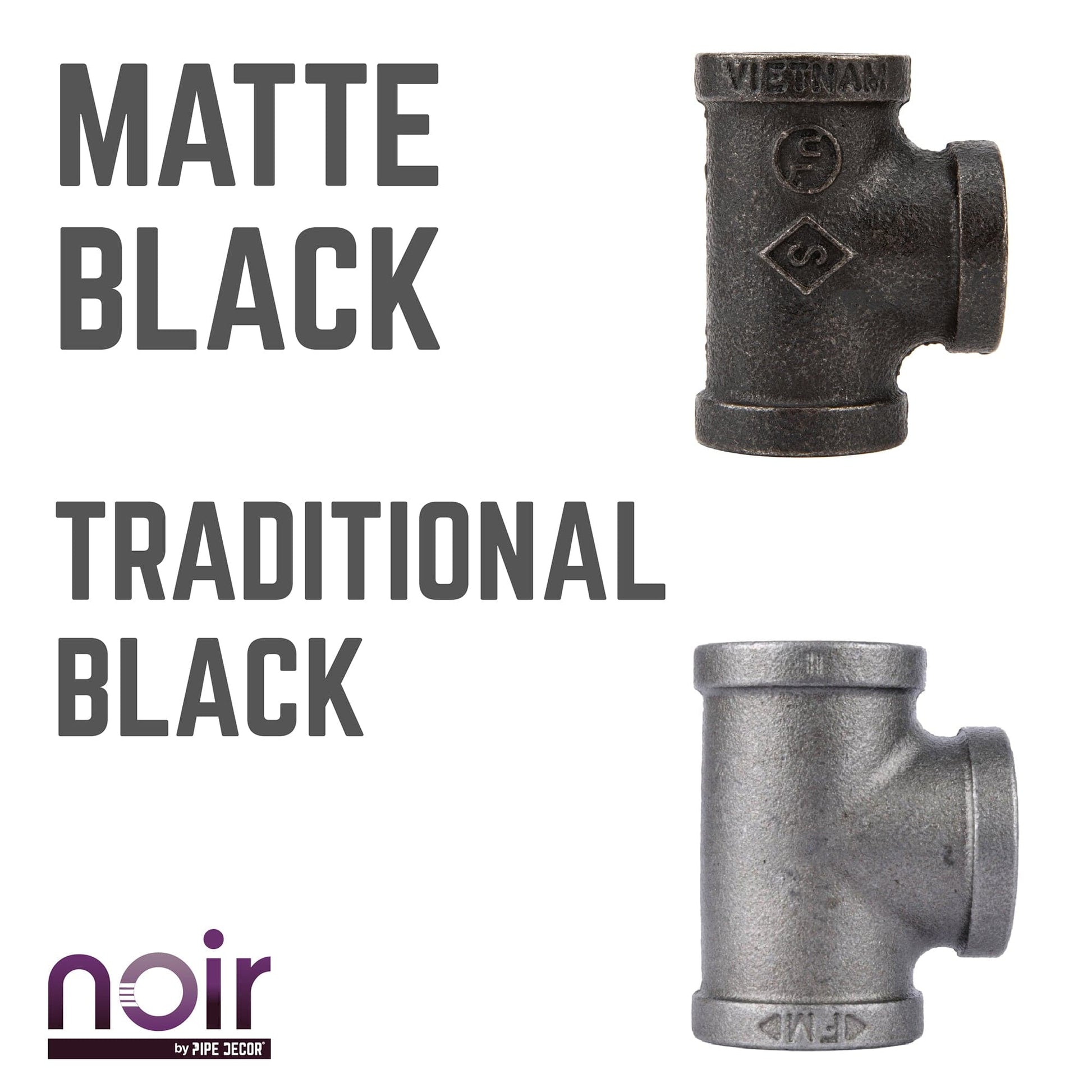 Take your industrial style to the next level with Noir by PIPE DECOR. These prefinished matte black iron fittings truly stand out from the crowd. Noir lends a sophisticated vibe to any PIPE DECOR piece. Build true black shelf brackets to pair with our RESTORE wood shelves or add black flanges to the ends of your pipe table legs. Noir also looks great with brass or galvanized accents. Combine any of our fitting finishes for a one-of-a-kind project that’s unique to you. The beauty of Noir goes below the surface. Unlike electroplated or painted items, our finishing process causes the matte black color to permeate each fitting for a deep tone that will last a lifetime. That means you never have to worry about chips or scratches. While our standard black pipes and fittings are coated in a protective oil during transit, our Noir line comes completely ready to use—no need to clean and seal. It’s laid-back and low maintenance for the DIYer on the go.
