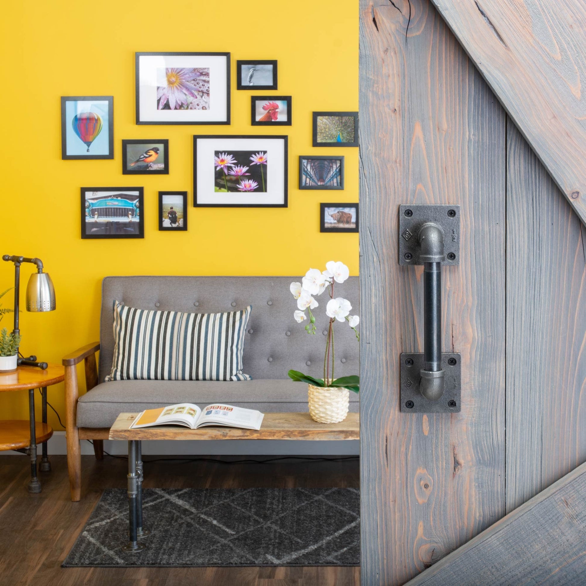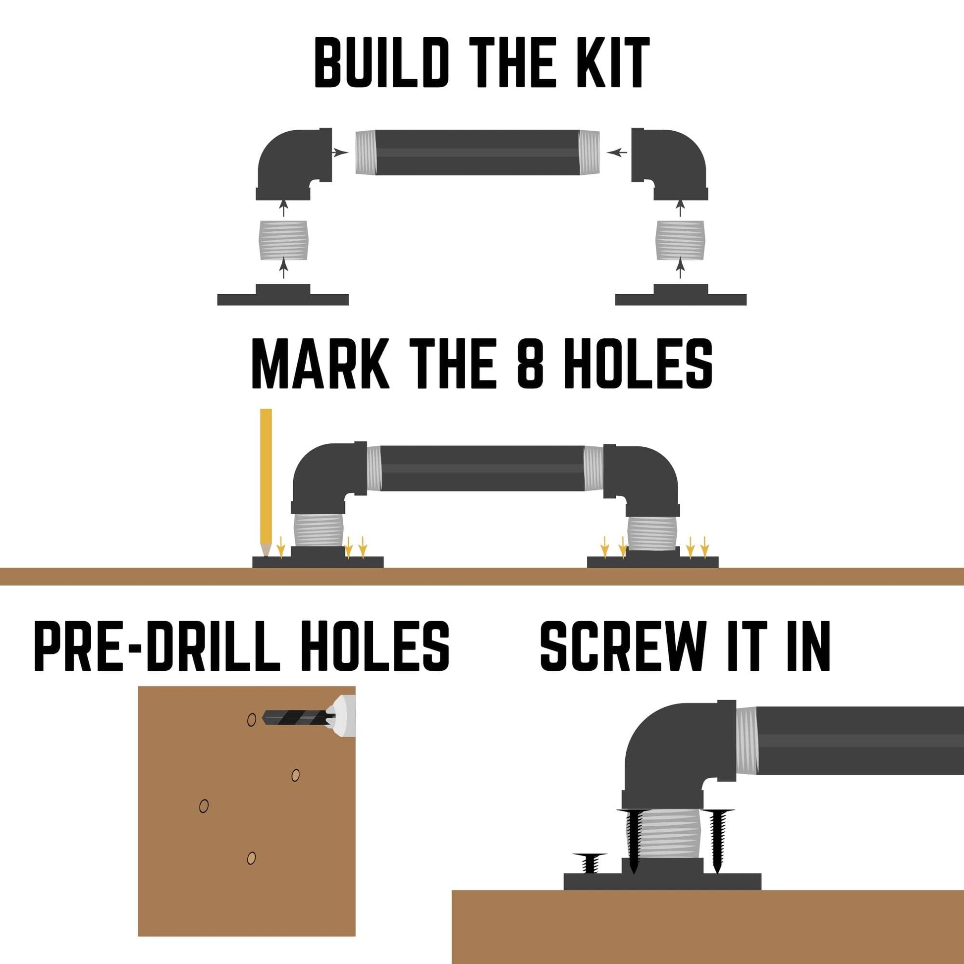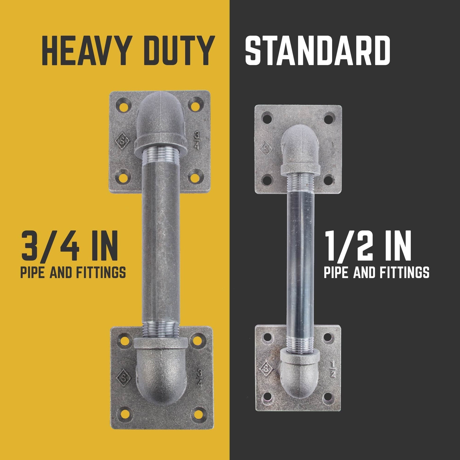 The barn door handle - reimagined. We've given our barn door handle a new sleek, edgy design to match the evolving look of industrial farmhouse decor. Traditional rounded curves are replaced with straight tees, squared-off plugs, and our patented square flange to give your decor a unique look and feel. A perfect blend of function and style, these industrial farmhouse-style barn door pulls are the finishing touch for your rustic barn doors. These are genuine industrial pipe fittings, not imitation barn door handles. This product will stand the test of time. The ½ in. pipe and matching fittings work well with full-sized doors and look amazing as drawer pulls on larger pieces of furniture. Authentic plumbing pipe and fittings can be painted to match your decor or sealed with a clear finish. Our industrial black steel pipes and malleable iron fittings can be matched with any type of wood for a one-of-a-kind DIY door handle project that you can complete in just one weekend. We recommend using our barn door handles on solid wood doors only. PIPE DÉCOR is built to stand the test of time. We're modernizing pipes and using traditional materials in new, innovative ways. Each piece is the standard size and weight used in industrial pipe applications. Our pipes are durable, so you never have to worry about your door pulls failing to deliver. Don't accept cheap substitutes available in purely decorative materials. PIPE DÉCOR is the real deal.