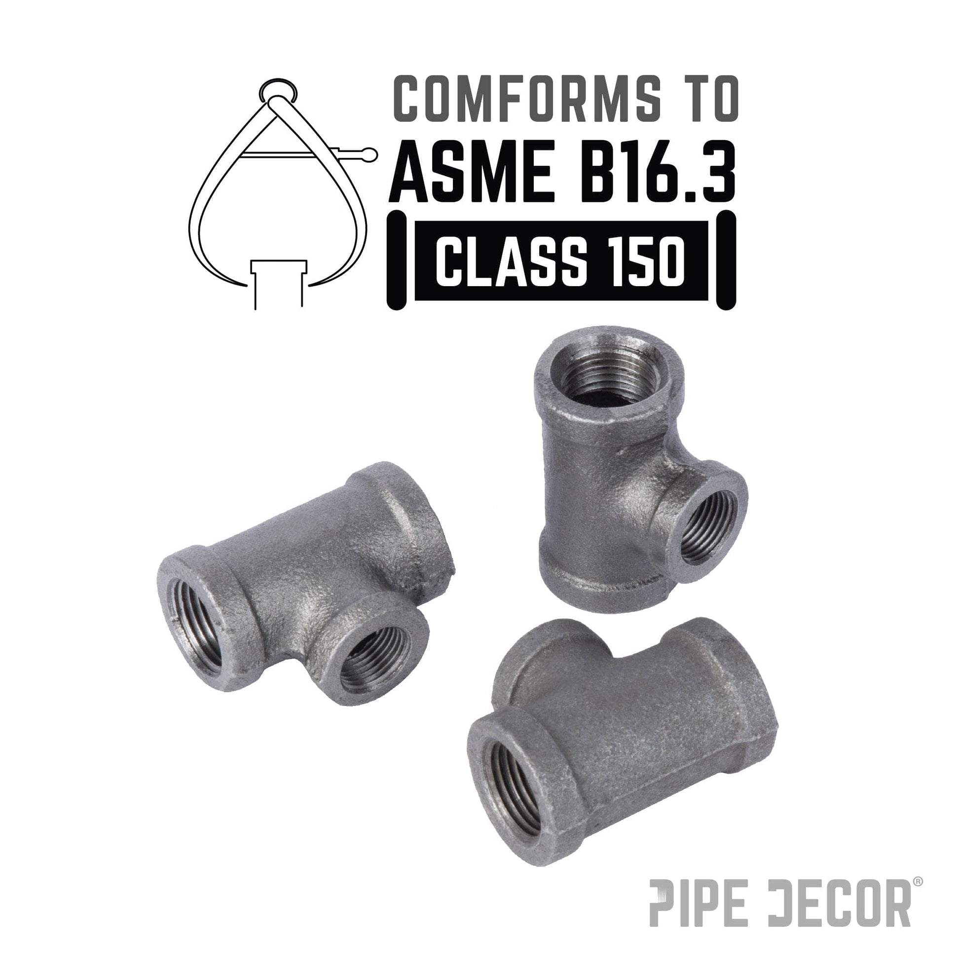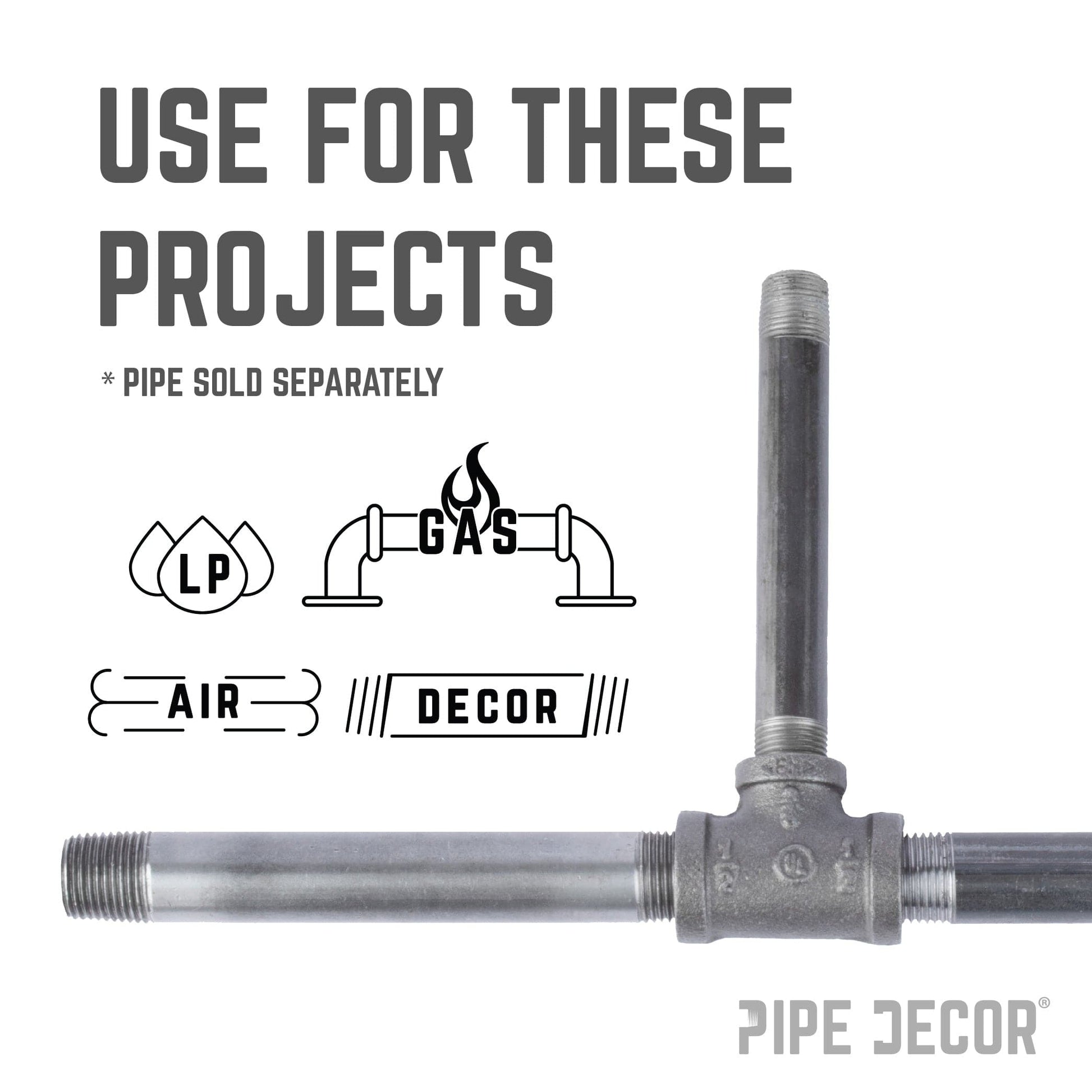 Our fittings are cast iron and machined to spec and are hydrostatically tested to hold pressure. Black pipe and fittings can be used for gas, air, liquid petroleum, and home decor use. Our fittings are covered in a light grease to prevent rust. For use in home décor projects, you will need to clean and seal them.