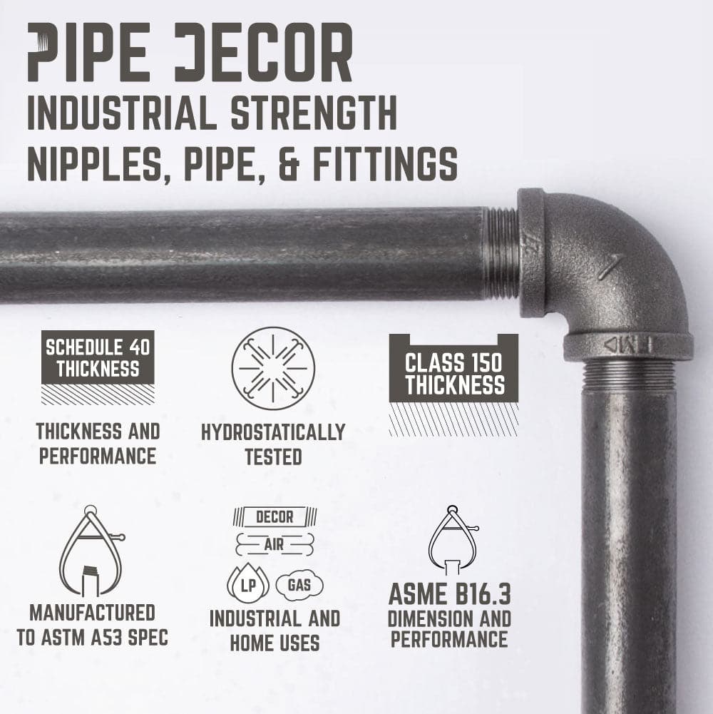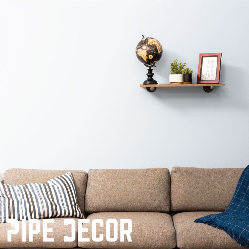 Pipe Decor, 10 in. straight industrial shelf brackets in a set of six. Add eye-catching style to your new set of shelves with these heavy-duty, pipe shelving brackets. Iron fittings and black steel pipe pair impeccably with woods of various colors and sizes. Treat your visitors to your sense of style and attention to detail. These Pipe Decor brackets fit a surprising number of looks and aesthetics, including steampunk lighting, industrial, factory, French country farmhouse, vintage, retro reclamation, and D-I-Y. You will know Pipe Decor parts and accessories when you hold them. Beauty and beast. Strength and style. This is real industrial pipe for your creative design needs. Accept no substitutes. All our pipe and fittings come coated in a light industrial grease to prevent rusting. Clean and seal each piece, before assembly, to ensure that they stay rust-free. After cleaning, seal the pipe with polyurethane spray to protect it from rust and scratches.