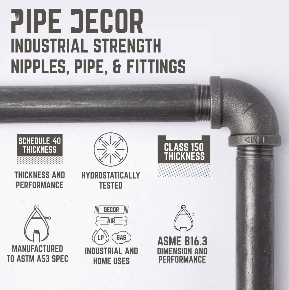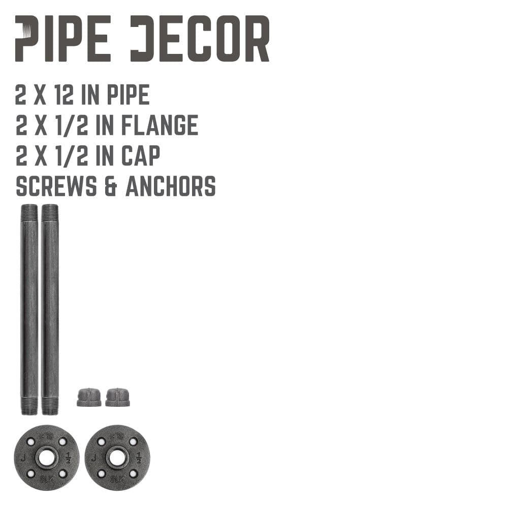Pipe Decor, 12 in. straight industrial shelf brackets in a set of two. Add eye-catching style to your new set of shelves with these heavy-duty, pipe shelving brackets. Iron fittings and black steel pipe pair impeccably with woods of various colors and sizes. Treat your visitors to your sense of style and attention to detail. These Pipe Decor brackets fit a surprising number of looks and aesthetics, including steampunk lighting, industrial, factory, French country farmhouse, vintage, retro reclamation, and D-I-Y. You will know Pipe Decor parts and accessories when you hold them. Beauty and beast. Strength and style. This is real industrial pipe for your creative design needs. Accept no substitutes. All our pipe and fittings come coated in a light industrial grease to prevent rusting. Clean and seal each piece, before assembly, to ensure that they stay rust-free. After cleaning, seal the pipe with polyurethane spray to protect it from rust and scratches.
