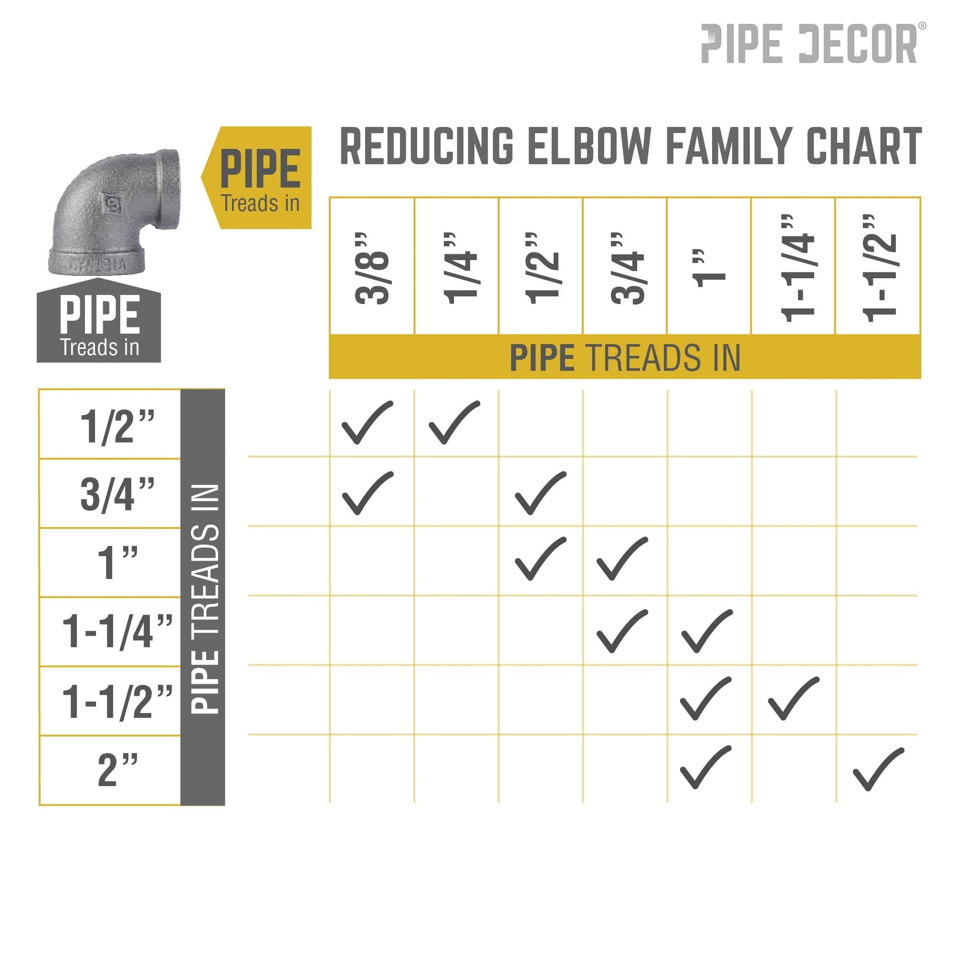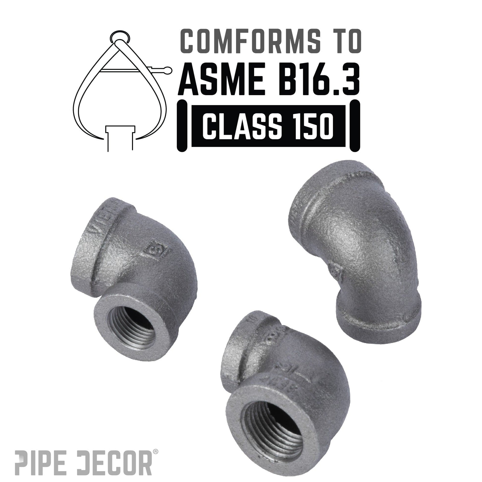 Having trouble connecting two pipes of different diameters? You need a reducing elbow. Fit that bigger or smaller pipe into your next pipe project. Create a unique visual effect by using two different pipe sizes in you DIY projects. Our fittings are made with durable, industrial-grade malleable iron. Fittings are 100% authentic and are made to stand the test of time. You will know PIPE DECOR parts and accessories when you hold them. Beauty and beast. Strength and style. These are real industrial fittings for your decorations and designs. Accept no substitutes. Extra pieces and accessories are available for your custom projects and expansions. Plug and play as desired.