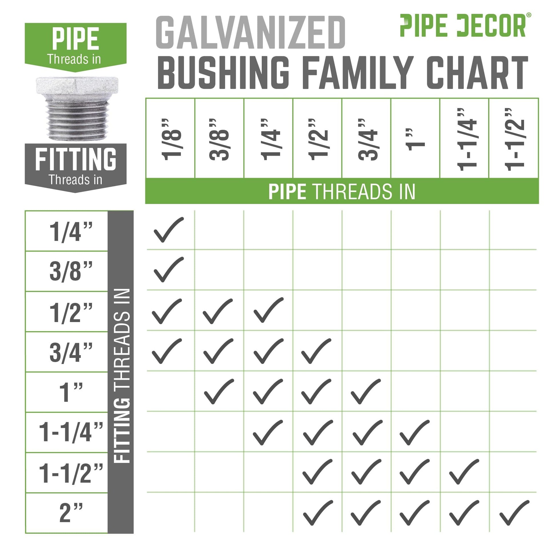 Make your standard fittings more versatile with our galvanized bushings. A bushing can be used in any project that involves connecting a larger fitting with a smaller pipe. Make the most of your DIY creations. Galvanized fittings are silver in color with a shiny finish that brings a clean, polished look to your pipe furniture. Our fittings are made with durable, industrial-grade malleable iron. Fittings are 100% authentic and are made to stand the test of time. You will know PIPE DECOR parts and accessories when you hold them. Beauty and beast. Strength and style. These are real industrial fittings for your decorations and designs. Accept no substitutes. Extra pieces and accessories are available for your custom projects and expansions. Plug and play as desired.