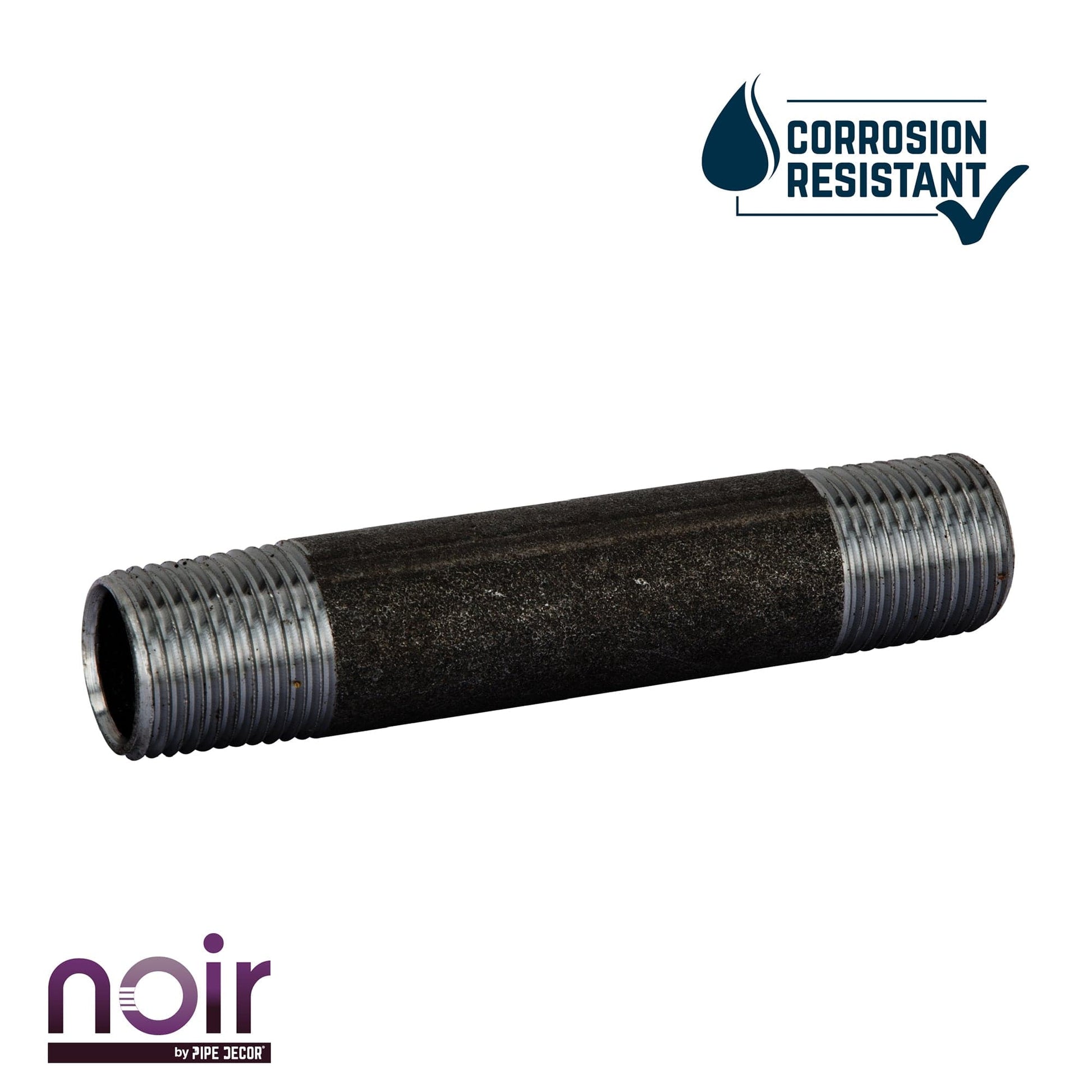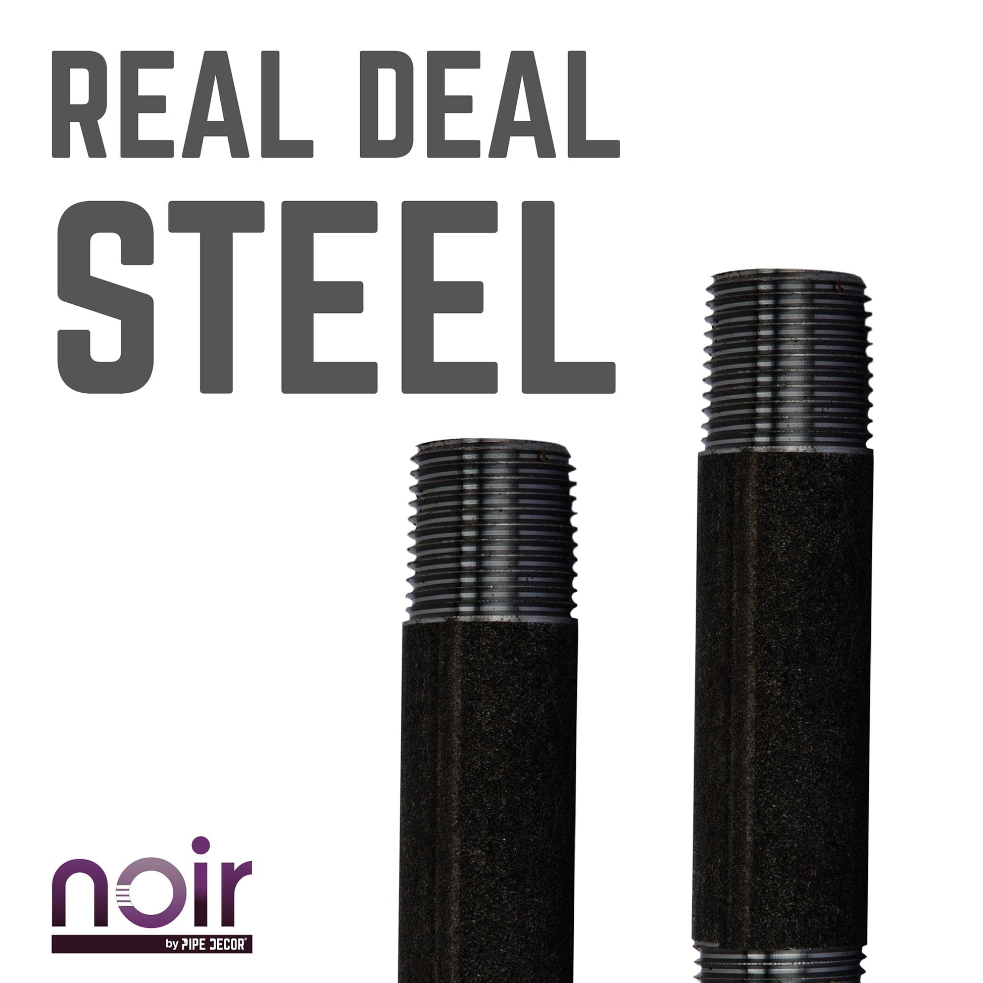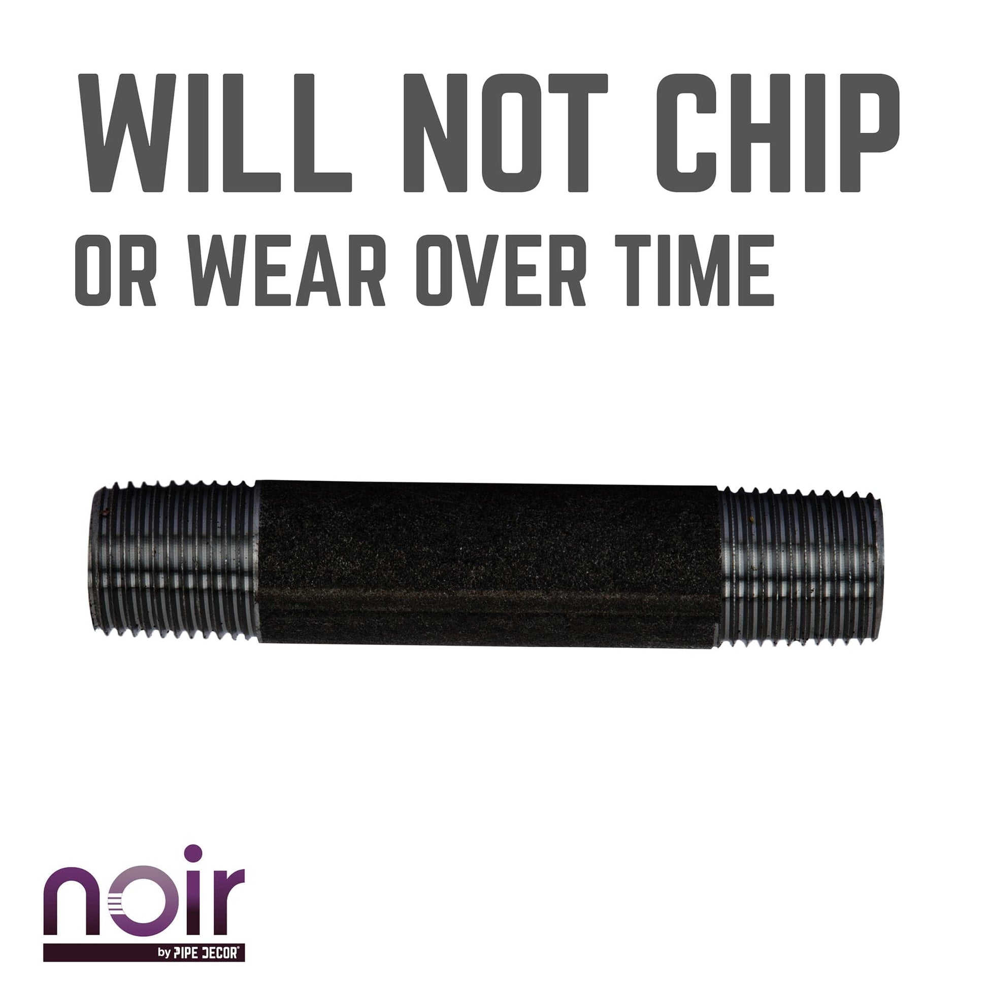 Noir also looks great with brass or galvanized accents. Combine any of our pipe finishes for a one-of-a-kind project that’s unique to you. The beauty of Noir goes below the surface. Unlike electroplated or painted items, our finishing process causes the matte black color to permeate each pipe for a deep tone that will last a lifetime. That means you never have to worry about chips or scratches. While our standard black pipes and fittings are coated in a protective oil during transit, our Noir line comes completely ready to use—no need to clean and seal. It’s laid-back and low maintenance for the DIYer on the go.Take your industrial style to the next level with Noir by PIPE DECOR. These prefinished matte black steel nipples truly stand out from the crowd. Noir lends a sophisticated vibe to any PIPE DECOR piece. Build true black pipe legs using our pipes and fittings or create a black clothing rack for your home or retail space.
