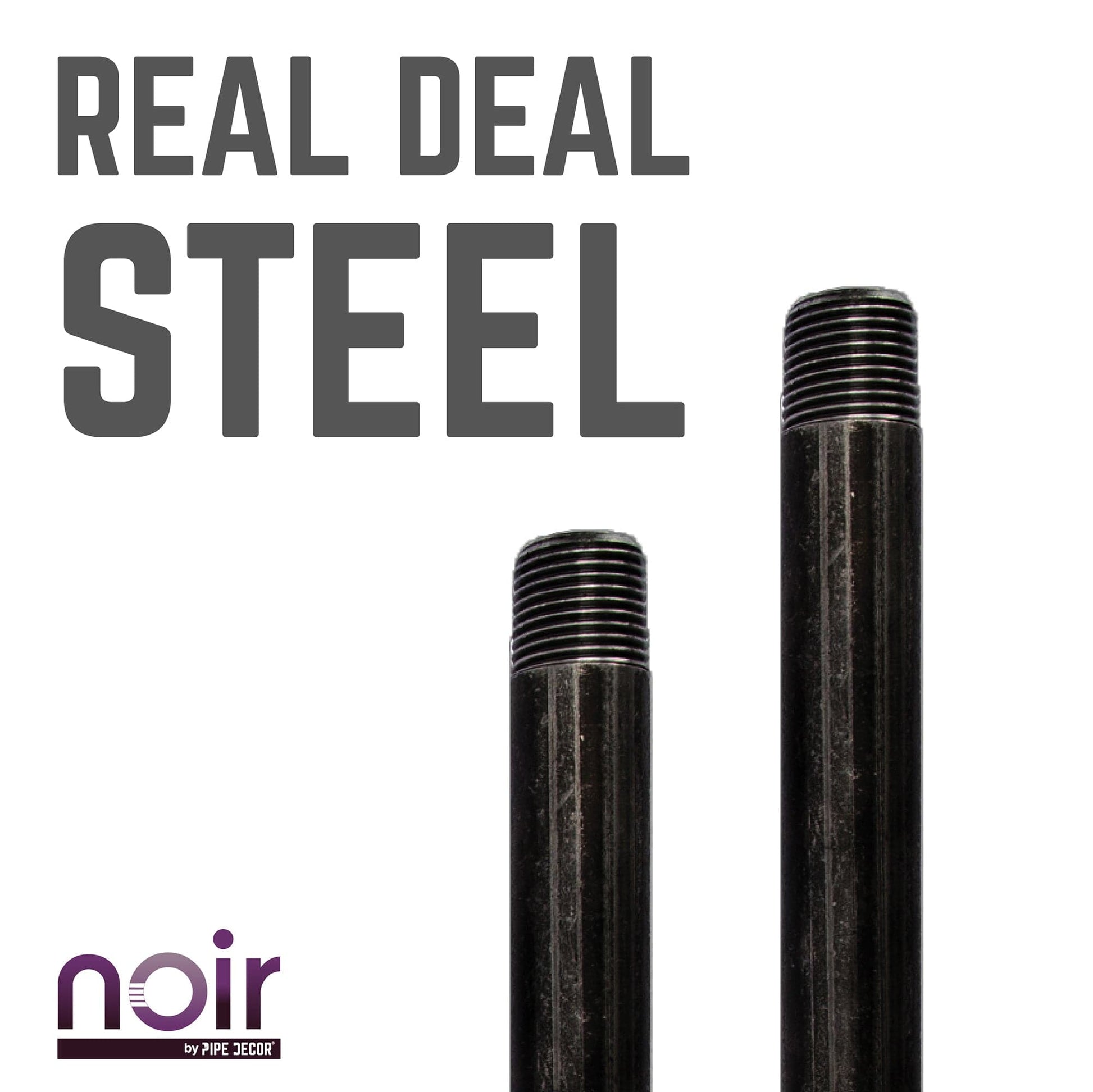 Take your industrial style to the next level with Noir by PIPE DECOR. These prefinished matte black steel nipples truly stand out from the crowd. Noir lends a sophisticated vibe to any PIPE DECOR piece. Build true black pipe legs using our pipes and fittings or create a black clothing rack for your home or retail space.