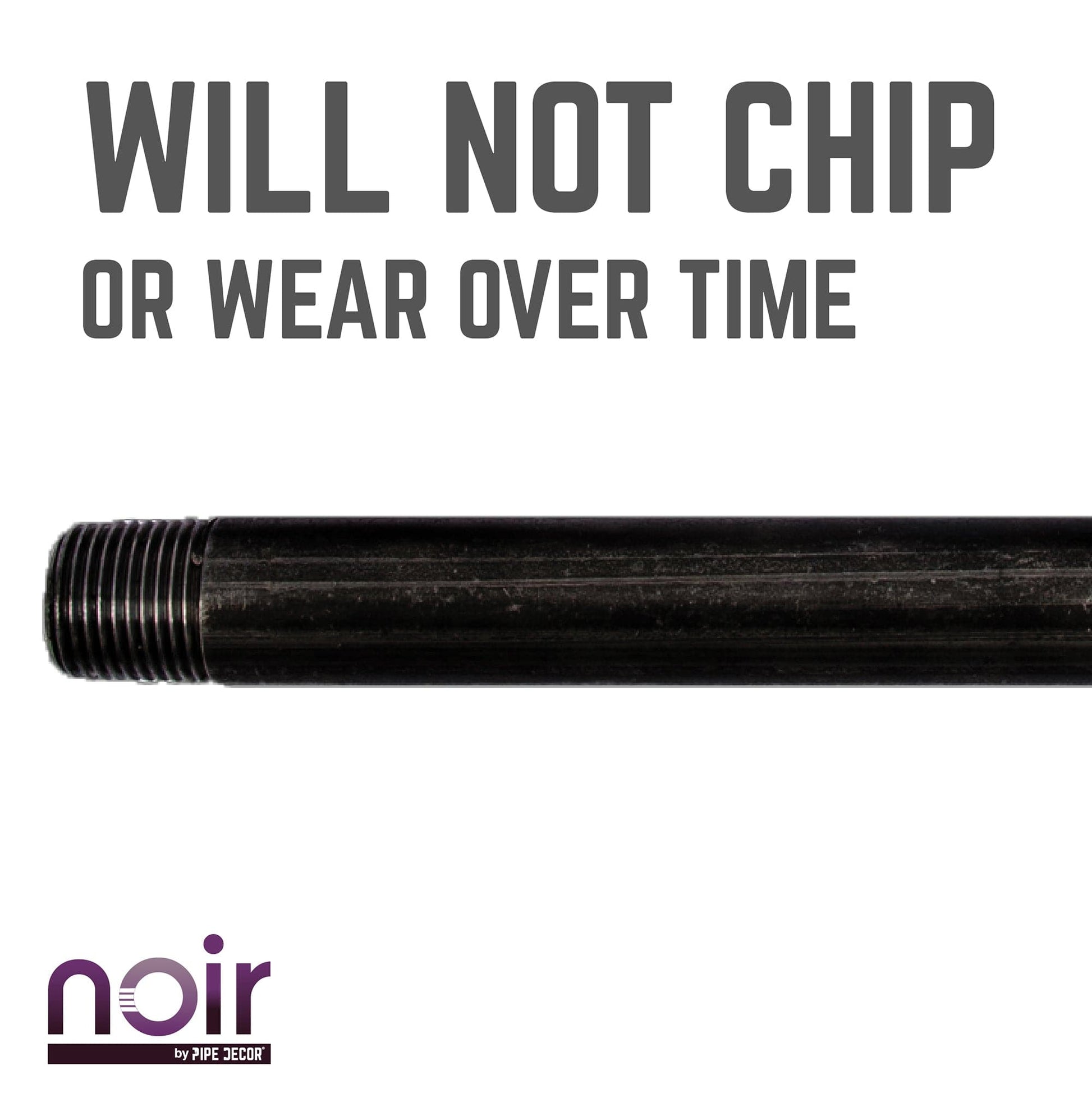 Noir also looks great with brass or galvanized accents. Combine any of our pipe finishes for a one-of-a-kind project that’s unique to you. The beauty of Noir goes below the surface. Unlike electroplated or painted items, our finishing process causes the matte black color to permeate each pipe for a deep tone that will last a lifetime. That means you never have to worry about chips or scratches. While our standard black pipes and fittings are coated in a protective oil during transit, our Noir line comes completely ready to use—no need to clean and seal. It’s laid-back and low maintenance for the DIYer on the go.Take your industrial style to the next level with Noir by PIPE DECOR. These prefinished matte black steel nipples truly stand out from the crowd. Noir lends a sophisticated vibe to any PIPE DECOR piece. Build true black pipe legs using our pipes and fittings or create a black clothing rack for your home or retail space.