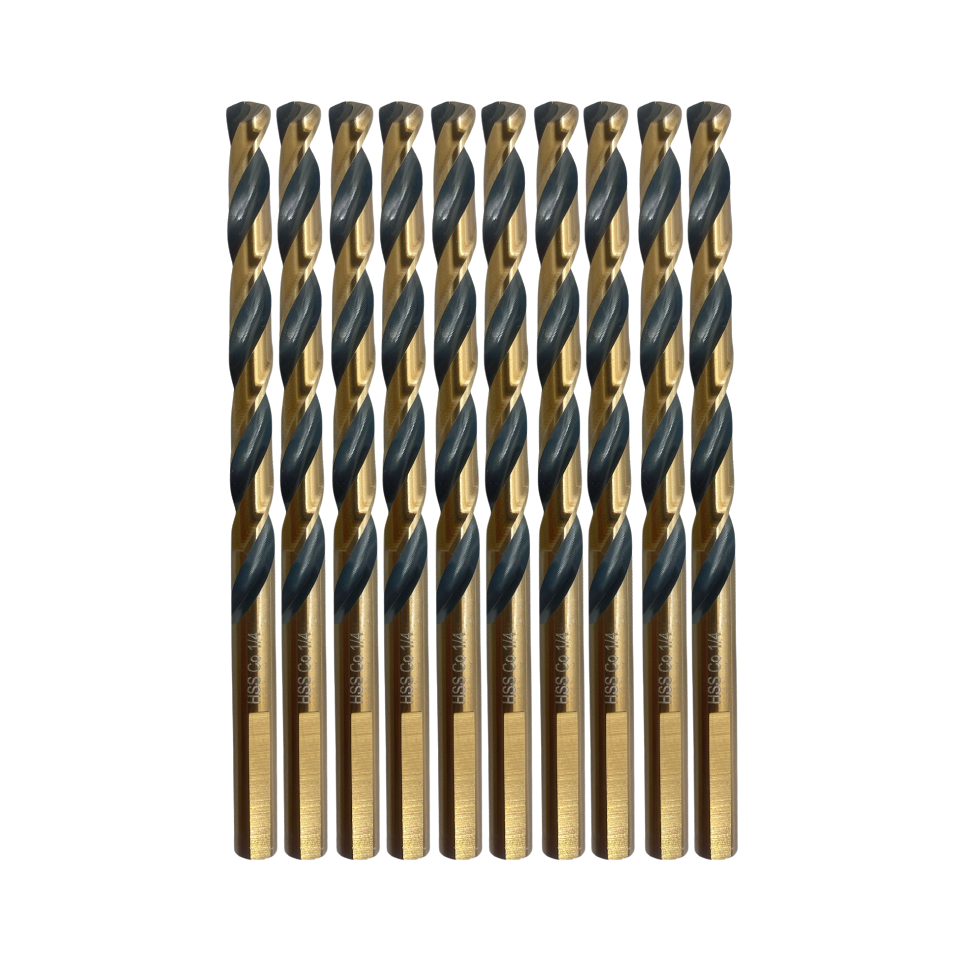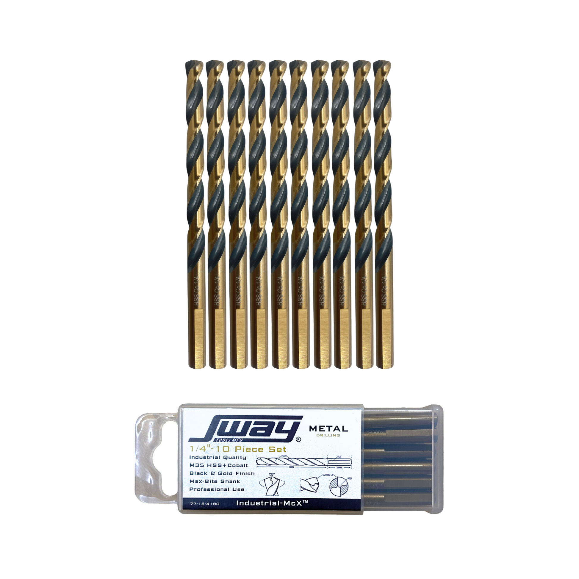 1/4" 10-Piece Cobalt Steel Drill Bit Set - Black & Gold Finish, 135° Split Point, Industrial Grade with Max Force, Triple Flat Shank Design for Non-Slip Hard Metal Drilling