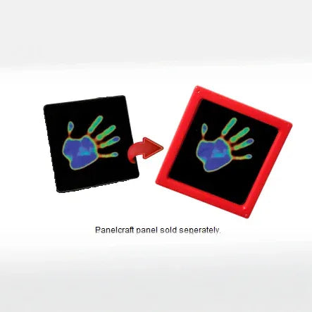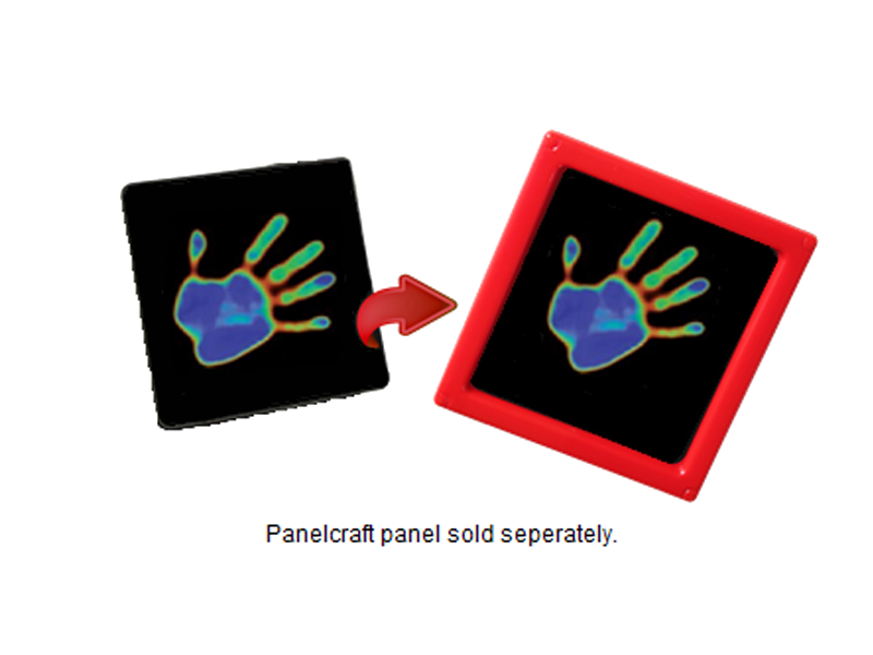 This amazing plastic sheet remains black except for a 10-degree temperature range. Place a warm object on it, like your hand, and the color changes from black to red, red to green, green to blue, and finally back to black again! The Heat Sheet™ empowers children to explore concepts of heat and light energy in their surroundings. Build the Heat Sheet Panel into a play house and explore thermal conduction just like the pros! Comes with adhesive backing, for easy installation in the frame side of a Panelcraft panel, and activity guide. Panelcraft panel sold separately.