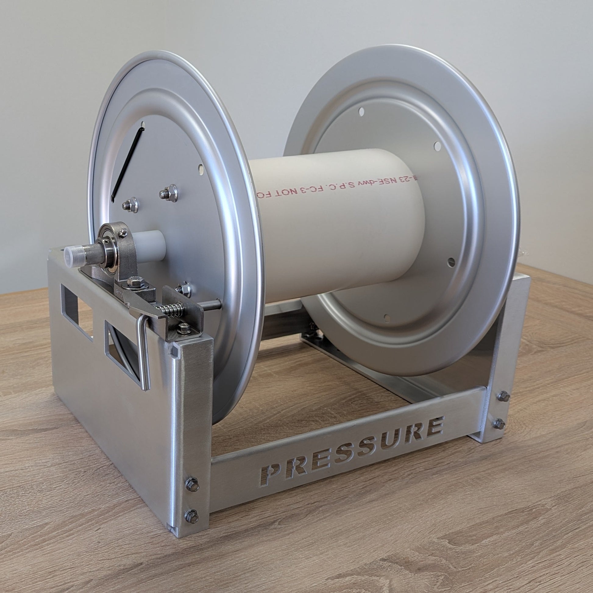 316 Stainless Steel Welded Internal Manifold Aluminum Frame Construction Stainless Heavy Duty Bearings with Grease Fittings Heavy Duty Handle This is a stout Pressure Washer Hose Reel