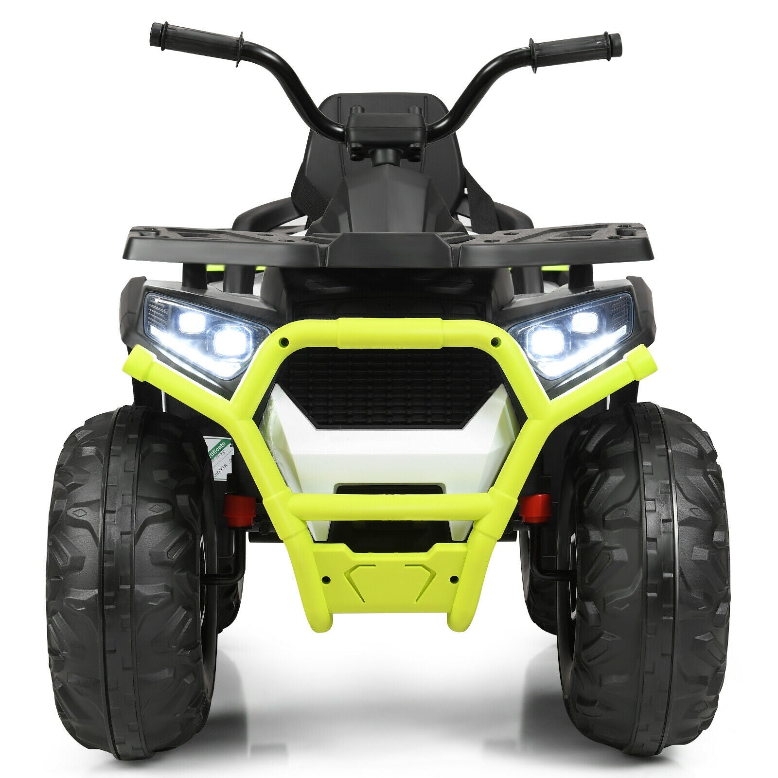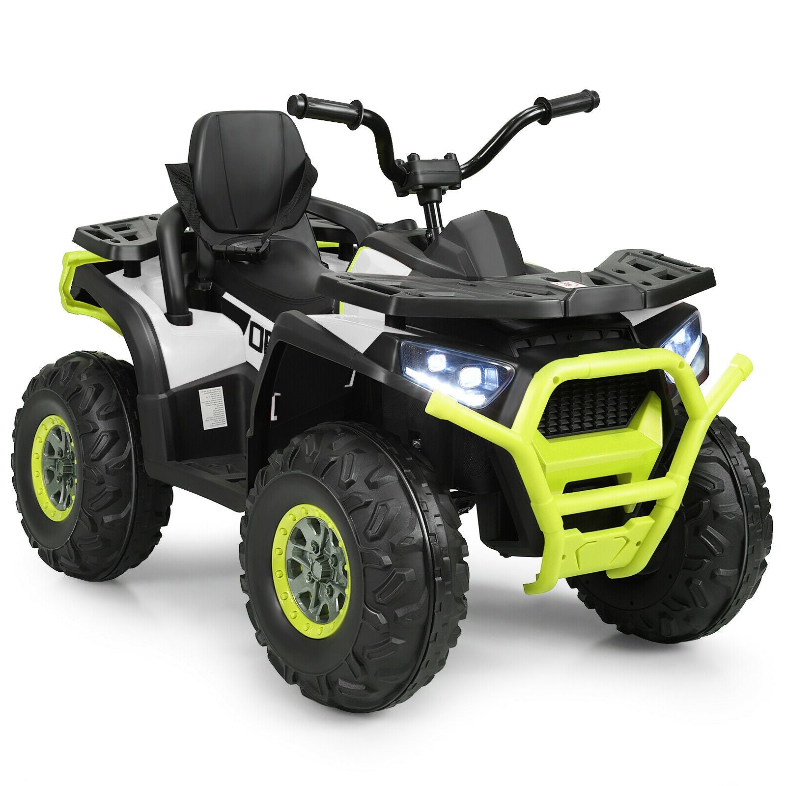 ● PP new material and metal frame to ensure sturdiness and durability● 2 powerful drive motors to reach 3-8 km/h speed● Equipped with AUX input USB port to connect external devices● Variable high/ low speeds for different driving experience● Forward/ reverse switch foot pedal and handlebars for kids to operate easily● Bright LED lights built-in music and stories for added fun● 4 wear-resistant wheels with spring suspension for long-time use● Kids-friendly seat with a safety belt for higher comfort and safety● One-button start design for enough convenience● Comes with a rechargeable battery and UL certified charger adapter● Max weight capacity can reach 110 lbs● Cool ATV design perfect gift to entertain kids over 3 years old● ASTM certification for enhanced reliability