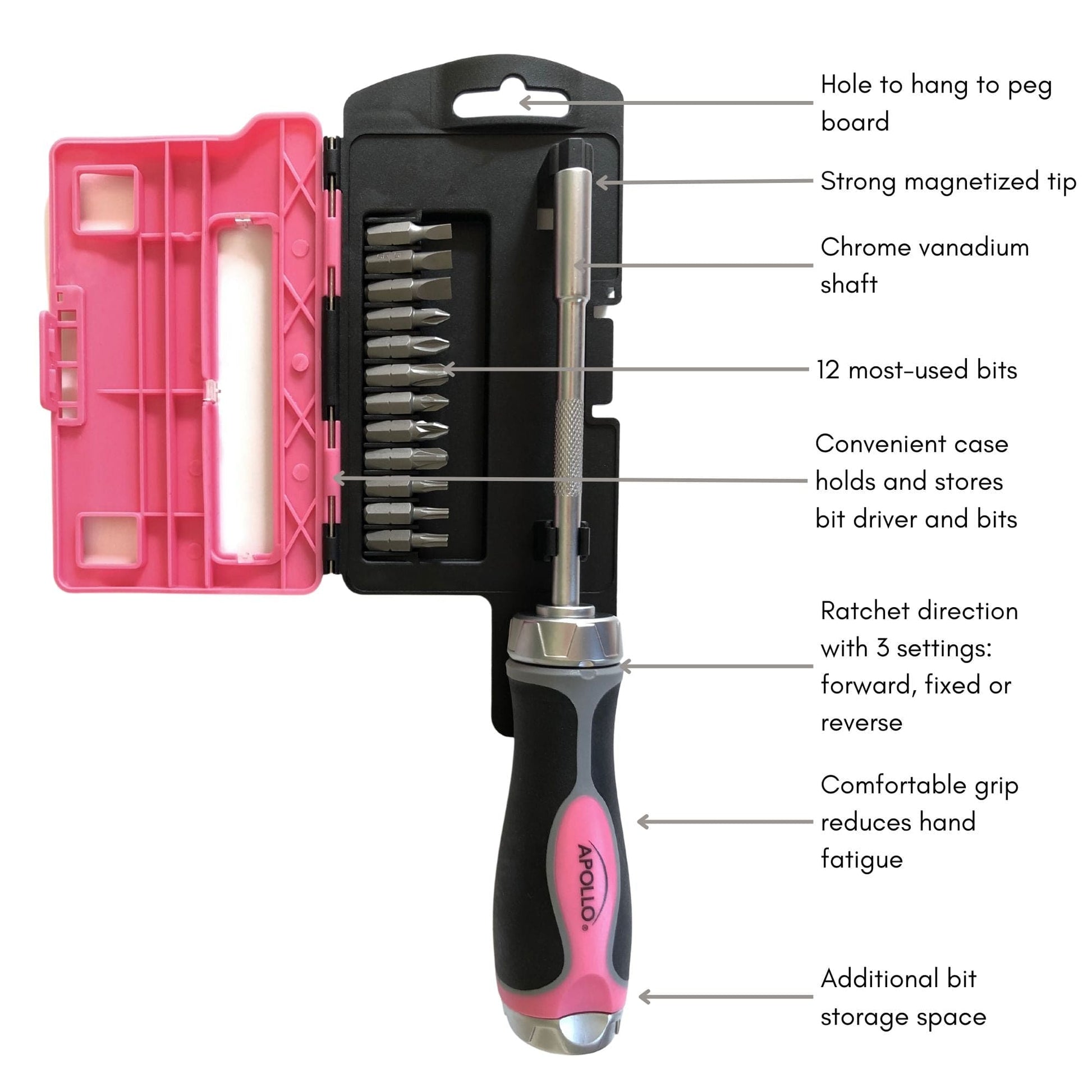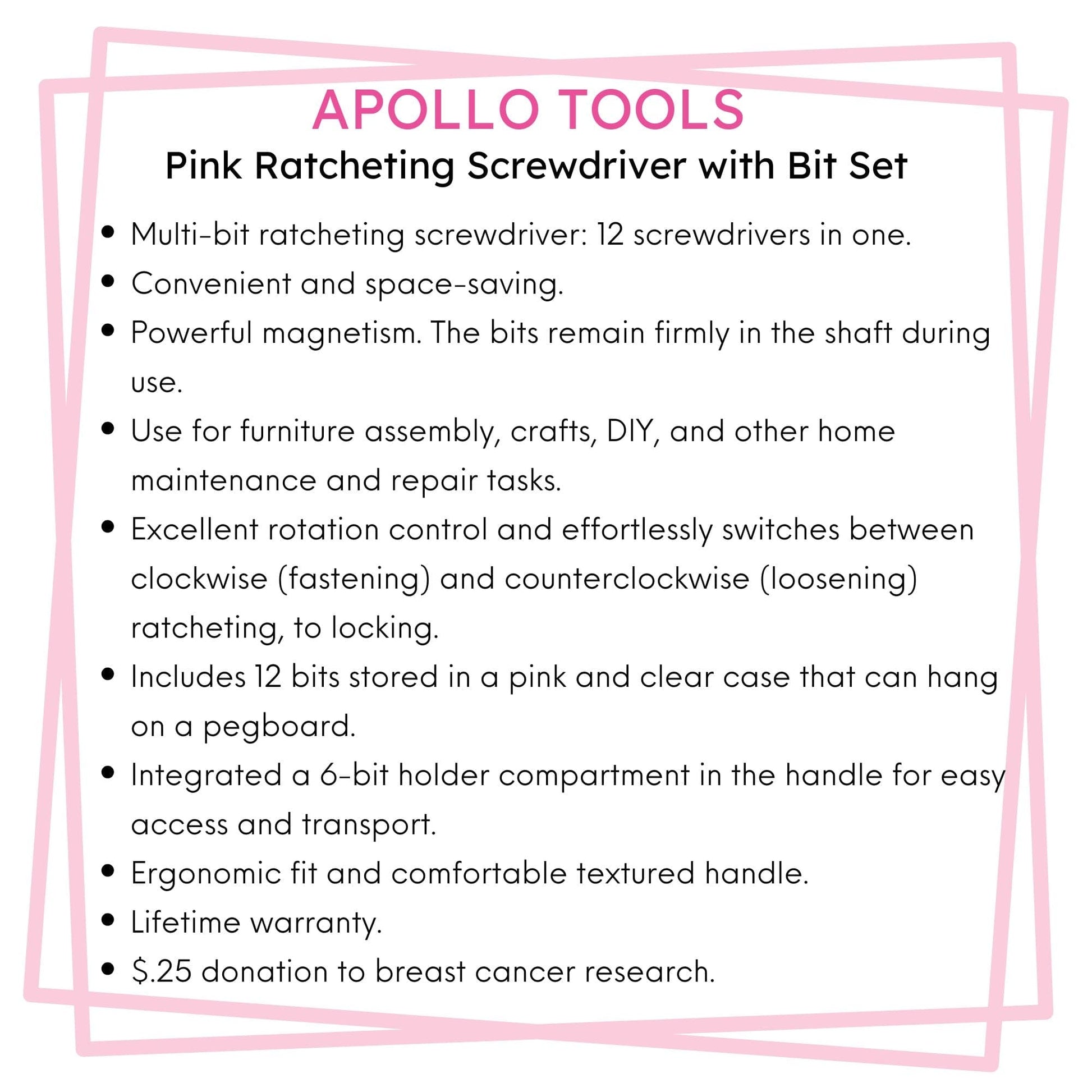 A RATCHETING SCREWDRIVER SET IN PINK. Extremely useful, a great time saver, and now in a new, beautiful pink hue, the Apollo Tools’ versatile multi-bit ratcheting screwdriver is a convenient and space-saving tool for furniture assembly, crafts, DIY, and other home maintenance and repair tasks. The ratcheting function of the bit driver makes screw-driving tasks easier. With excellent rotation control, it effortlessly switches between clockwise (fastening) and counterclockwise (loosening) ratcheting, to locking position so that it can also be used as a non-ratcheting multi-bit screwdriver). The set includes 12 bits stored in a pink and clear case, a design that keeps both the driver and bits at the ready. We’ve integrated a 6-bit holder compartment in the handle for easy access and transport. This essential ratcheting screwdriver set is a great addition to the Apollo Tools’ line of pink tools that always include a donation to the Breast Cancer Research Foundation.