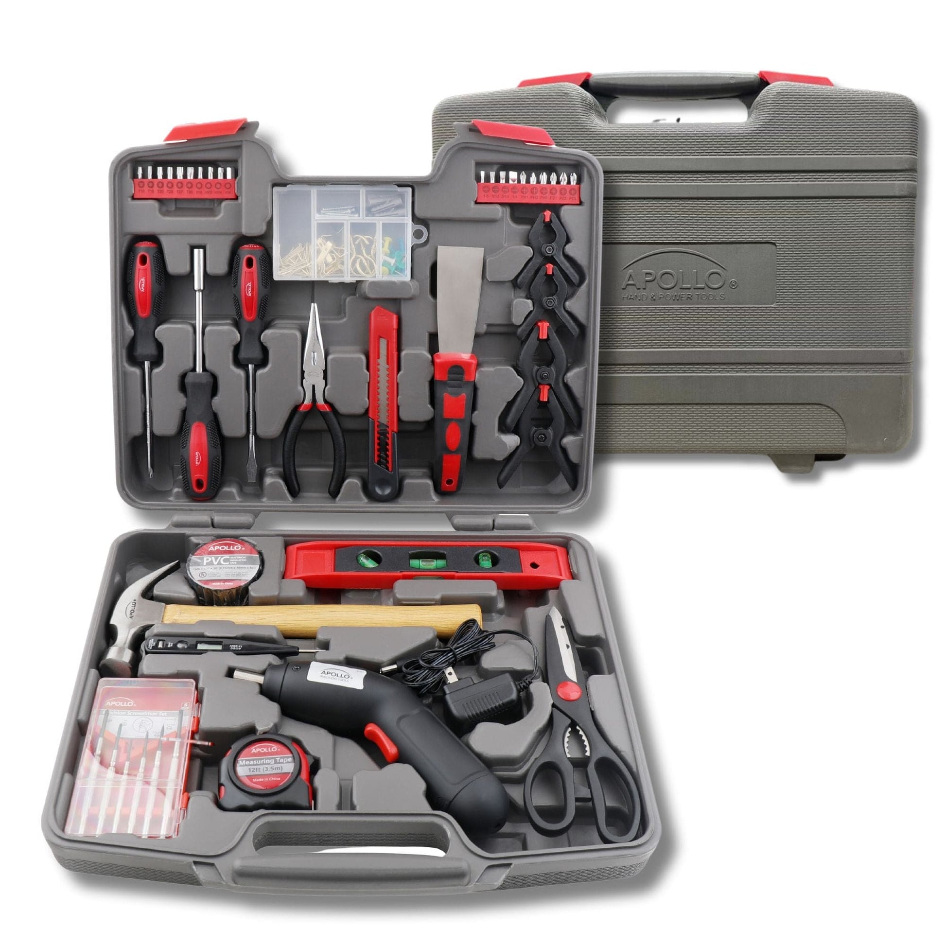 USEFUL HAND TOOLS: The set includes useful tools such as a claw hammer, long nose pliers, screwdrivers, level, tape measure, clips, scissors, knife, picture hanging kit and more.