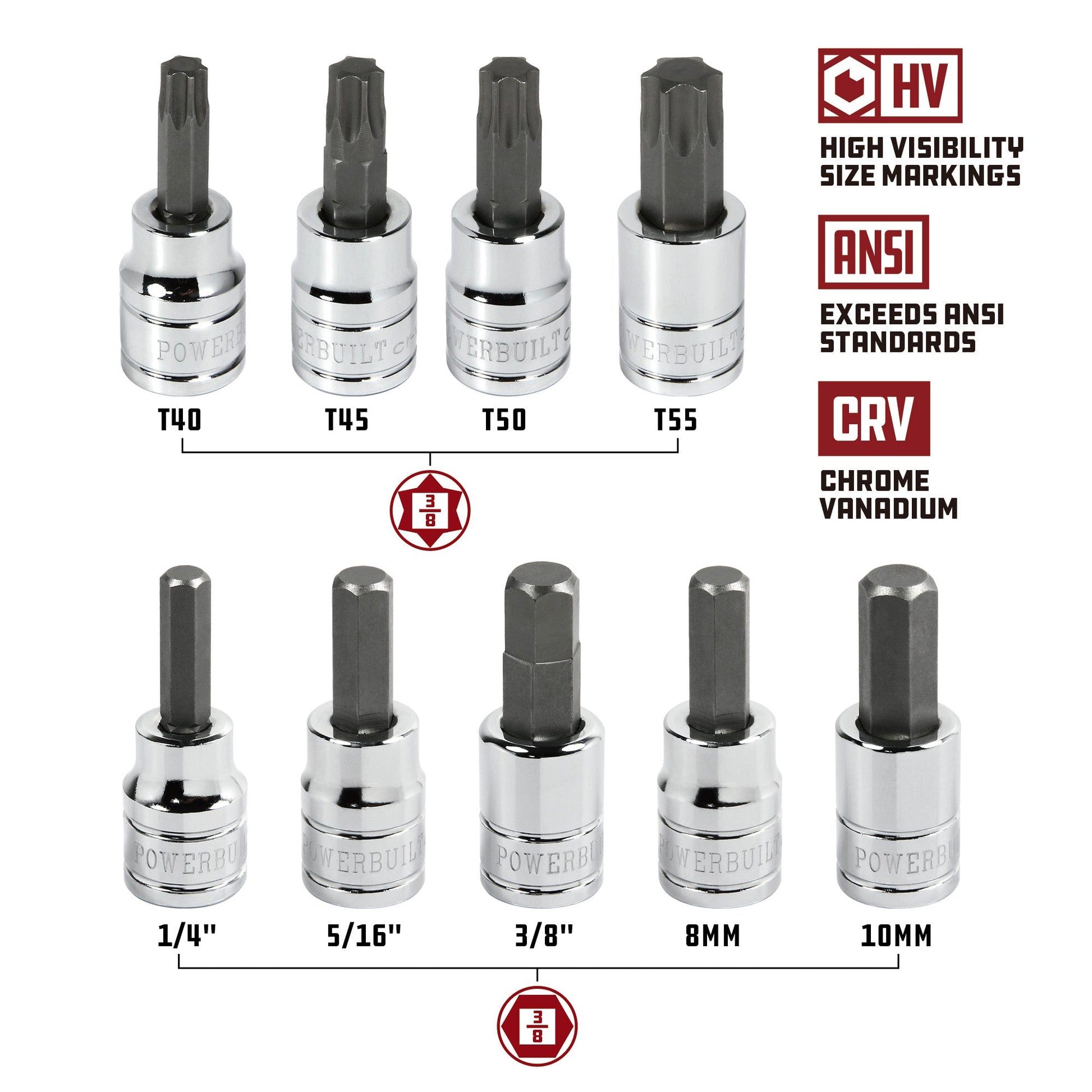 The Powerbuilt 152-piece master mechanic’s service set is a complete high-quality toolset that covers most automotive maintenance, repairs, and installations. It includes a comprehensive selection of 1/4, 3/8, and 1/2 inch drive shallow and deep sockets in both SAE and metric. The Z-Drive design sockets provide a superior grip on the fastener's flat edges preventing rounding and slippage. Includes 3 premium 72-tooth sealed head reversible ratchets made from Chrome Vanadium steel with mirror polished finish and comfortable contoured handles. The Set also includes Metric and SAE extra-long reach combination wrenches, hex keys, a pinner handle with bits, socket extensions, universal joints, and adapters. Precision-constructed tools all meet or exceed ANSI standards and have a lifetime warranty.