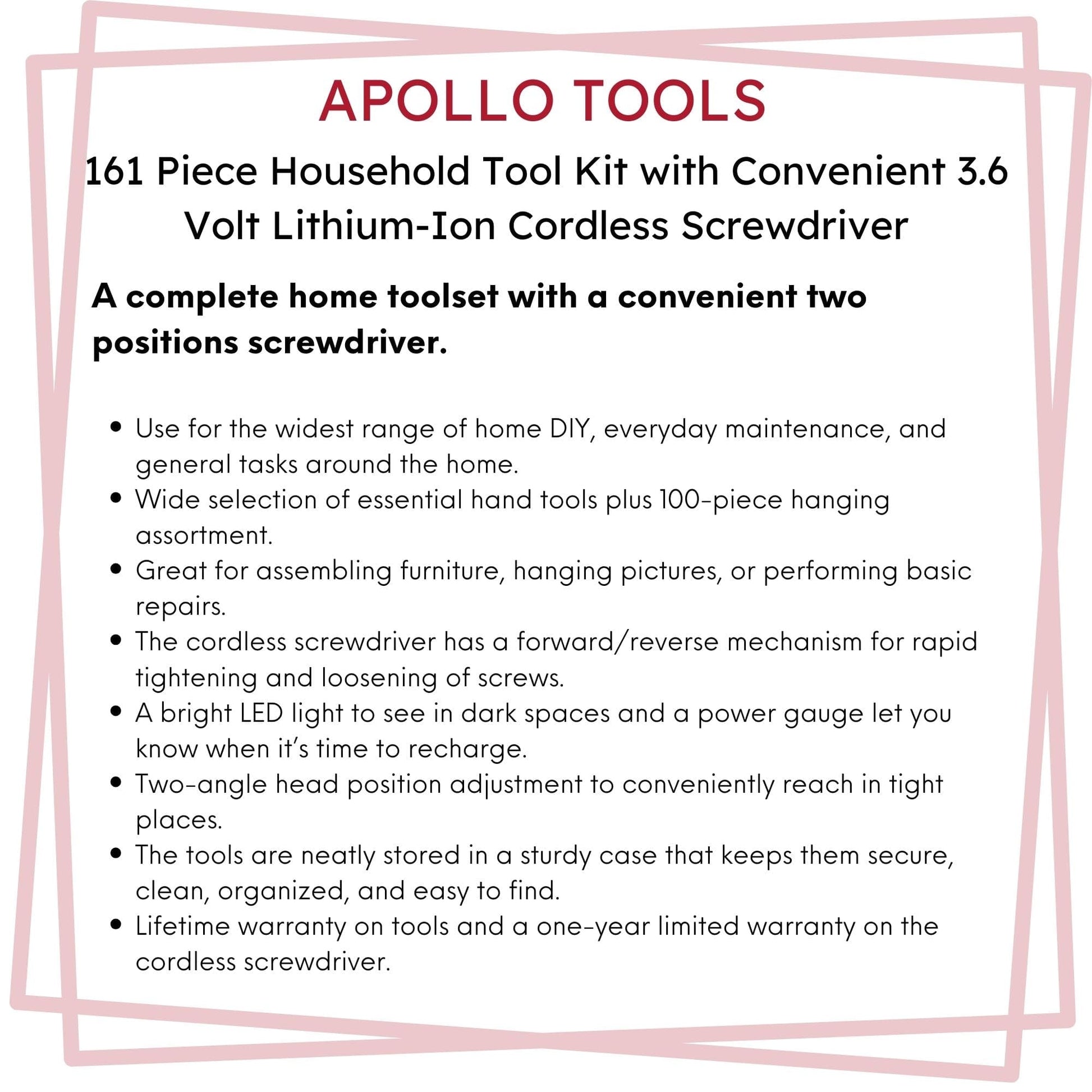 161 Piece Household Tool Kit with Convenient 3.6 Volt Lithium Ion Cordless Screwdriver - DT0739