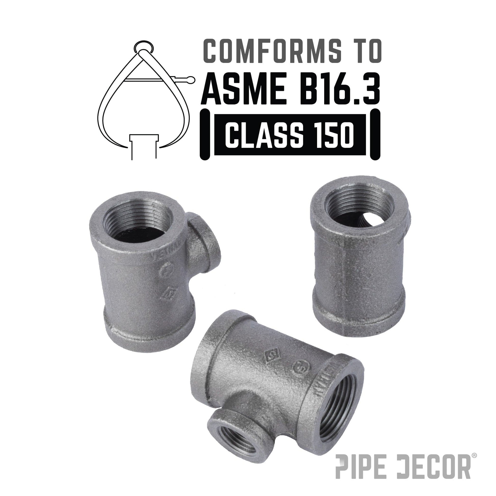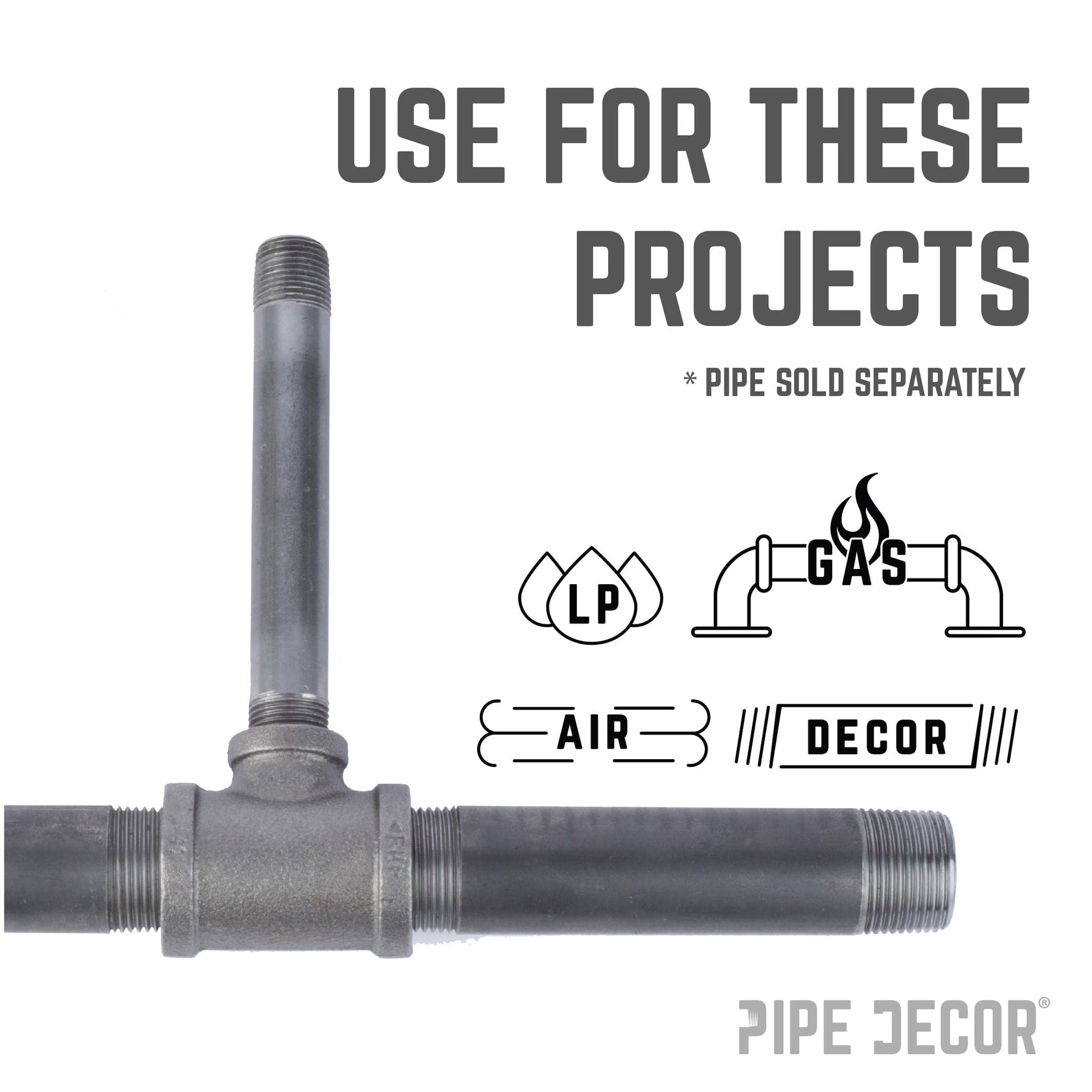Our fittings are cast iron and machined to spec and are hydrostatically tested to hold pressure. Black pipe and fittings can be used for gas, air, liquid petroleum, and home decor use. Our fittings are covered in a light grease to prevent rust. For use in home décor projects, you will need to clean and seal them.