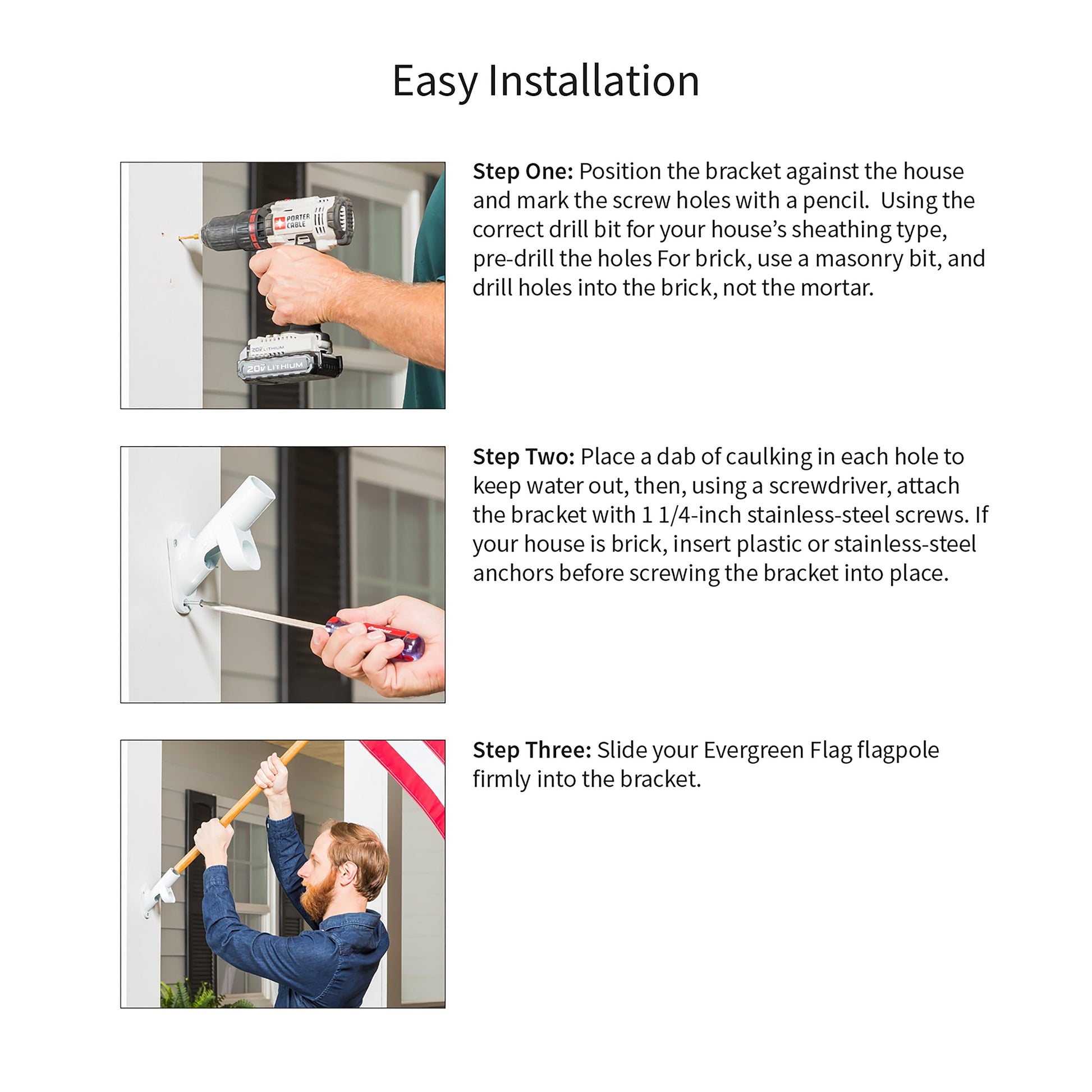 Easy to install, you can fly your flag wherever you'd like with the help of this adjustable pole bracket. Crafted from aluminum with an white finish, the two-position bracket, formed by casting, can be used as a wall mount or pole for house and estate flags. Choose between two different positions: 45-degree angle or 90-degree angle. Mounting screws are included. The hardware is powder-coated with a weather-resistant finish to ensure long-lasting use.