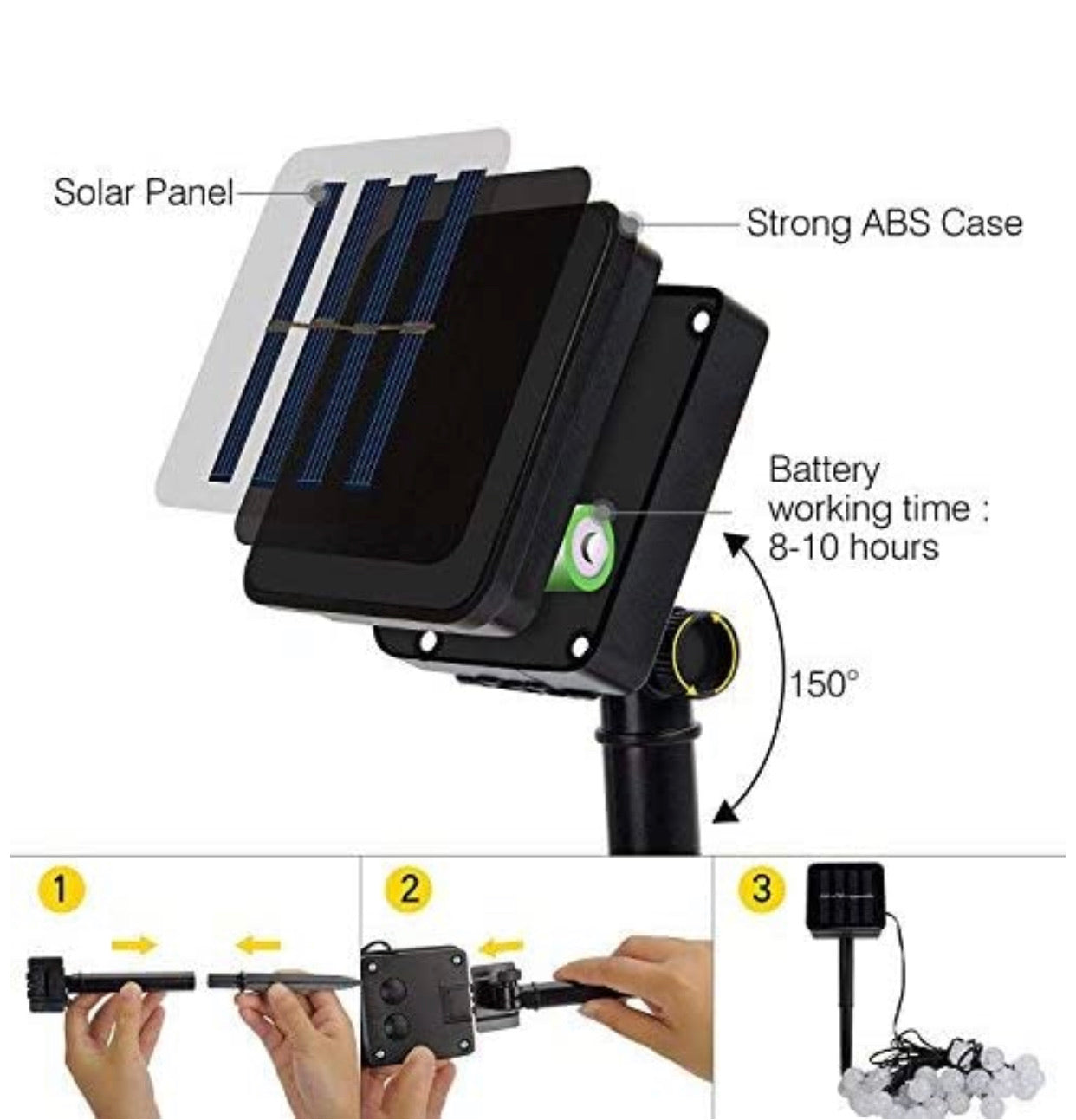 Waterproof solar panels and globe string lights can withstand all kinds of weather. Waterproof IP44, used outdoors and indoors, as long as the solar panel is full of sunlight, even after heavy rain and snow, warm and comfortable light will still be emitted. Magically decorate your wedding, houses, windows, garden plants, terraces, lawns, gardens, bistros, stairs, yards, cafes, pergola, tents, trees, porches, cabinets, bookcases, swimming pools, pavilions and parties, etc.