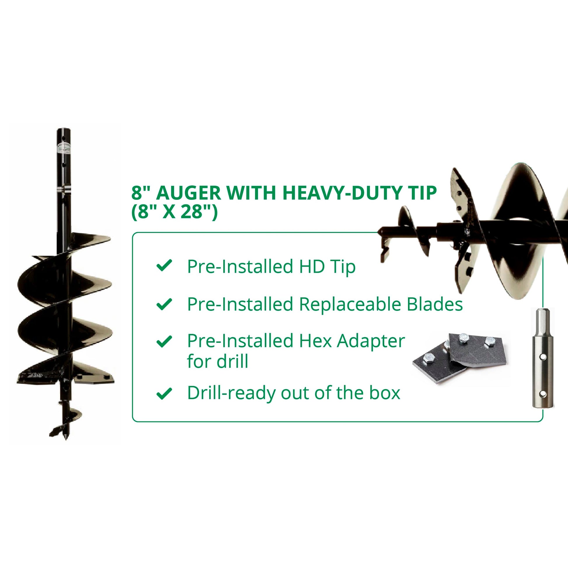 This 8 Inch Auger is also great for digging post holes or for planting several bulbs into a single hole. This model was recently upgraded with our virtually indestructible and replaceable heavy-duty tip. This large garden auger measures 8 inches in diameter by 28 inches long, designed with a heavy-duty, 1.25-inch center shaft made entirely from steel, 12 inches of rugged, 10-gauge double flighting, and a glossy black paint finish.