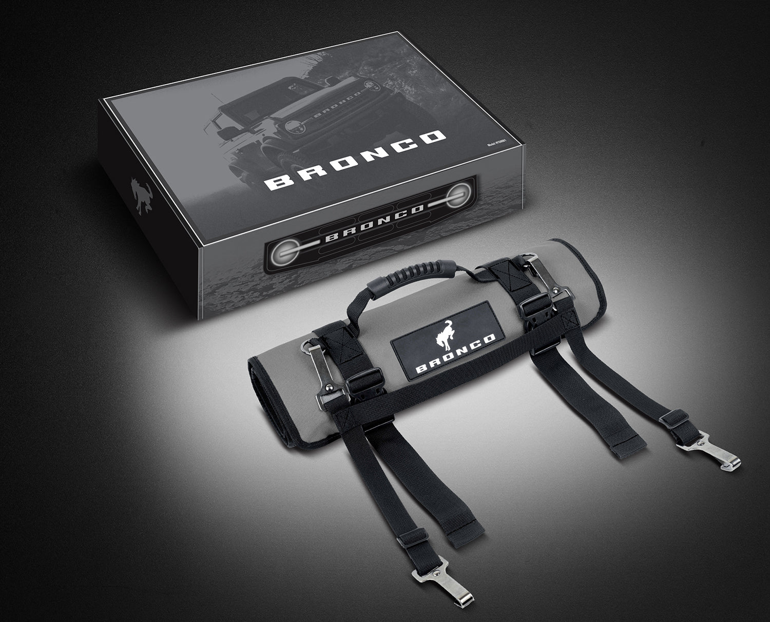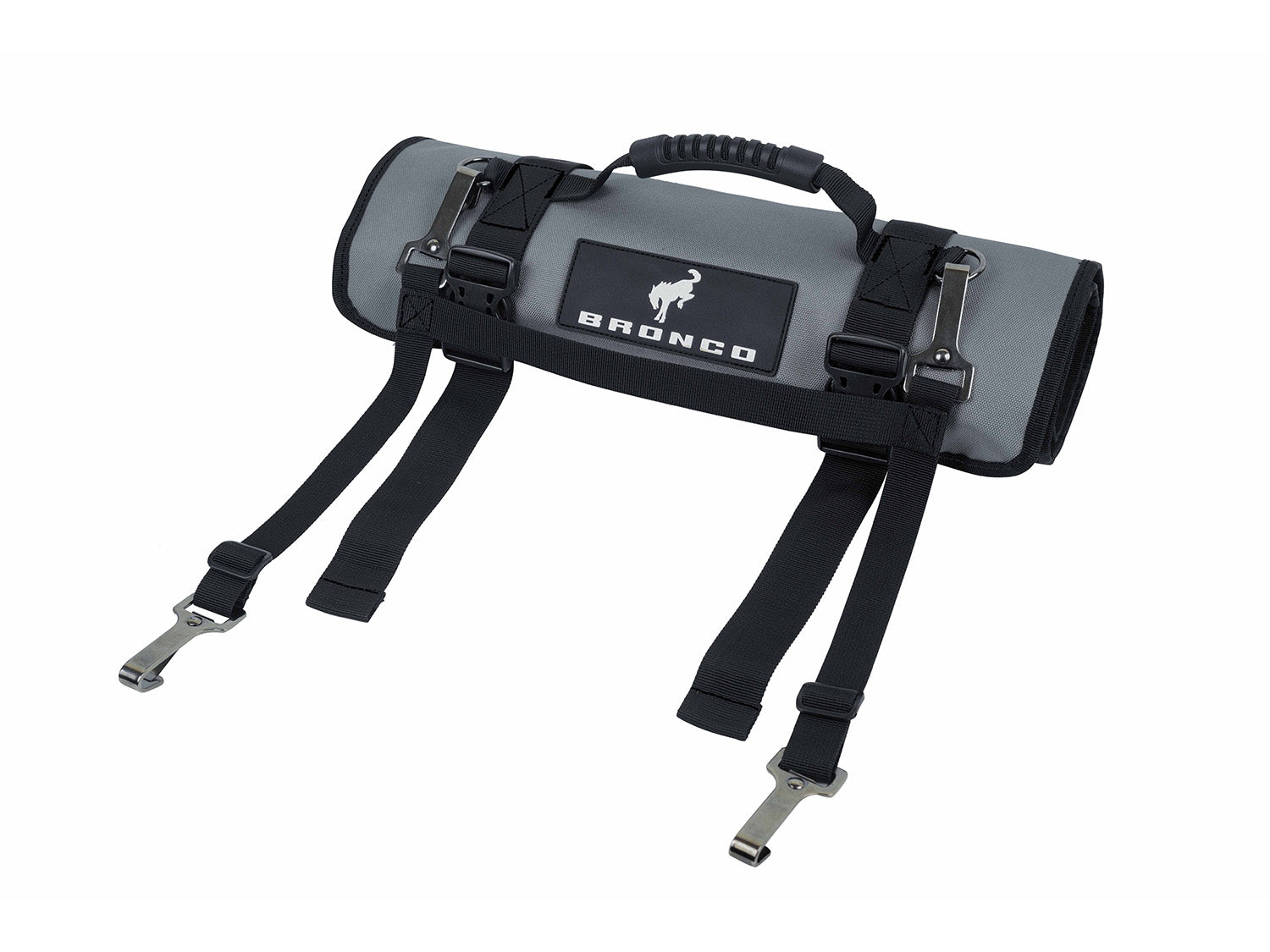 - REQUIRED ACCESSORY: The Ford Bronco OEM Tool Kit Roll is an 84 piece tool kit roll that stores easily under the rear seat or in the rear storage area. The bag is loaded with premium quality curated tools to perform vehicle maintenance or common trail repairs on the go. The tool roll contains a variety of combination wrenches to 1/4-inch, 3/8-inch, drive sockets, and rachets, to a 1/2-inch breaker bar, pliers, drivers, hex, torx keysets, adjustable wrench, trim tool, wire, tape, zip ties, and even a stout Ball Pein hammer for some trail side engineering.