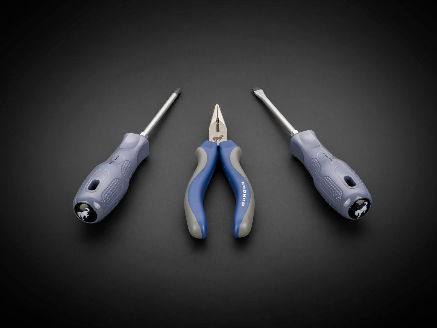 The 84-piece Bronco tool kit has everything Bronco owners need, from basic vehicle maintenance to trail fixes. The tool kit includes a variety of combination wrenches, 1/4-inch, 3/8-inch, drive sockets, and rachets, a 1/2-inch breaker bar, pliers, drivers, hex, torx keysets, adjustable wrench, trim tool, wire, tape, zip ties, and even a stout Ball Pein hammer for some trail side engineering. All this and more are stored securely and quietly within a sturdy nylon roll with dedicated sewn pockets and two zippered pouches. Tools are premium chrome vanadium steel for strength and durability. The tools have polished chrome or industrial black phosphate for corrosion resistance. All tools meet or exceed ANSI standards, and all Bronco branded tools have a lifetime warranty.