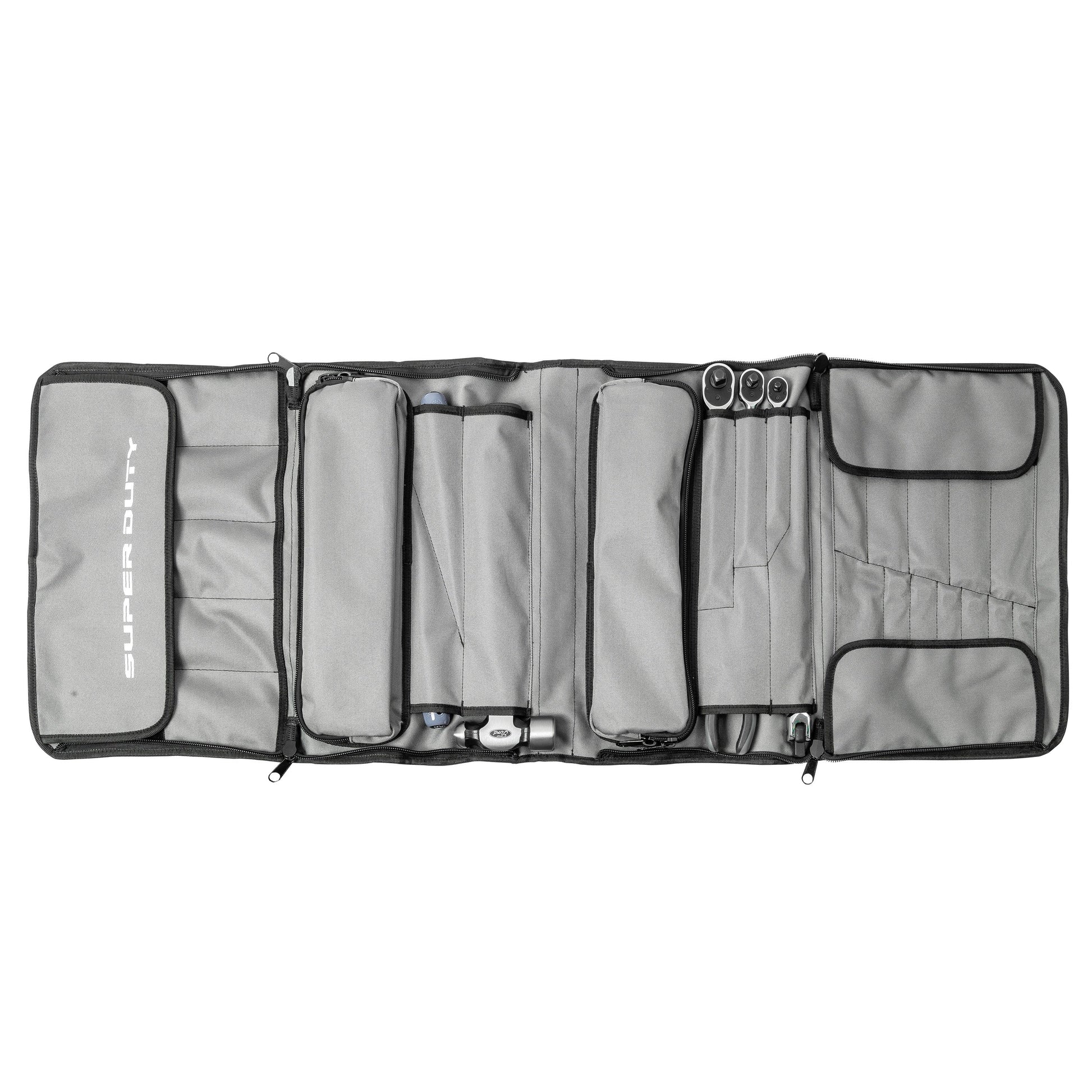 - REQUIRED ACCESSORY: The Ford Super Duty OEM Tool Kit is a 97-piece tool kit specifically designed for Ford Super Duty trucks. It comes in a sturdy tri-fold bag that stores easily under the seat, behind the seat, or in the truck bed. The specially designed bag is loaded with premium tools to perform vehicle maintenance or common roadside repairs on Ford SuperDuty trucks. The tool kit contains a combination wrenches to 1/4-inch, 3/8-inch, and 1/2-inch drive sockets, sealed head ratchets, to a 1/2-inch breaker bar, pliers, drivers, hex, Torx keysets, adjustable wrench, trim tool, wire, tape, zip ties, and Ball Pein hammer.
