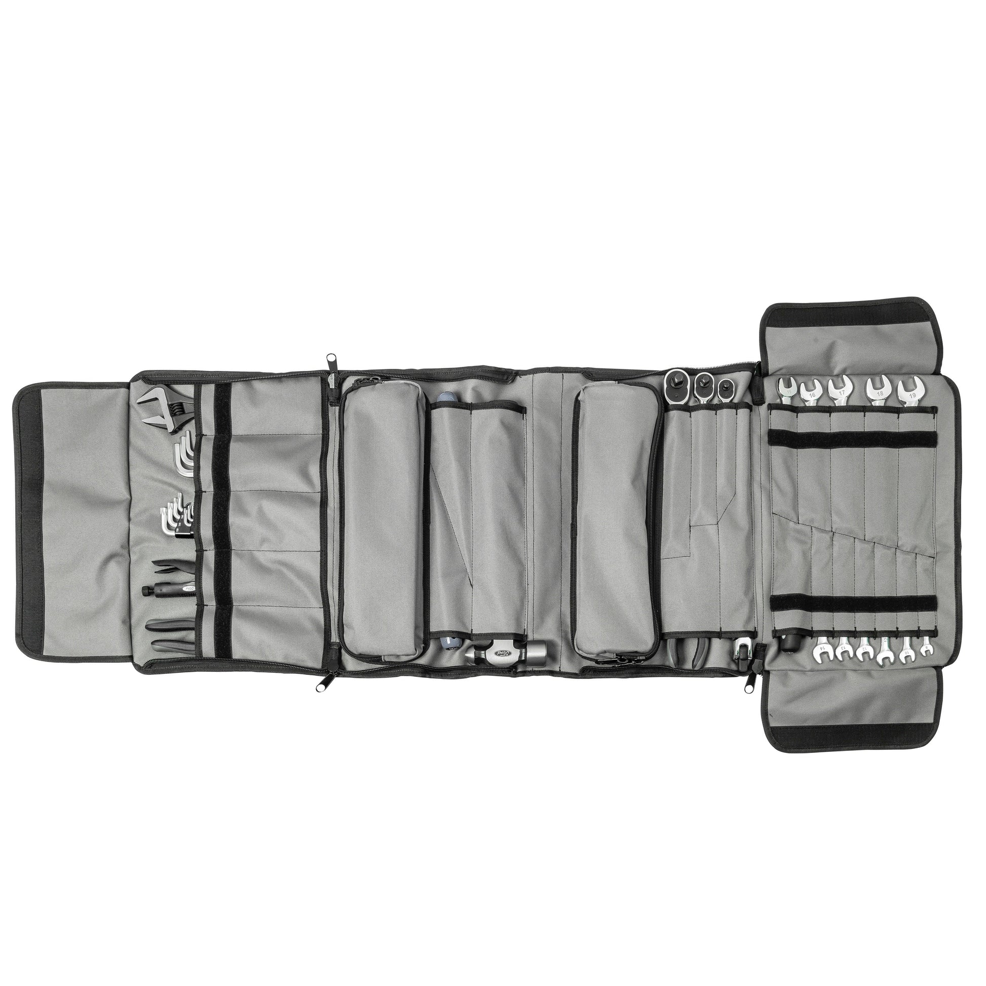 - EASY STORAGE: The tri fold bag is durable polyester with included retention straps and a comfortable rubberized carry handle; each tool has its place with specific stitched pockets and zippered pouches, keeping this 97-piece tool set organized, quiet, and protected; stores under the seat, behind the seat, or truck bed