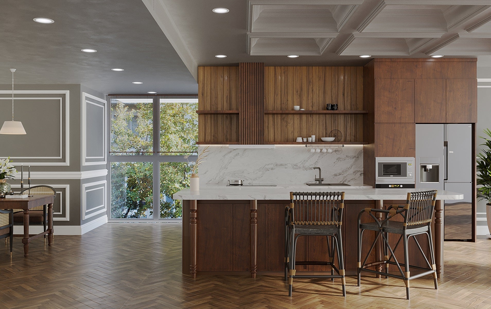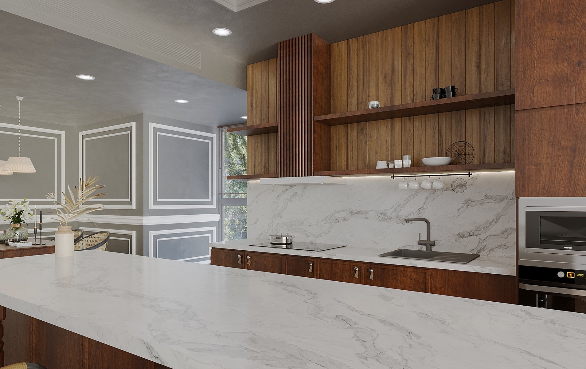 Channeling the beauty of Calacatta marble, Vicostone Amarcord boasts a distinct pattern of bold and fashionable brown-grey veins on a crisp white background - a truly one-of-a-kind design.