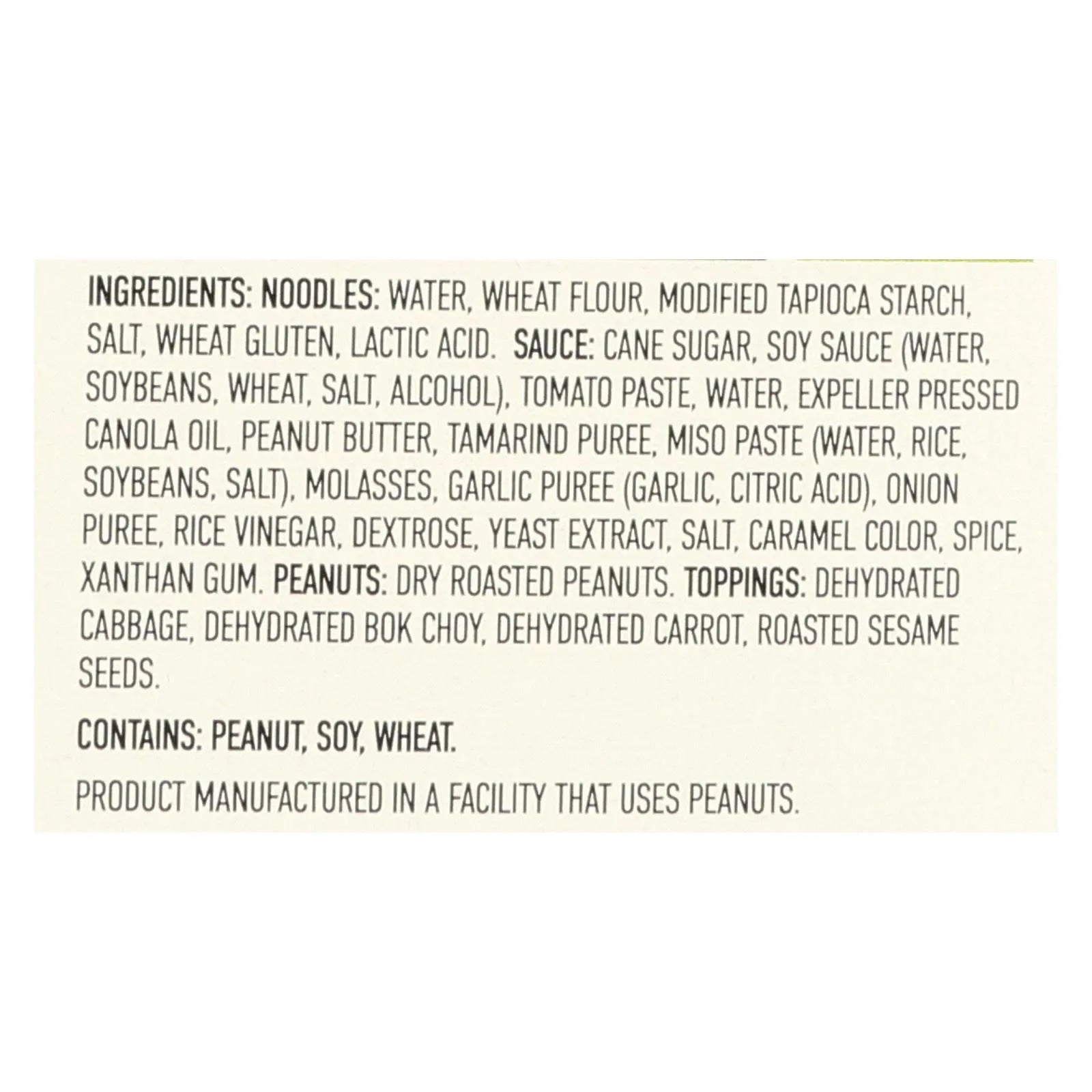 ingredients : noodles: water;wheat flour;modified tapioca starch;salt;wheat gluten;lactic acid. Sauce: cane sugar;soy sauce;water;soybeans;wheat;alcohol;tomato paste;expeller pressed canola oil;peanut butter;tamarind puree;miso paste;rice;molasses;garlic puree;garlic;citric acid;onion puree;rice vinegar;dextrose;yeast extract;caramel color;spice;xanthan gum. Peanuts: dry roasted peanuts. Toppings: dehydrated cabbage;dehydrated bok choy;dehydrated carrot;roasted sesame seeds