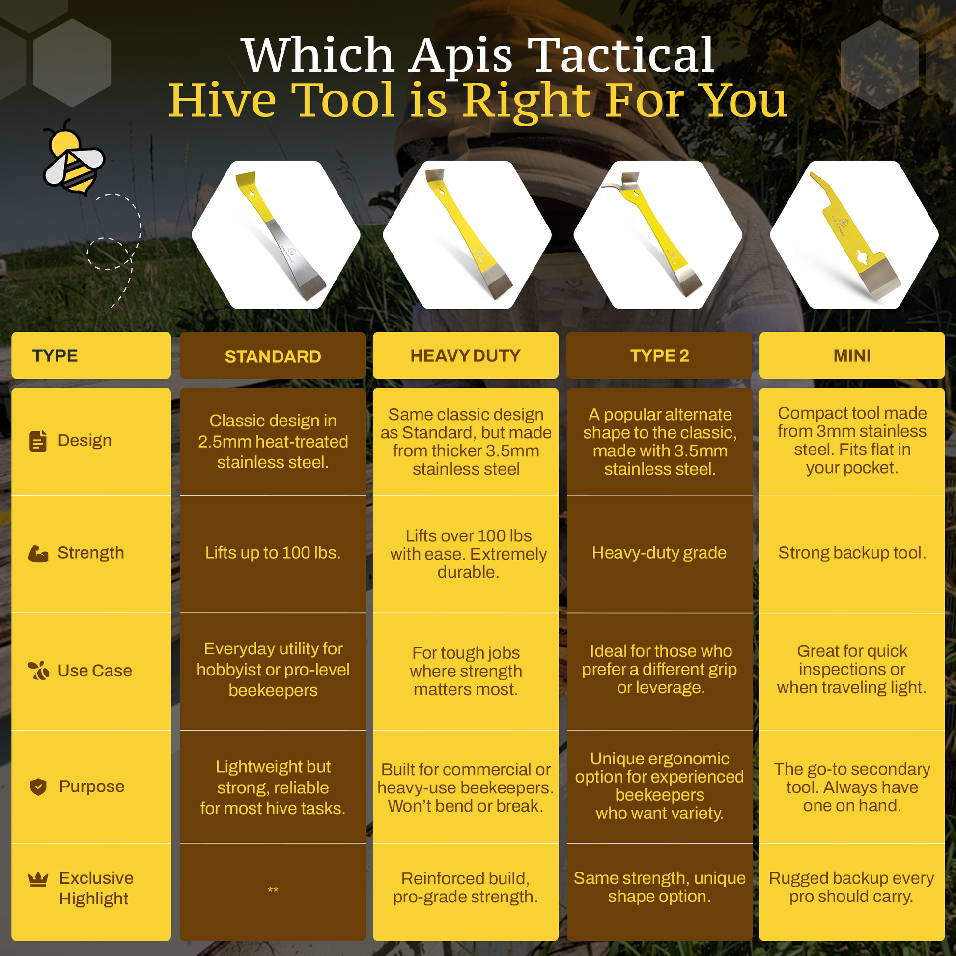 - Versatile & Reliable: Designed for various tasks, this hive tool excels at prying apart bee hive frames and scraping off excess wax and propolis. Whether you're a seasoned bee keeper or just starting out, the Apis Tactical Hive Tool provides the versatility needed to manage your bee hive tools with ease, making it an essential addition to your bee supplies