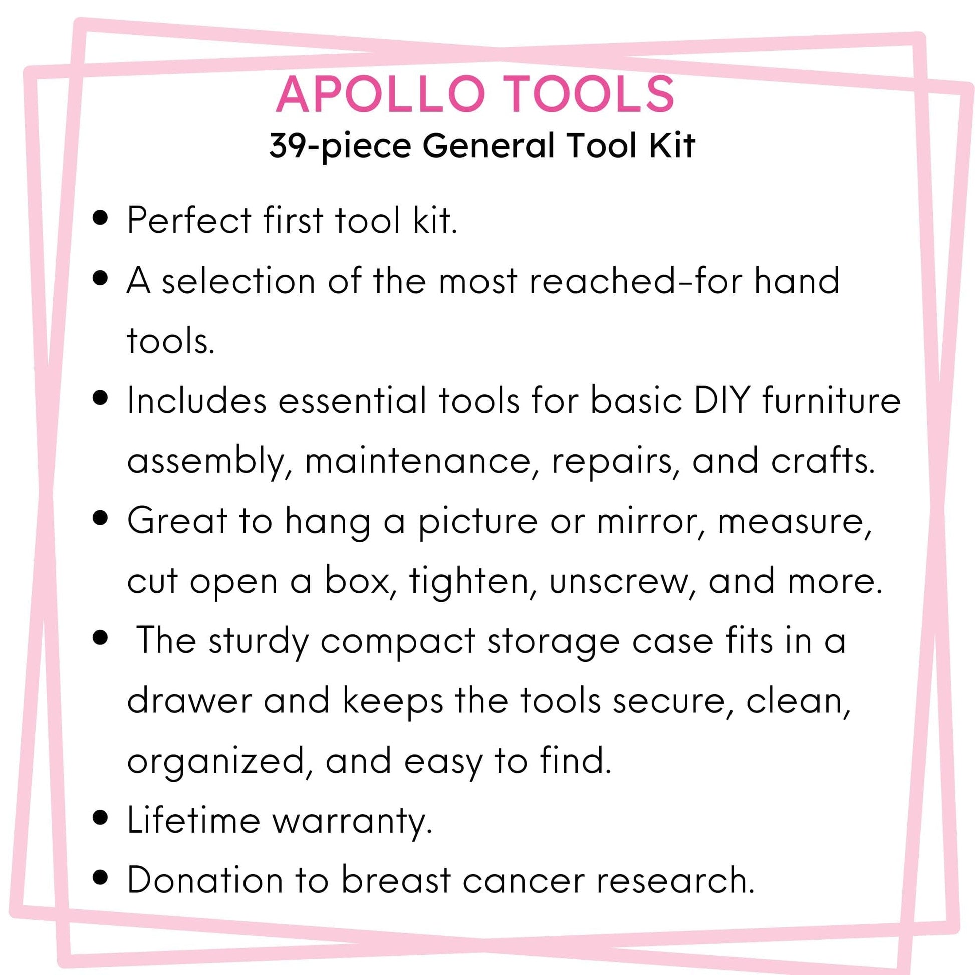 Apollo Tools New and Improved 39 Piece General Pink Tool Set in Storage Case for DIY Everyday Home Maintenance and Repairs- DT9711P