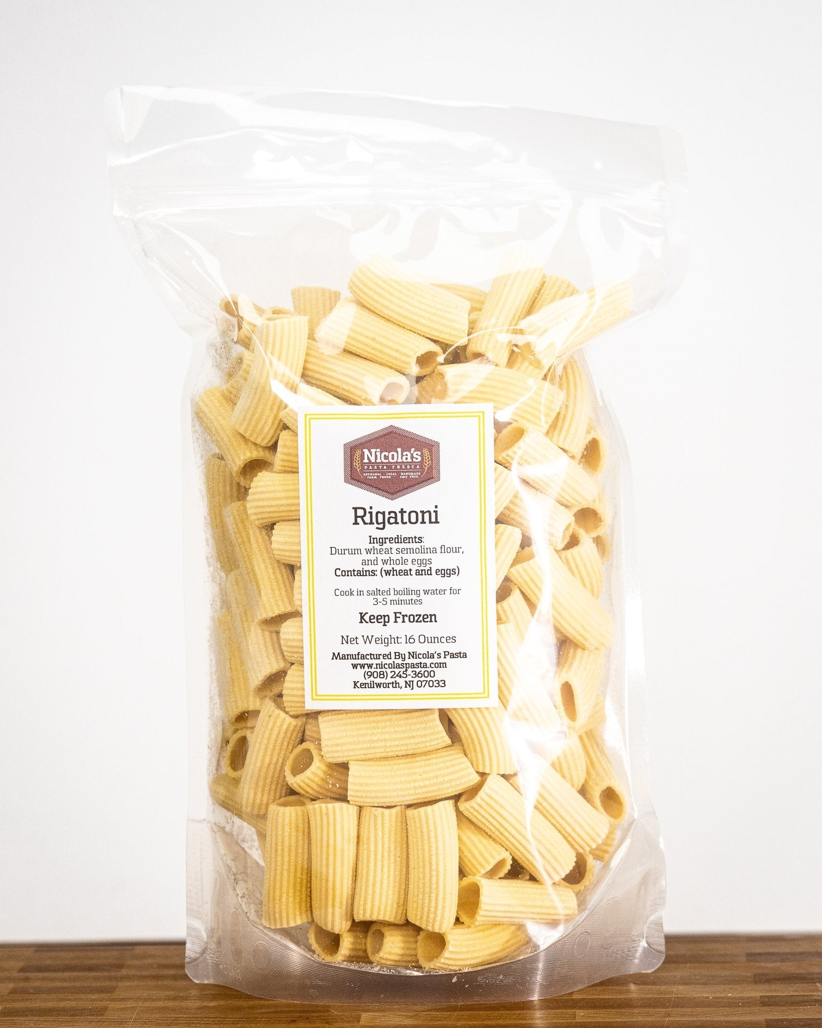 Enjoy the boldest flavor from our pasta menu with our dairy-free Rigatoni Pasta. Made in traditional Italian style with freshly sourced organic eggs and semolina flour sourced directly from Italy. It’s perfect for dinner or to gift someone and great for anyone who is lactose-intolerant. The ridges and holes in rigatoni make it great for pairing with any sauce, from creamy or cheesy to chunky meat sauces. It’s made fresh to order and flash frozen to retain freshness, hence it contains no preservatives.
