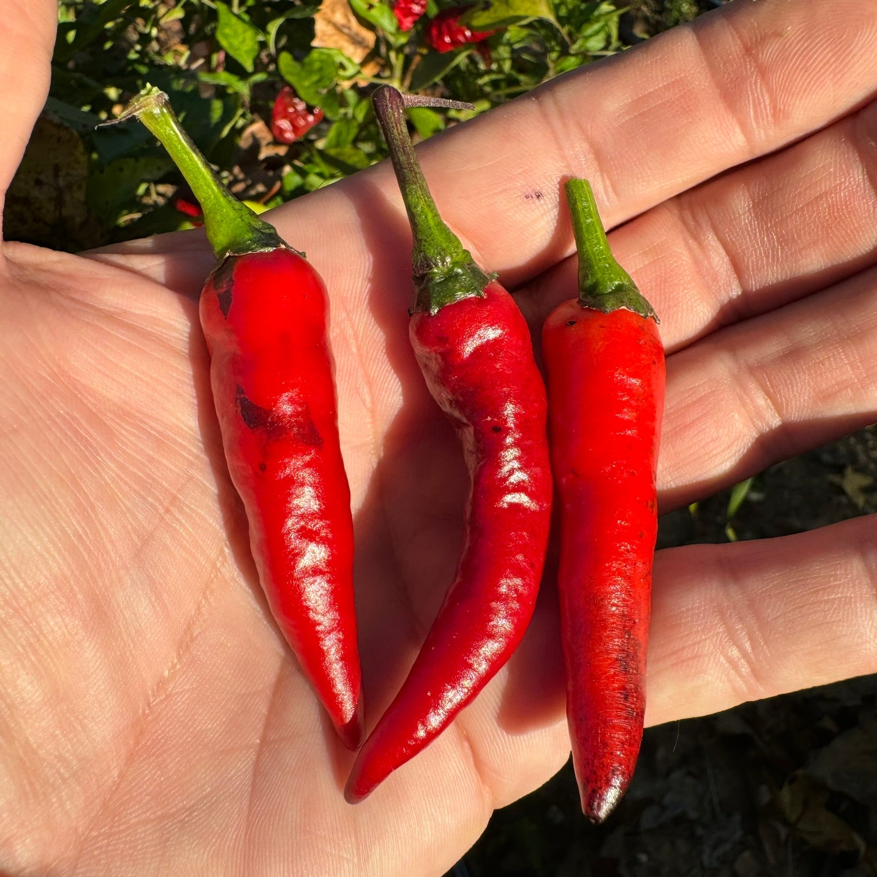 The Purple Cayenne pepper is a slender and elongated chili variety. Typically measuring 2 to 3 inches in length, it features a conical shape and ripens from green to a rich purple hue and finally to a fire red. This pepper packs a moderately spicy punch. Its thin walls make it ideal for drying, grinding into pepper flakes, or adding a vibrant touch to dishes. Known for its distinctive color and heat, the Purple Cayenne pepper is a flavorful choice for those seeking a spicy culinary experience. Exceptionally edible ornamental pepper is probably the most beautiful of the many Cayenne varieties.