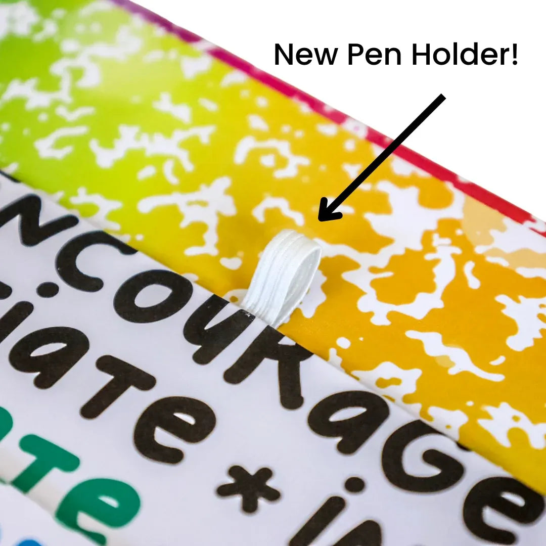 This stylish and functional Clipfolio features a vibrant retro-inspired design that blends nostalgia with modern flair. The eye-catching rainbow-colored composition notebook pattern adds a playful yet professional touch, making it perfect for teachers, students, and anyone who loves a pop of color in their organization tools.