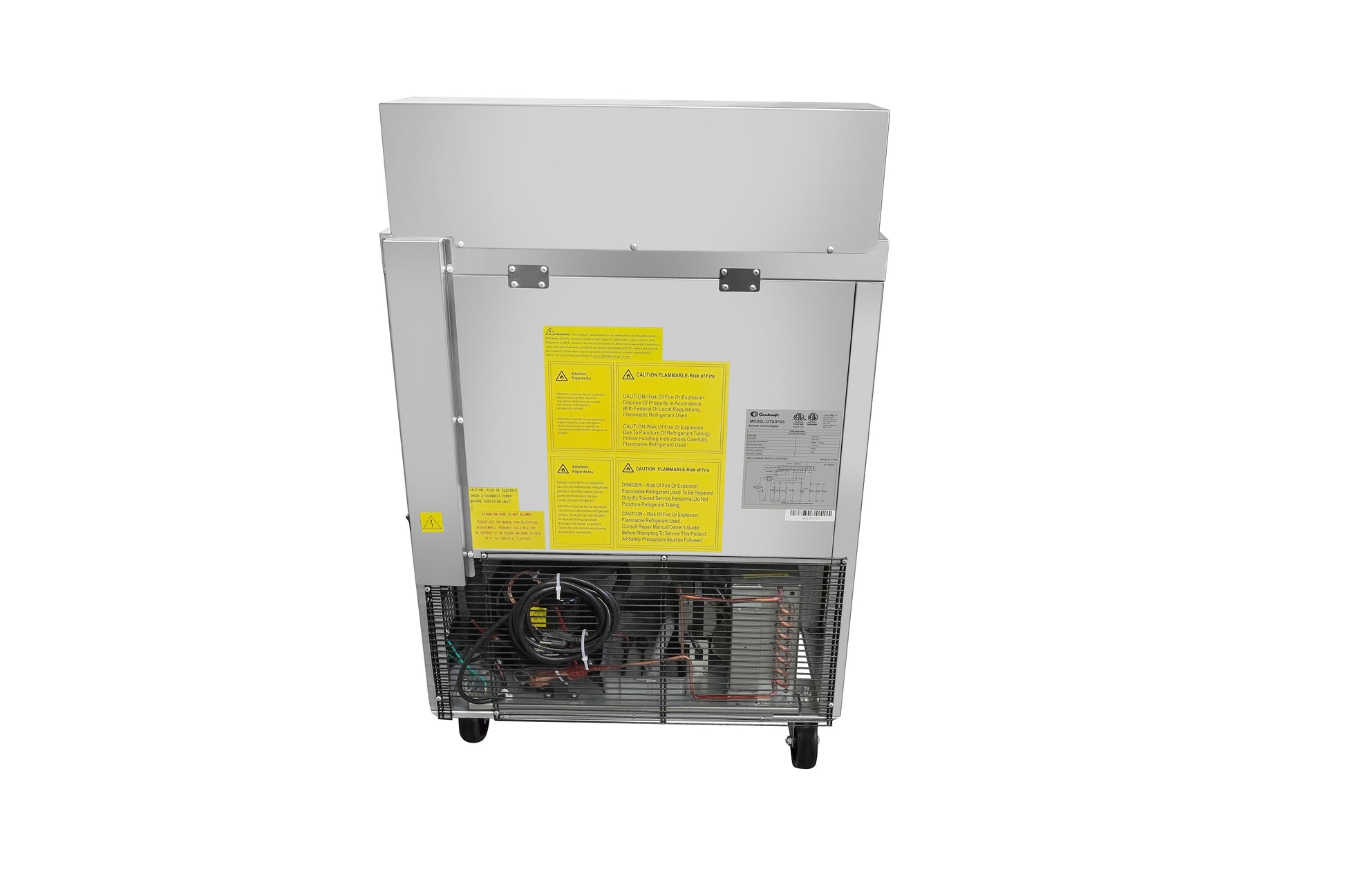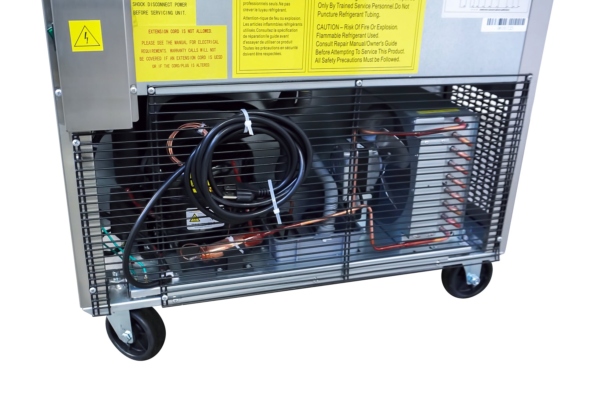 . Stainless Steel interior and Exterior with 8 pan capacity. Self-Closing· Reversible Doors. Magnetic Sealing Strip, Easy Removal. Lock and Key. Digital Thermostat. Automatic Defrost Cooling System. Internal LED Light. Lockable Caster's