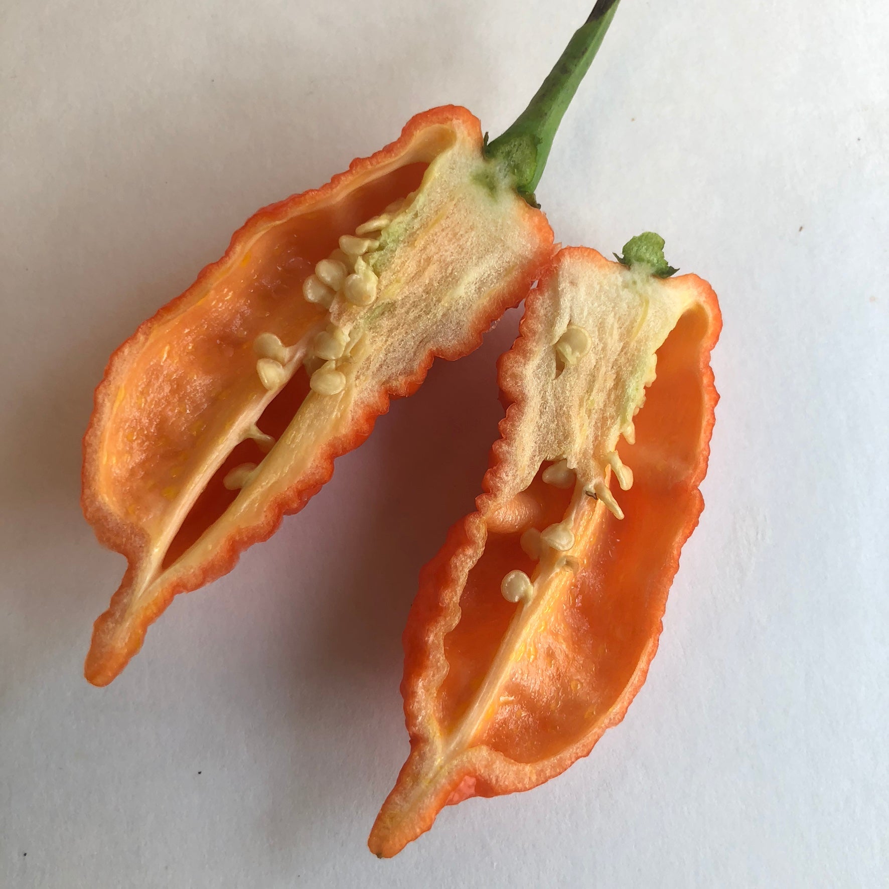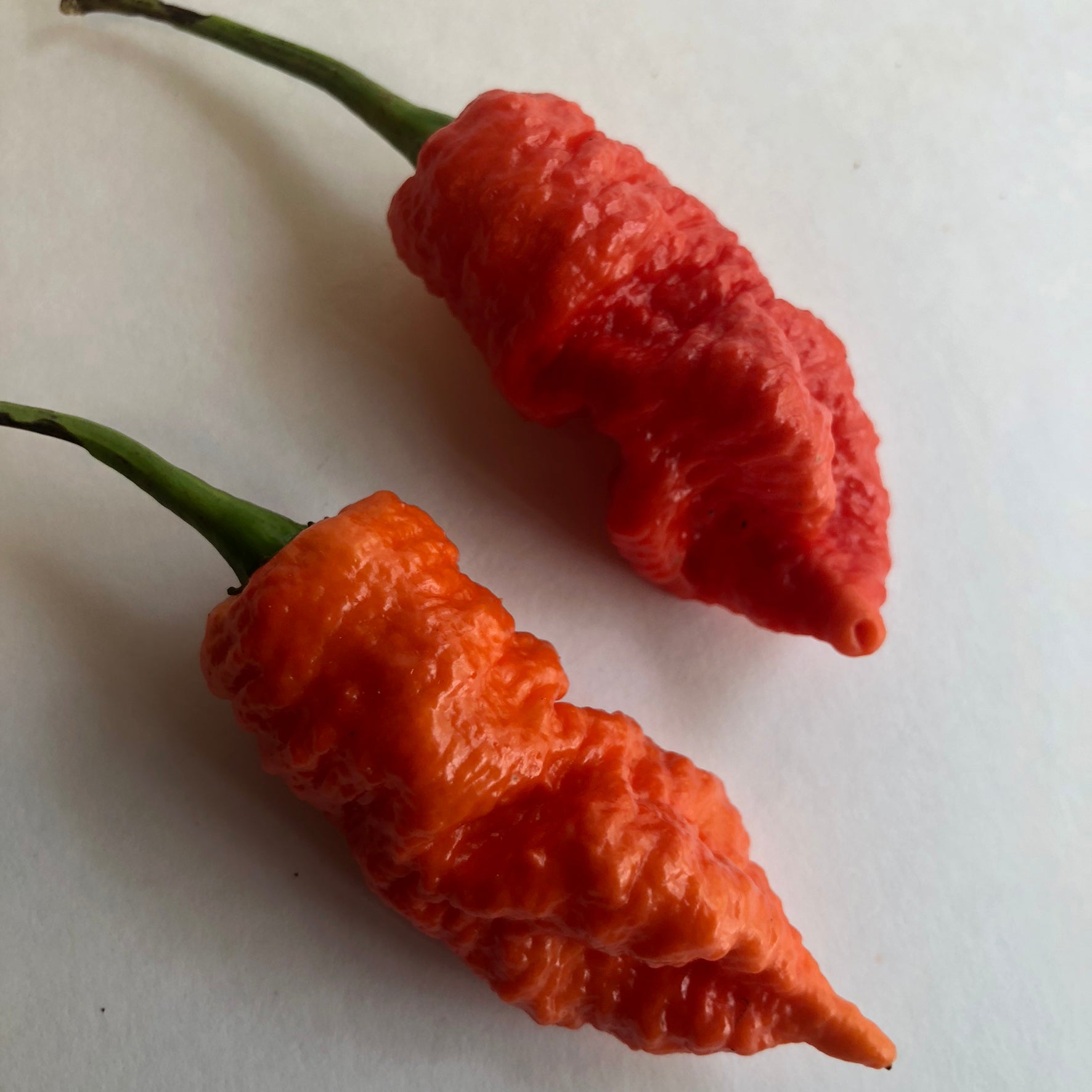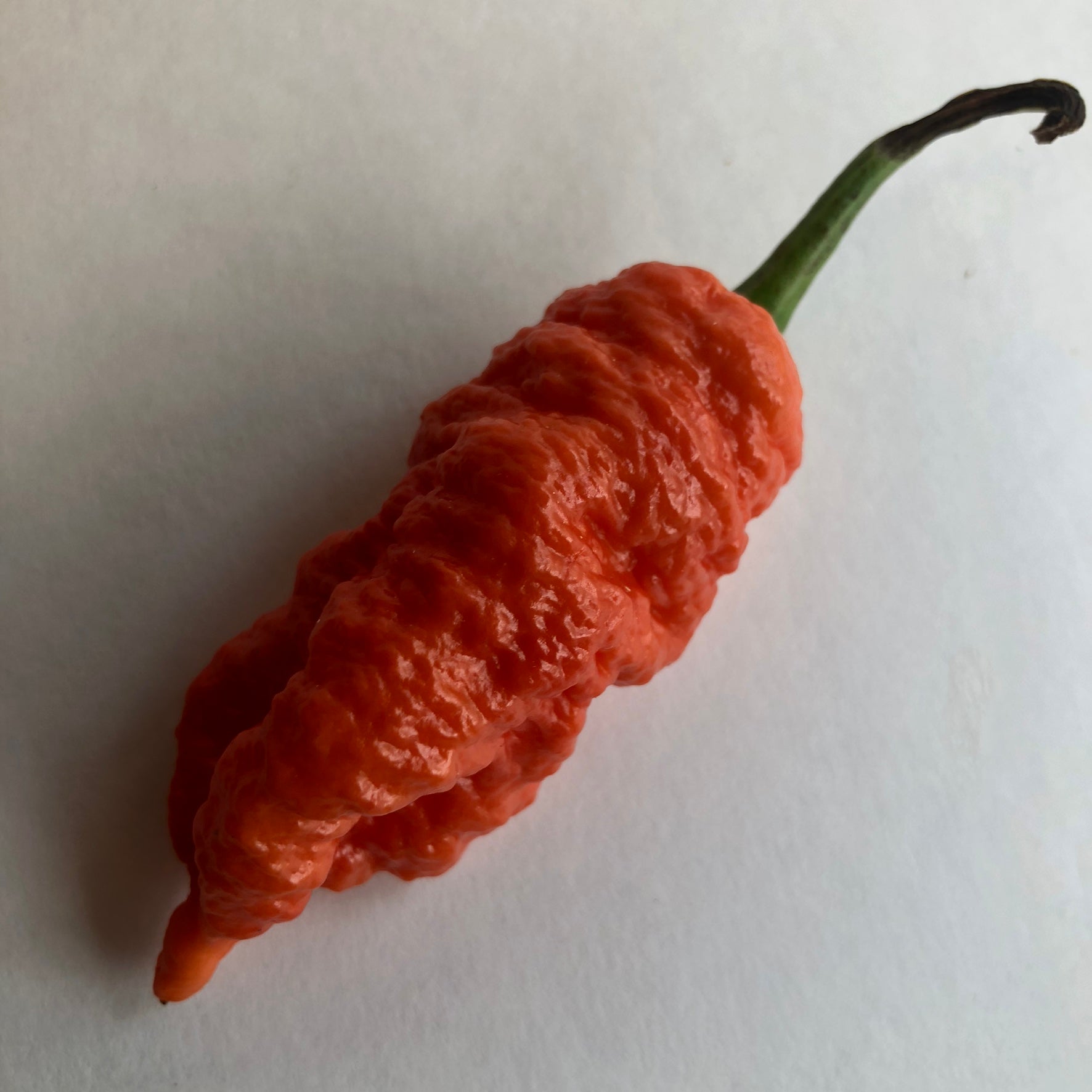The Death Spiral or Death Pepper is a variant of the Naga Bubblegum Red cross from the United Kingdom originally made by grower Terry Smith. It has a very bumpy spiral ridge pattern all around the pod. They ripen from light green to peach then to orange and finally red. The pepper has a very quick burn and is hotter than most Naga types. Consistency is not proven yet but most of the pods from what we grew for seeds produced a very consistent shape.