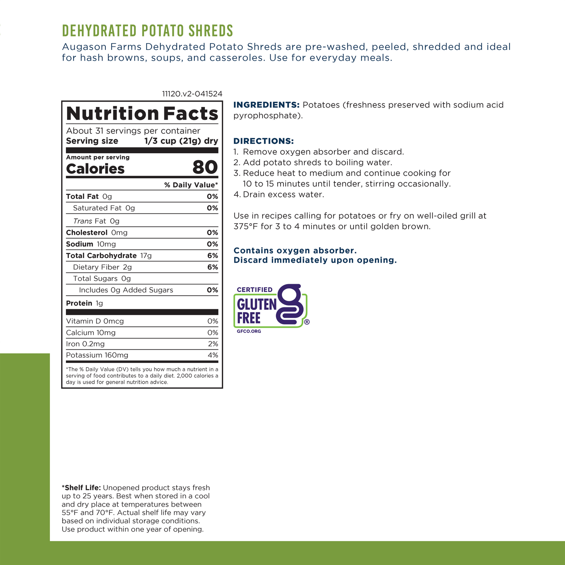 Augason Farms Potato Shreds make it easy to whip up hot, crispy hash browns, comforting casseroles, and hearty soups anytime you need. No washing, peeling, or shredding required. Prepped and ready to go, they’re a good source of vitamin C and perfect for everyday meals or long-term emergency storage. Just rehydrate and cook.