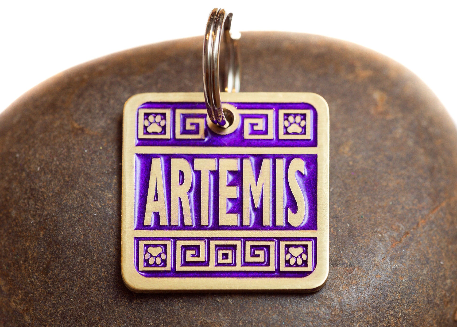 This Greek style ID tag measure about 1.1 inches (27mm) and comes customized with your pet's name and information. This tag is made from brass, which has a gold color. These tags are individually configured to ensure your pet's name is placed beautifully within the design. That said, expect some minor variance from what's pictured in the listing images.