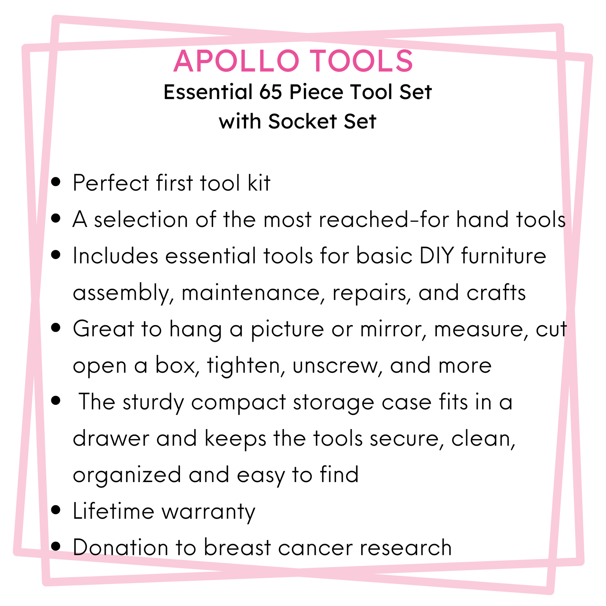 Essential 65-Piece Pink Tool Set with Socket Set and Most-Used Tools for Do it Yourself Repairs and Maintenance - DT0001P