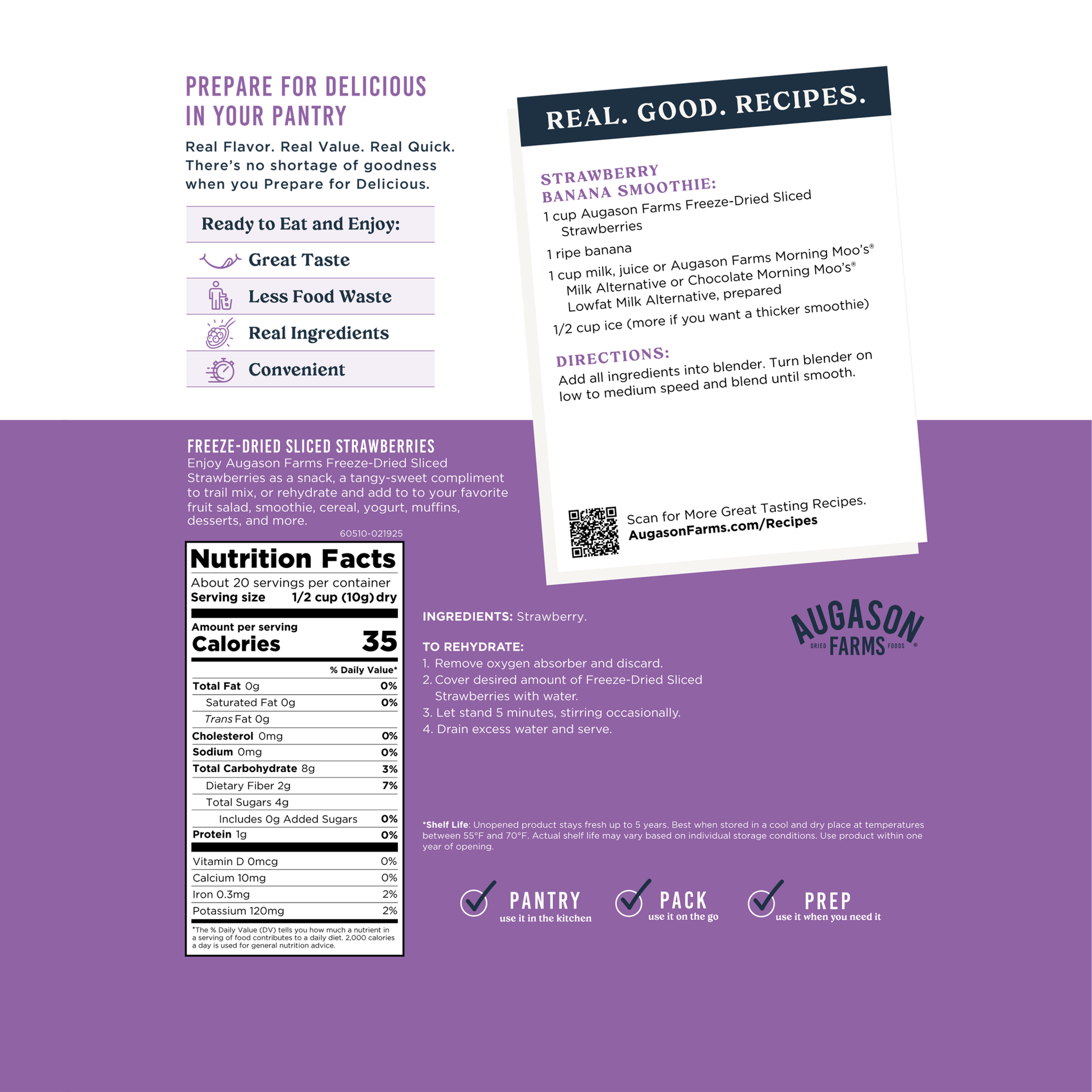 Freeze-Dried Sliced Strawberries are packed with Vitamin C and can be enjoyed as a snack right out of the can or reconstituted with water to use in desserts like strawberry shortcakes, milkshakes, and tortes.