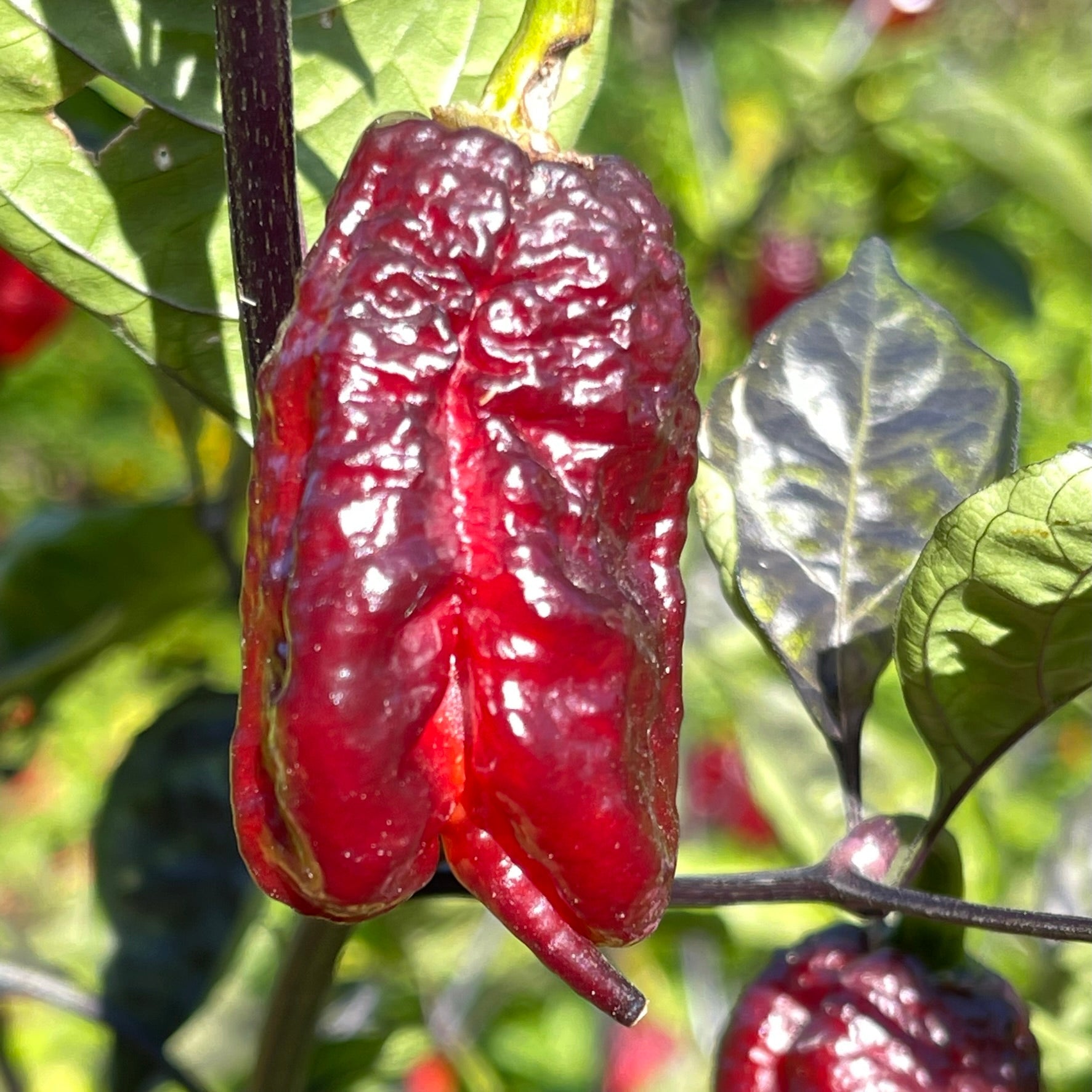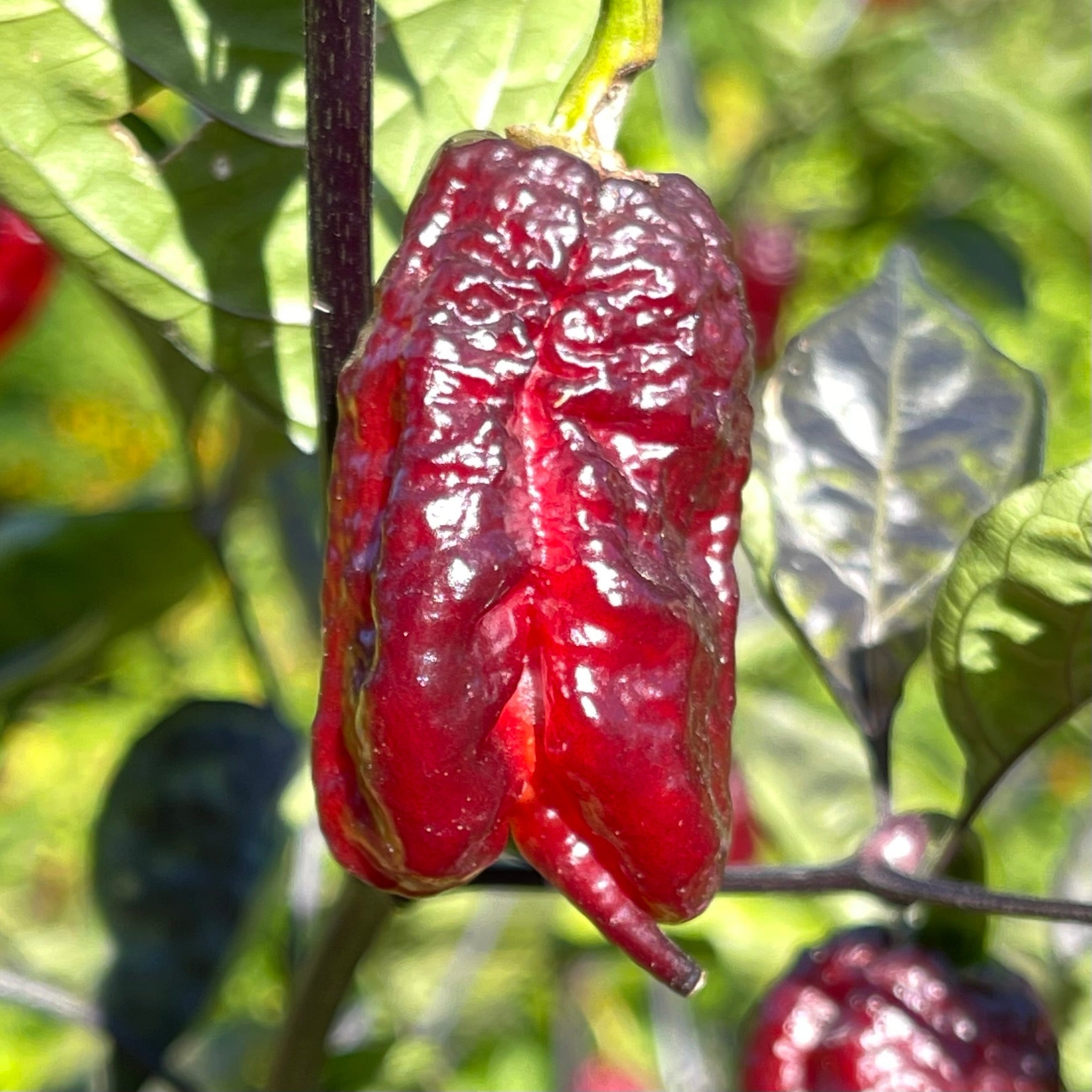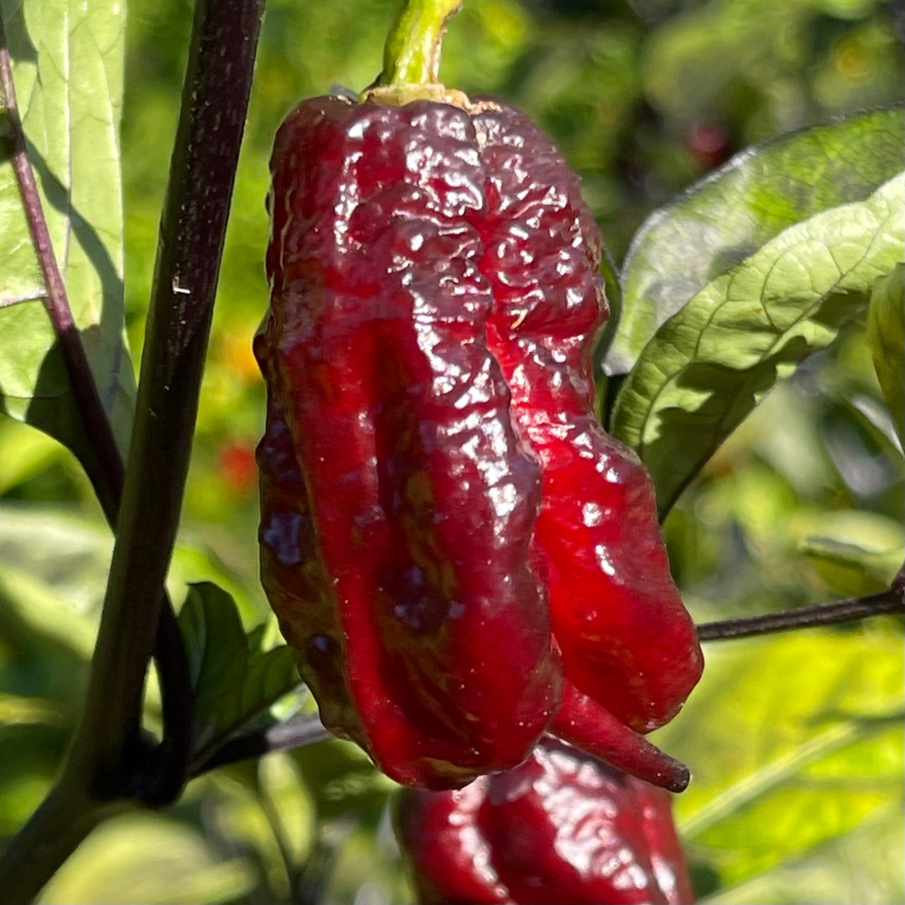 The peppers measure 1.5 to 2 inches long and grow on plants with striking dark foliage that can reach an impressive 4 to 5 feet tall. Their flavor is a bold blend of fruity notes with a hint of smokiness, delivering a fiery heat that’s not for the faint of heart.