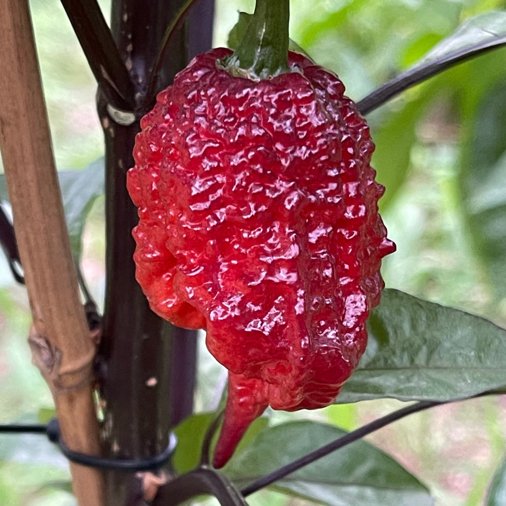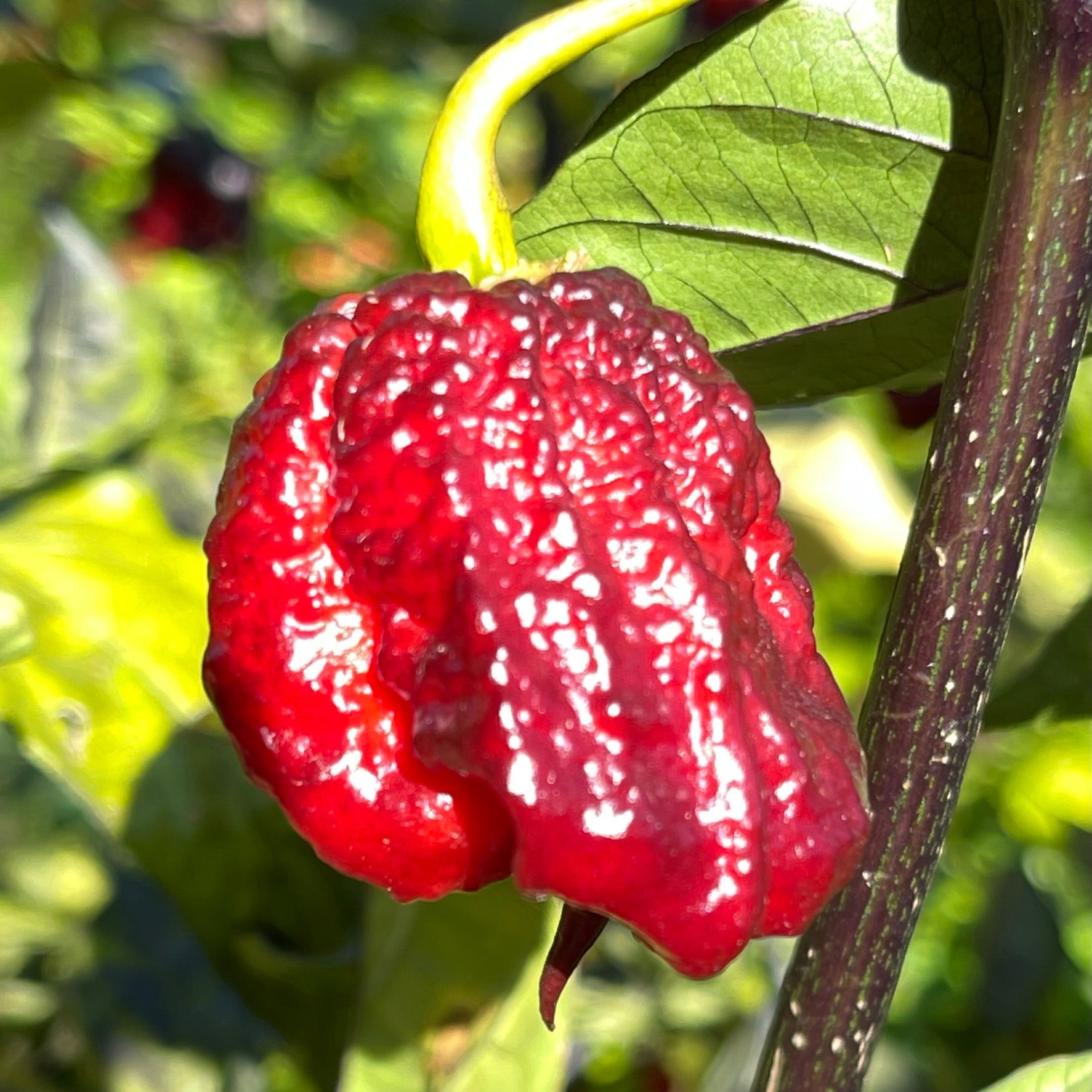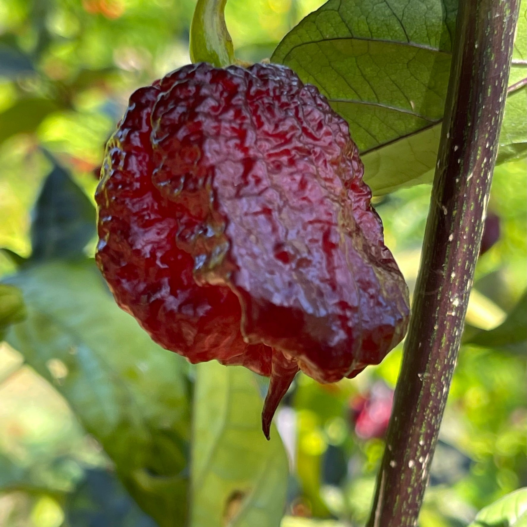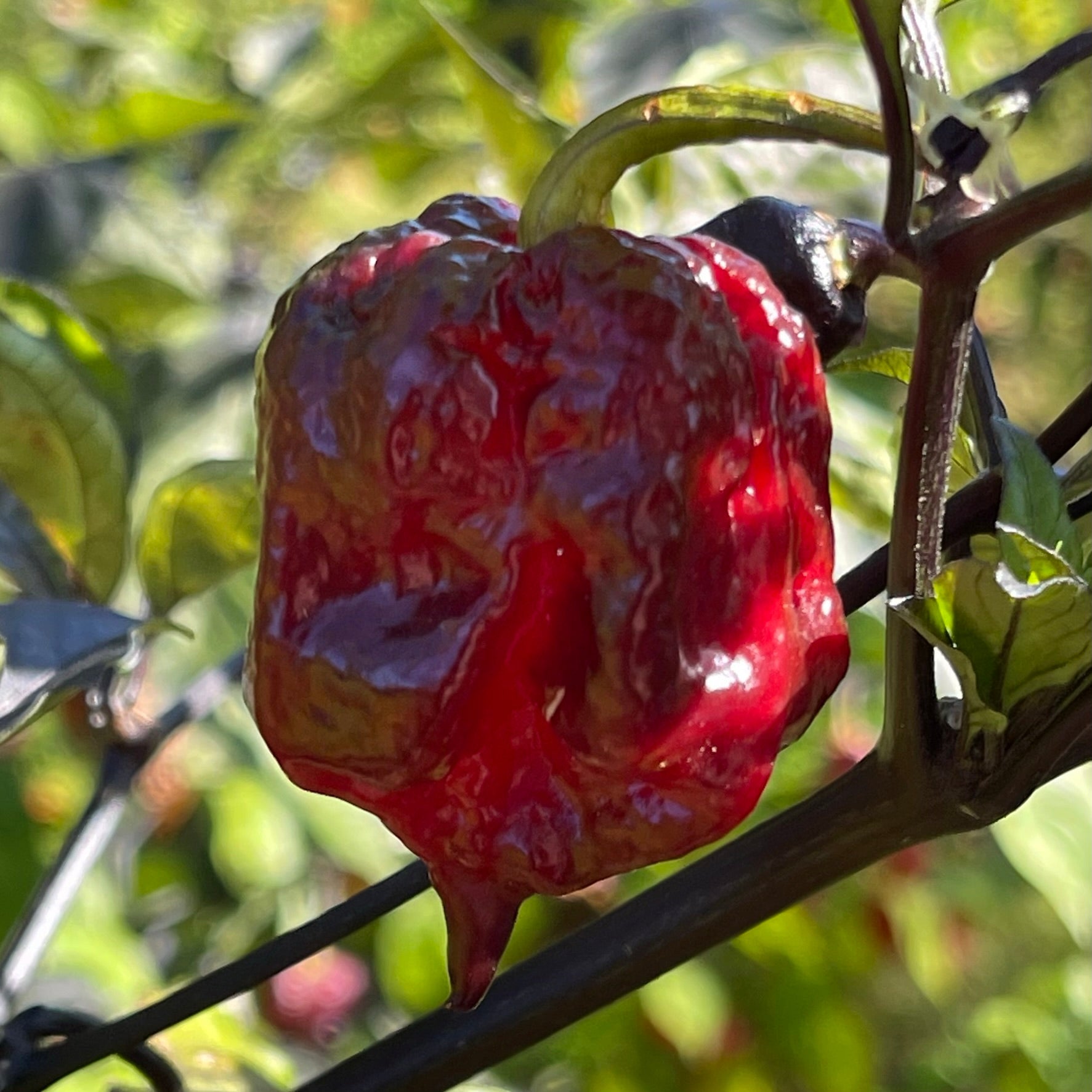 The peppers measure 1.5 to 2 inches long and grow on plants with striking dark foliage that can reach an impressive 4 to 5 feet tall. Their flavor is a bold blend of fruity notes with a hint of smokiness, delivering a fiery heat that’s not for the faint of heart.