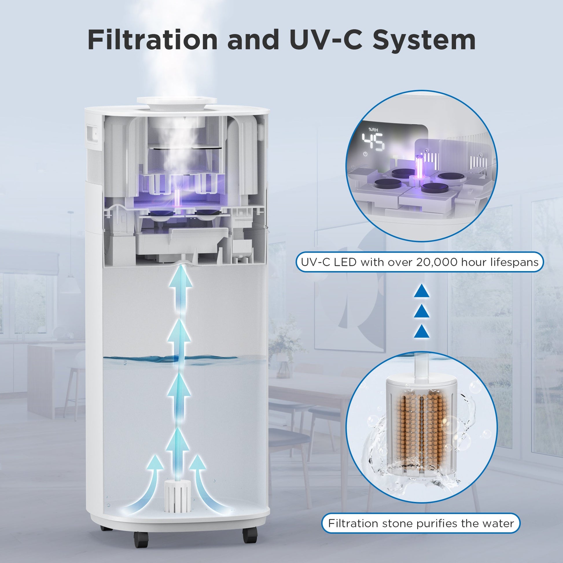 - 💦[Clean And Cool] Before pumping the water and turning it into mist, the filtration stone in the pump helps remove impurities from the water. An added UV-C light function eliminates harmful pollutants from the water to keep the mist clean and fresh.