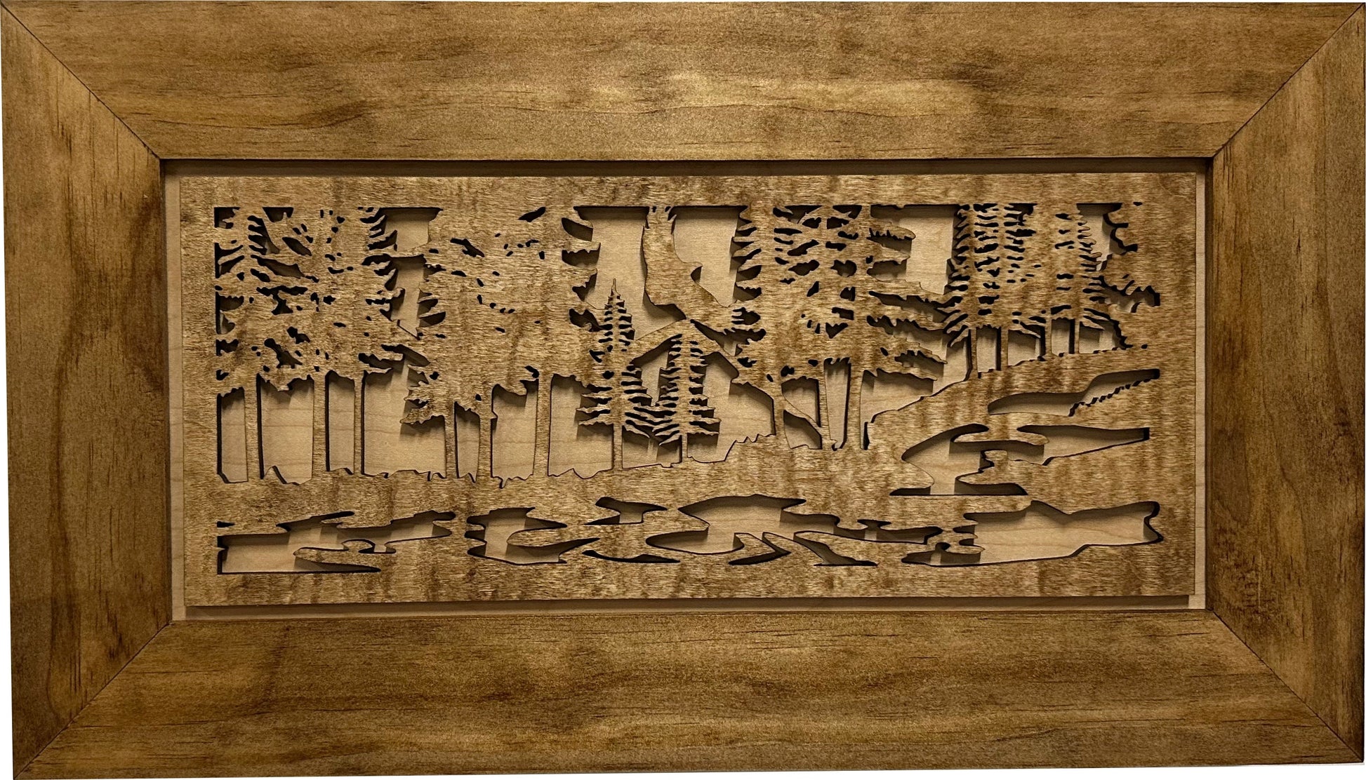 - Wall-Mounted Secured Gun Safe with a three dimensional outdoor nature scene with a stream and eagle flying high above.