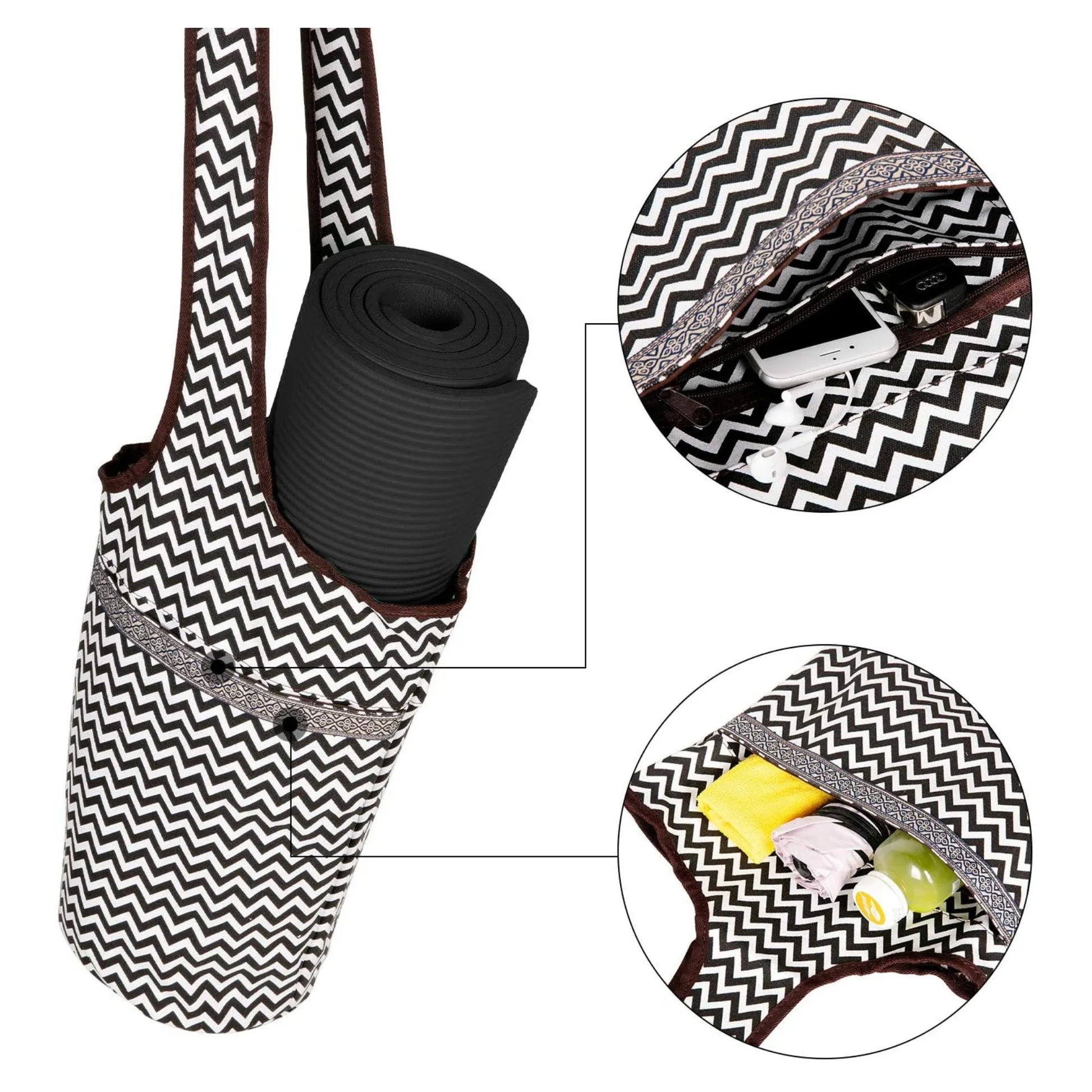 This beautiful and versatile yoga mat bag is made of high-quality cotton canvas materials and features a comfortable shoulder strap. Combined with fine stitching, the bag’s printed embroidery designs add more color and value to this yoga tote bag. With yogis’ genuine needs in mind, this multi-functional and practical yoga bag provides much-needed convenience and is a great way to tote your mat from home to the gym, yoga class, Pilates class, or wherever you go to workout and exercise.